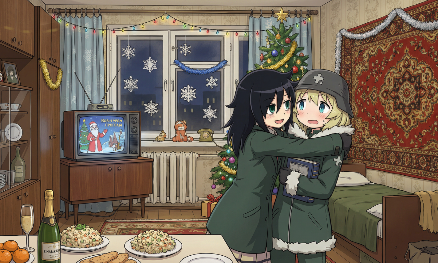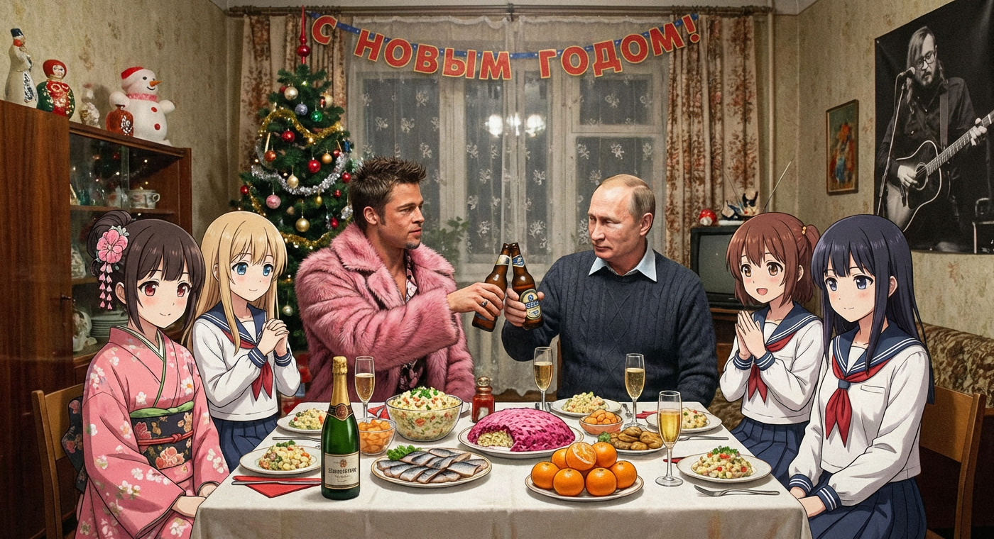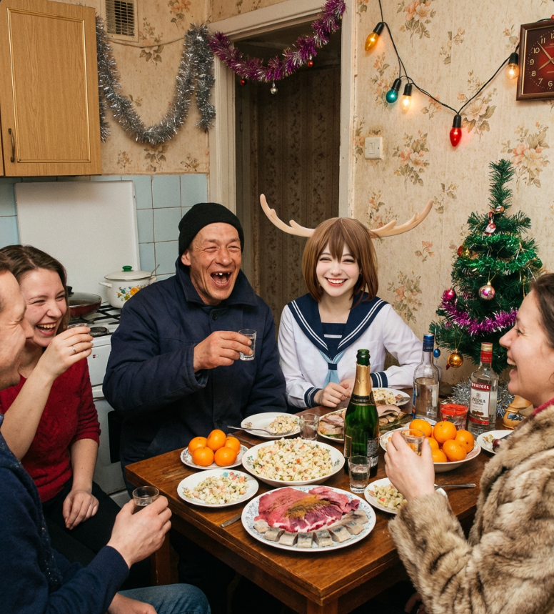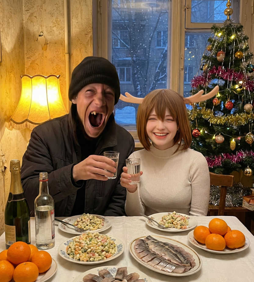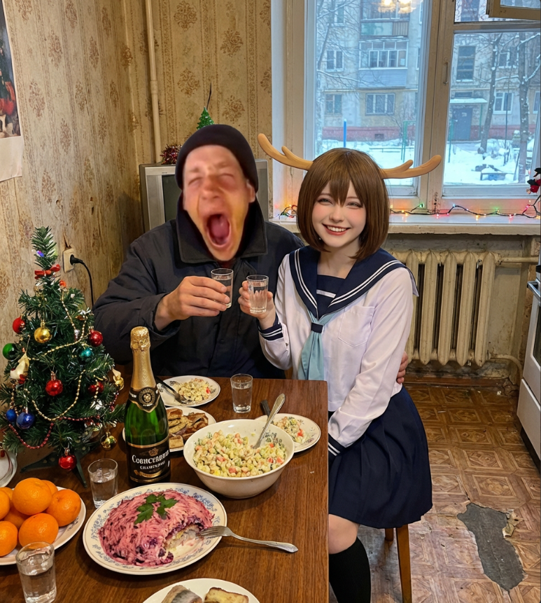 Близняшки-балерины из Atomic Heart с красными новогодними шапками на головах, Yorha 2B в мини-костюме санты, Мита из Мисайд с тарелкой мандаринов в руках и Ева из Stellar Blade сидят за новогодним столом в типичной пост-советской квартире за новогодним столом. На столе множество еды и бутылок с алкоголем. Все кроме Миты держат в руках бокалы с шампанским и смотрят в окно, в окне виден праздничный салют. Все девушки выглядят как реальные люди. Изображение похоже на качественную фотографию со вспышкой.