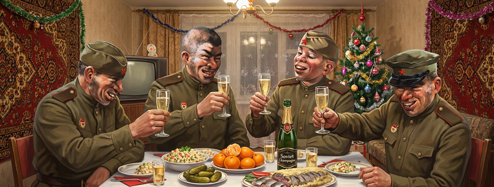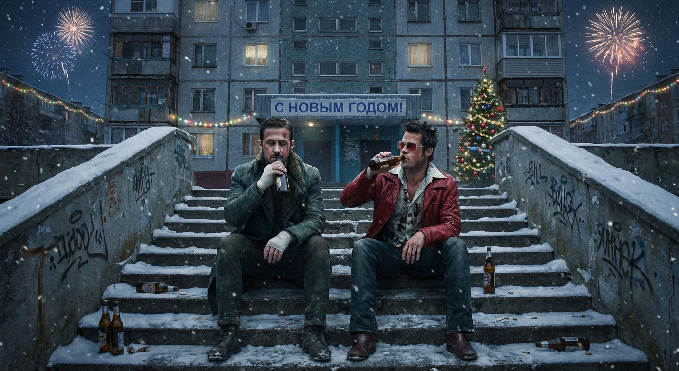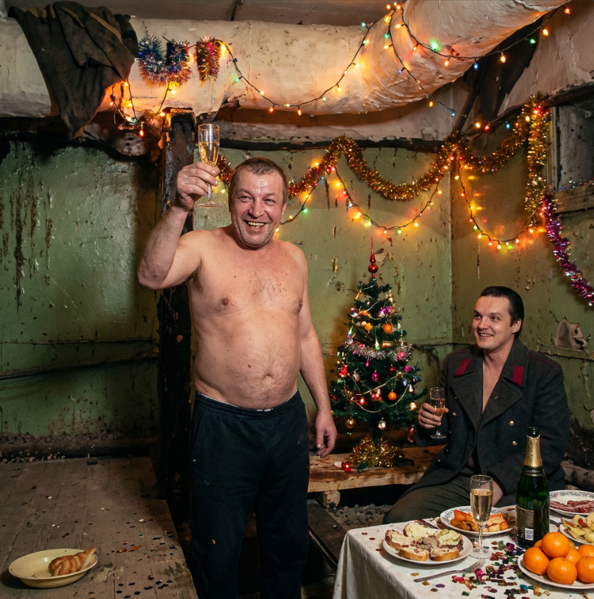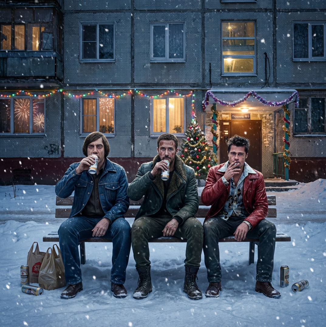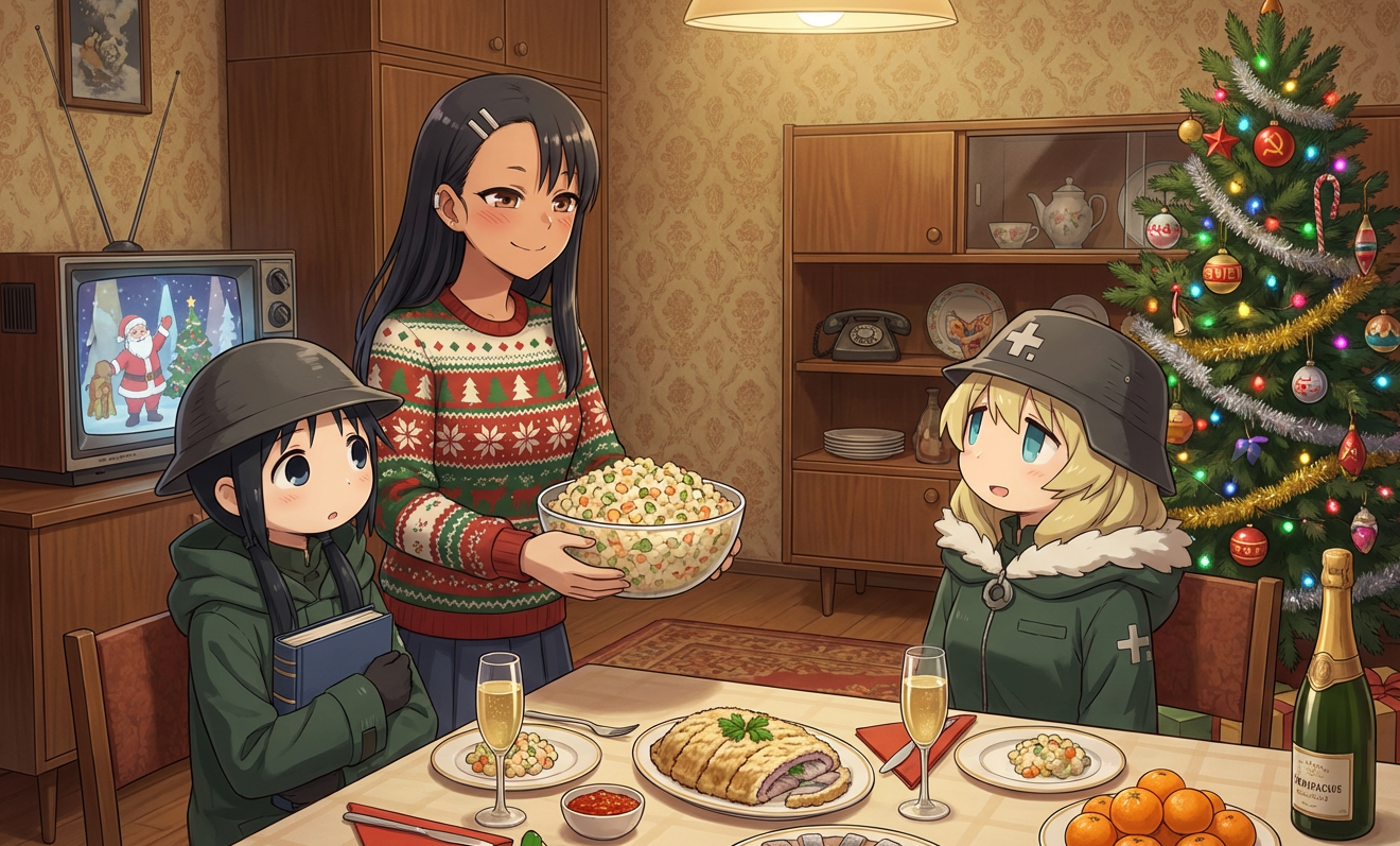 Близняшки-балерины из Atomic Heart с красными новогодними шапками на головах, Yorha 2B в мини-костюме санты, Мита из Мисайд с тарелкой мандаринов в руках и Ева из Stellar Blade сидят за новогодним столом в типичной пост-советской квартире за новогодним столом. На столе множество еды и бутылок с алкоголем. Все кроме Миты держат в руках бокалы с шампанским и смотрят в окно, в окне виден праздничный салют. Все девушки выглядят как реальные люди. Изображение похоже на качественную фотографию со вспышкой.