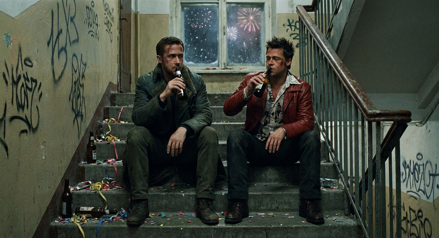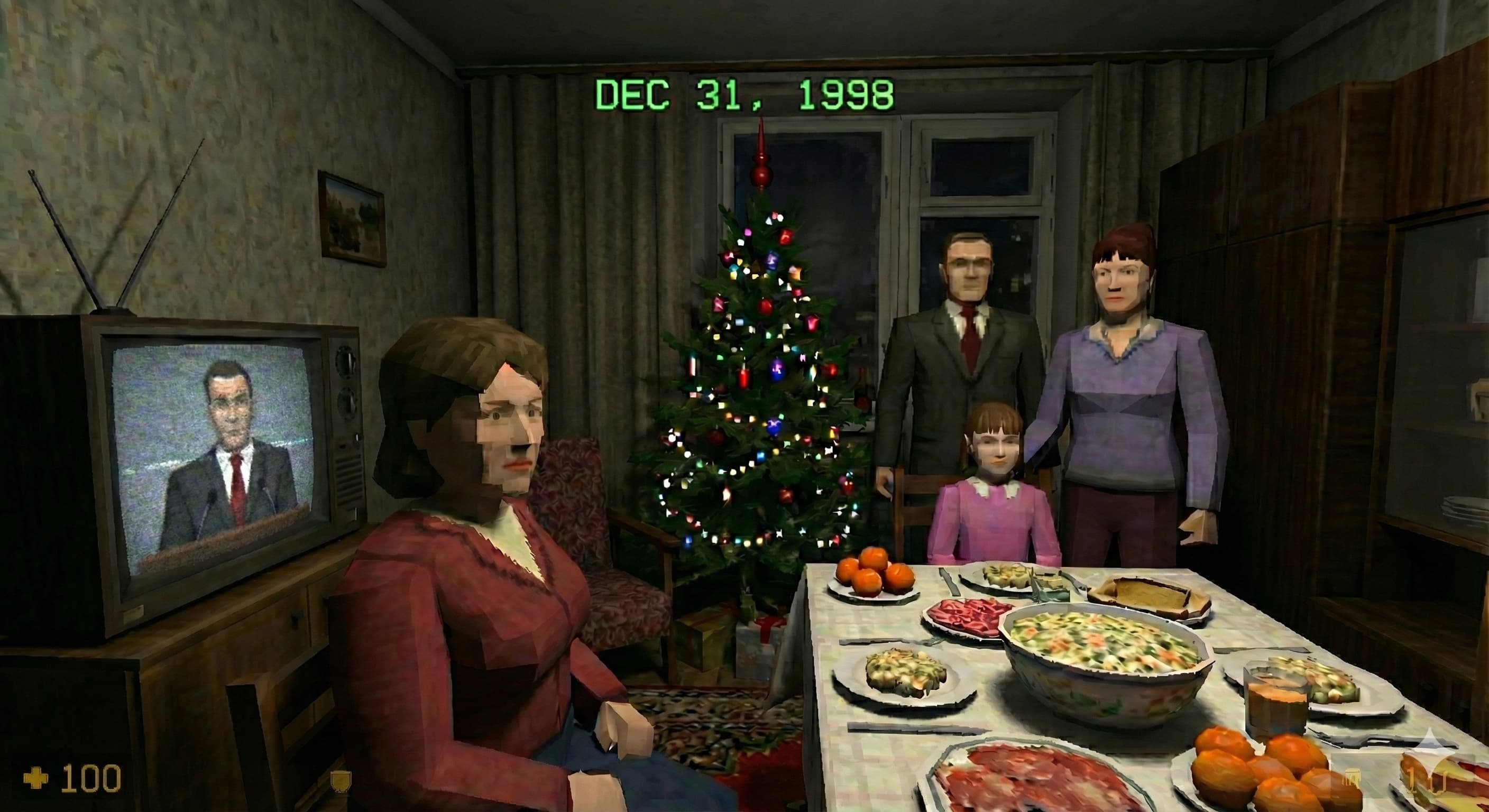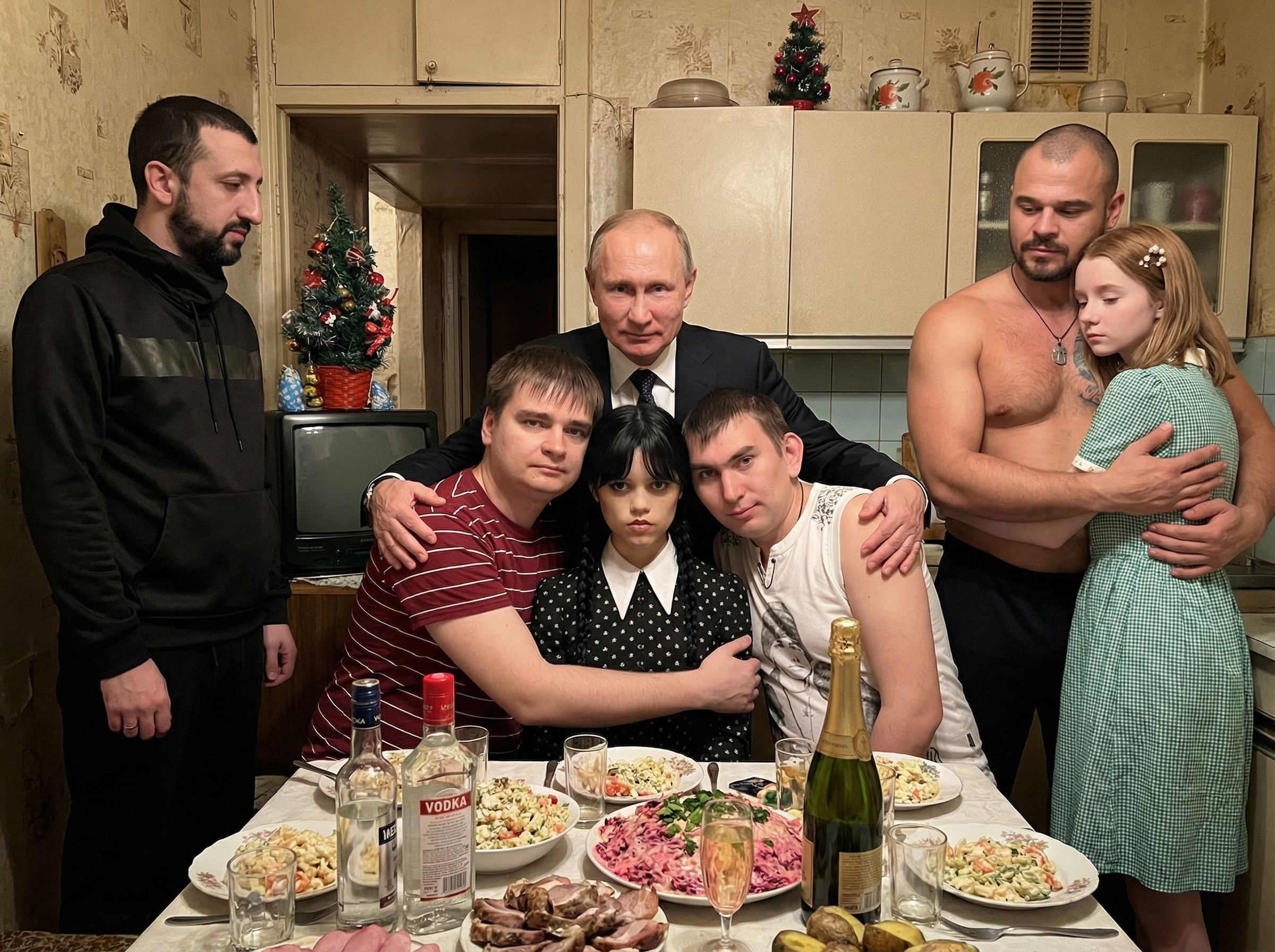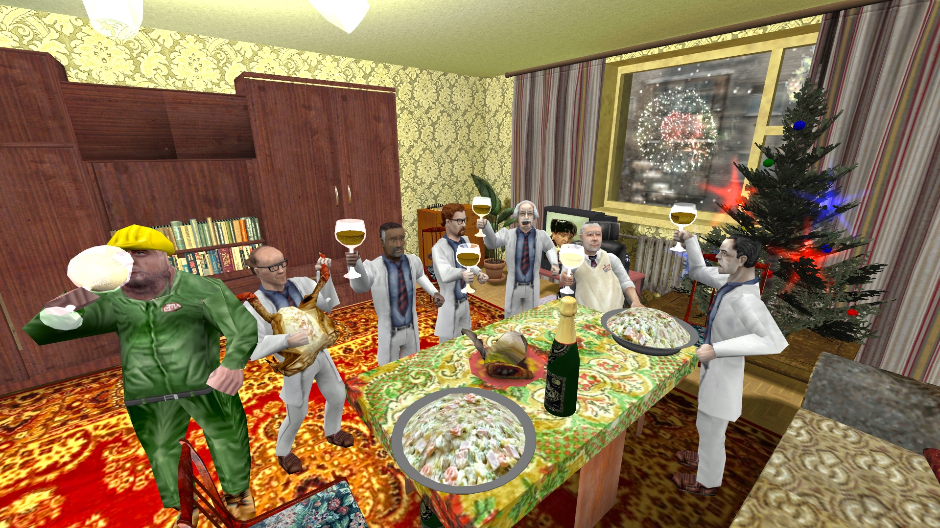 Близняшки-балерины из Atomic Heart с красными новогодними шапками на головах, Yorha 2B в мини-костюме санты, Мита из Мисайд с тарелкой мандаринов в руках и Ева из Stellar Blade сидят за новогодним столом в типичной пост-советской квартире за новогодним столом. На столе множество еды и бутылок с алкоголем. Все кроме Миты держат в руках бокалы с шампанским и смотрят в окно, в окне виден праздничный салют. Все девушки выглядят как реальные люди. Изображение похоже на качественную фотографию со вспышкой.