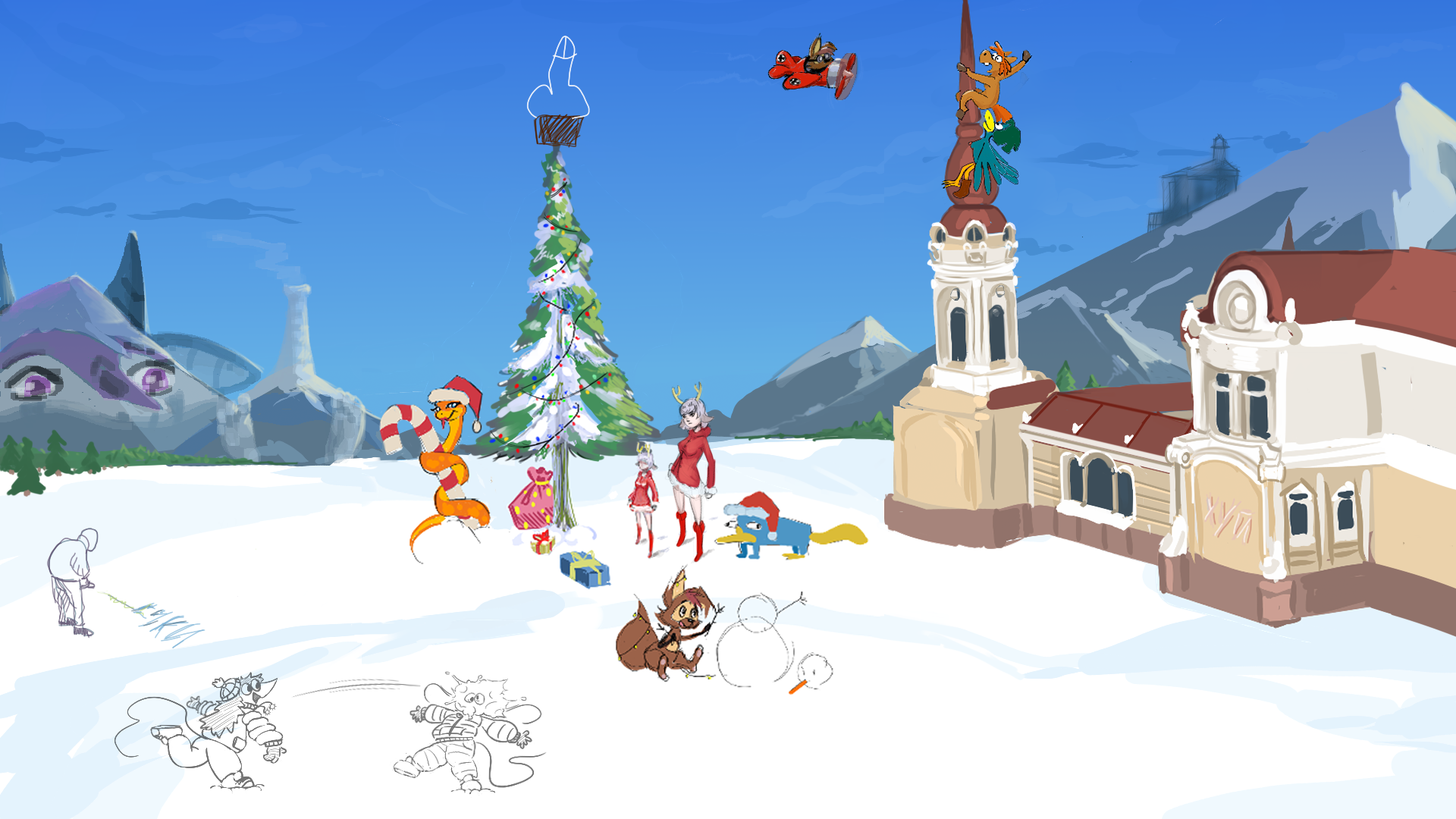 Рыжая бобриха Рыжелина (1) обвитая также рыжей озорной змейкой (2) в дружной праздничной работе. Бобриха с азартом выгрызает из древесины игрушки, а змейка их вешает на ель.