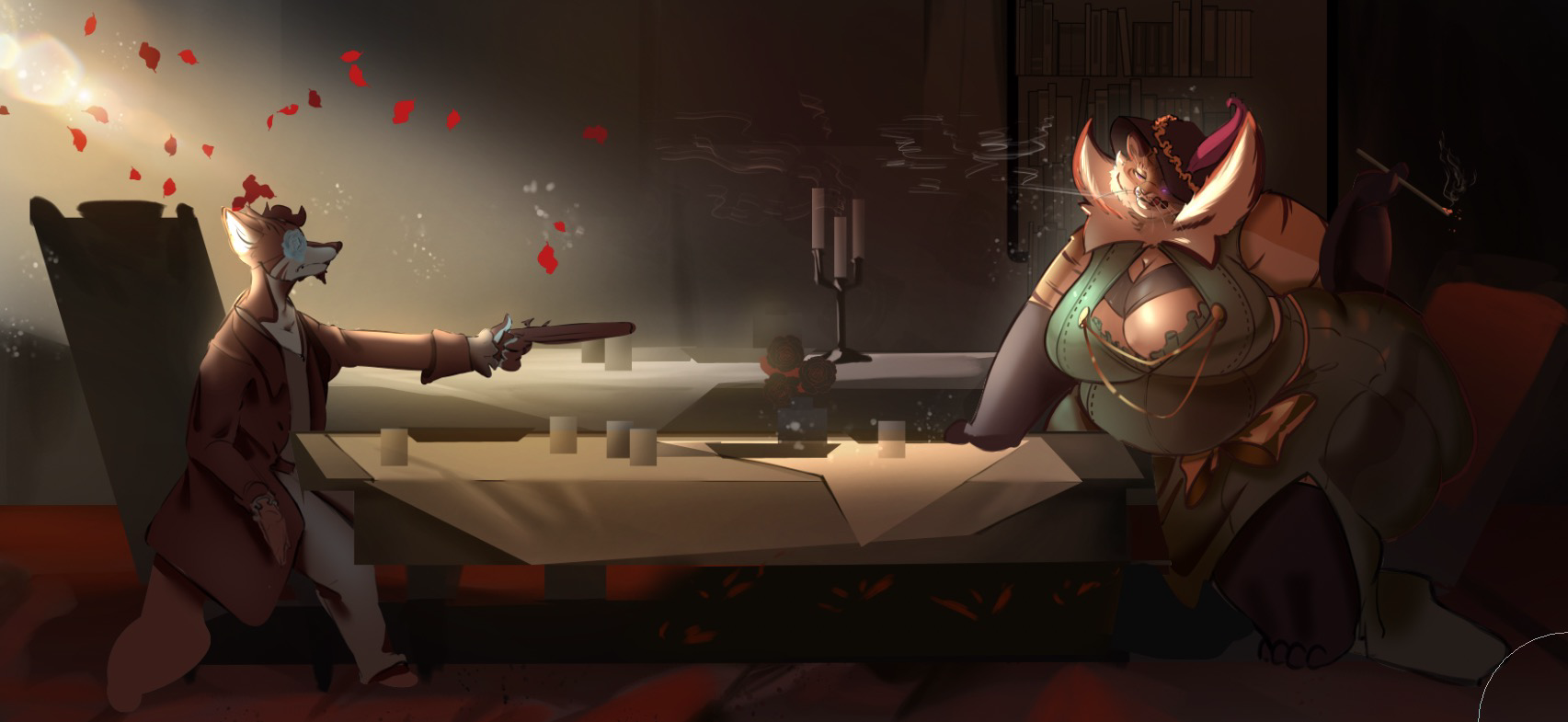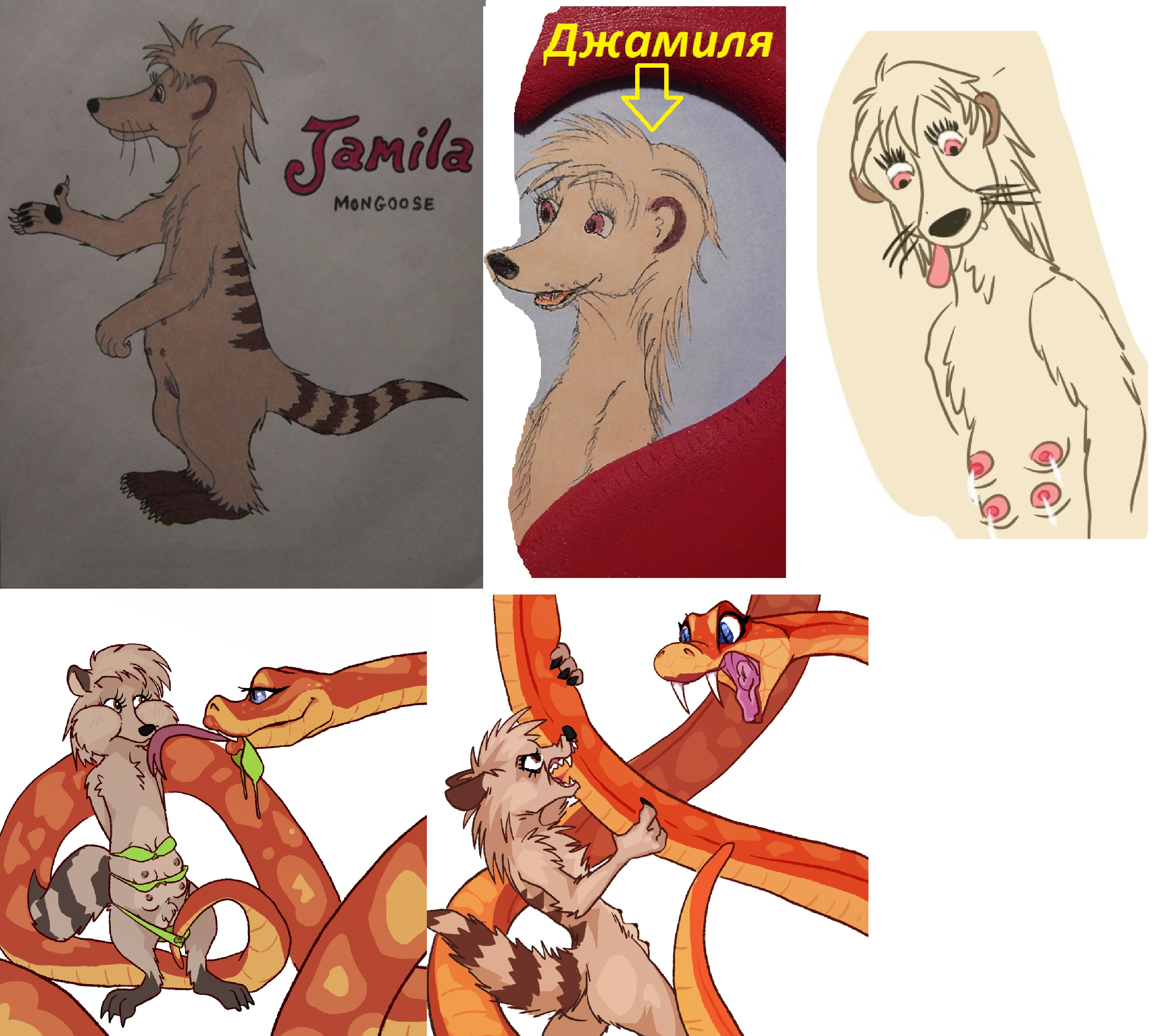 Красная дракониха Варвара (1) в дерзком образе, с чёрным макияжем, пирсингом и шипастым ошейником, вытаскивает из писи иль ануса бежевой мангустихи Джамили (2), прижав другой рукой воришку к стене (дракониха мощнее), сворованное красно-жёлтое яйцо (своё). Джамиле на-деле по кайфу такое отношение, хоть её и разоблачили.