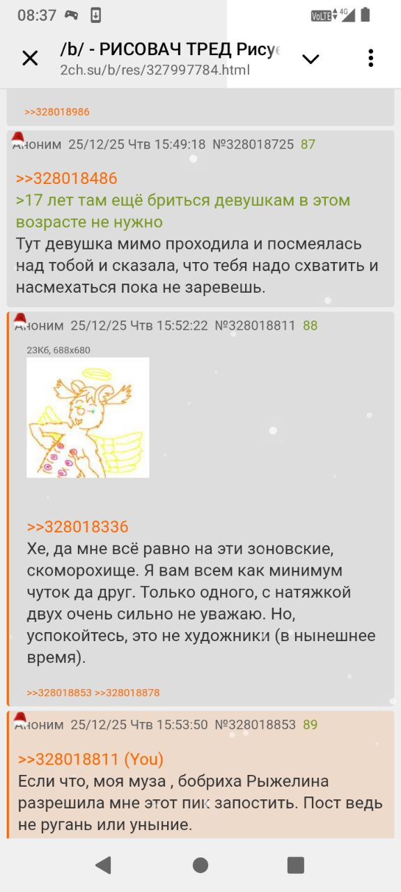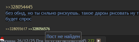 >>328018336 Хе, да мне всё равно на эти зоновские, скоморохище. Я вам всем как минимум чуток да друг. Только одного, с натяжкой двух очень сильно не уважаю. Но, успокойтесь, это не художники (в нынешнее время).