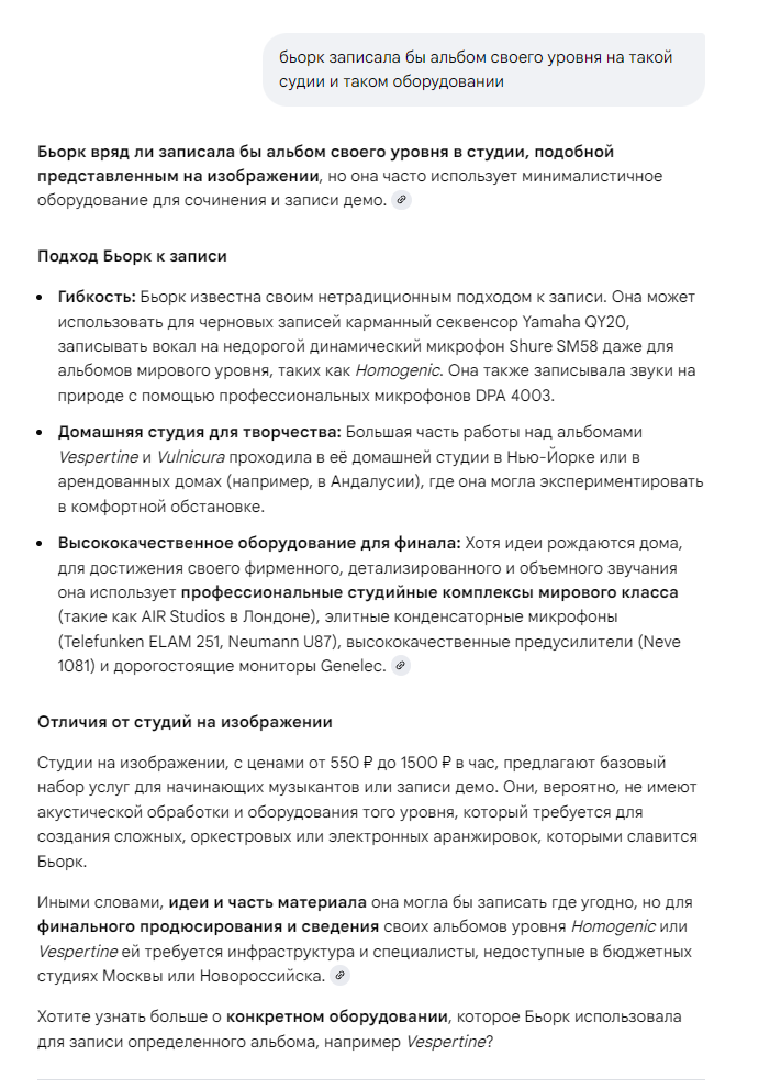 хз насчёт бьорк и соревнования с ней, но вообще с звукообработкой после определенного уровня качество все меньше и меньше зависит от оборудования и дальше идет дрочь на оборудование