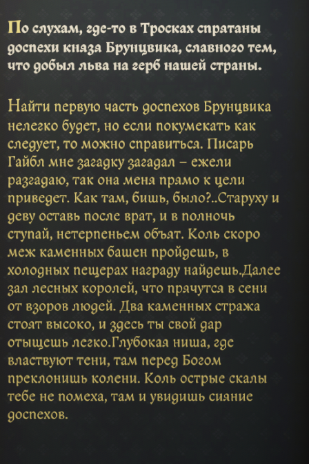 Короче освободился из колодок, Птачек куда-то съебался, ну да и похуй. Я пошёл искать доспехи. Старуха и дева - названия башен Троски. Полночь? Север. В общем, я поебашил