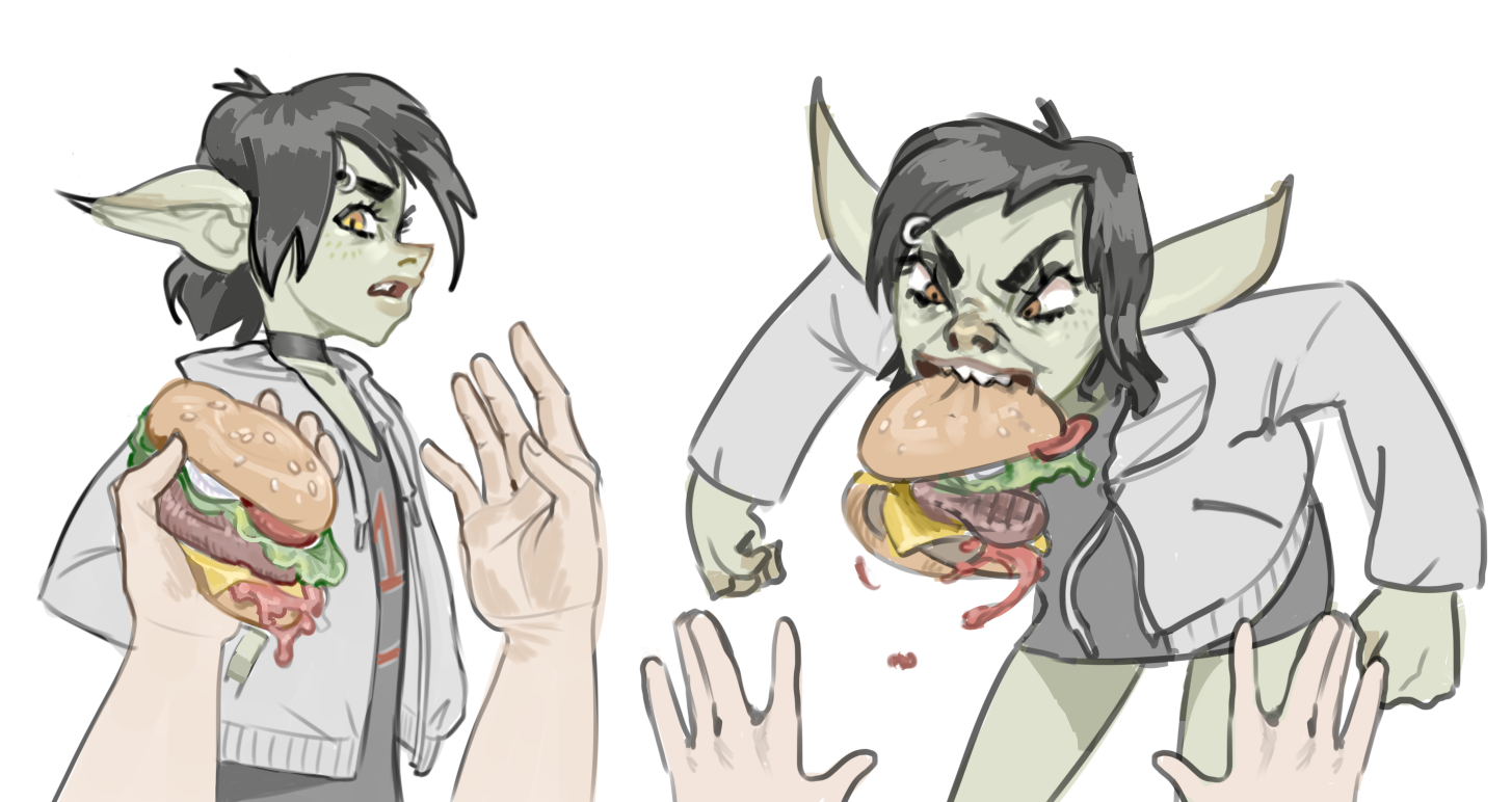 >>328646247 (OP) Реквест Нарисуйте как анон пытался покормить гоблиншу чизбургером с рук, но в итоге все его руки в следах от укусов и когтей а гоблинша раздраженная сама ест сидя рядом с ним.
