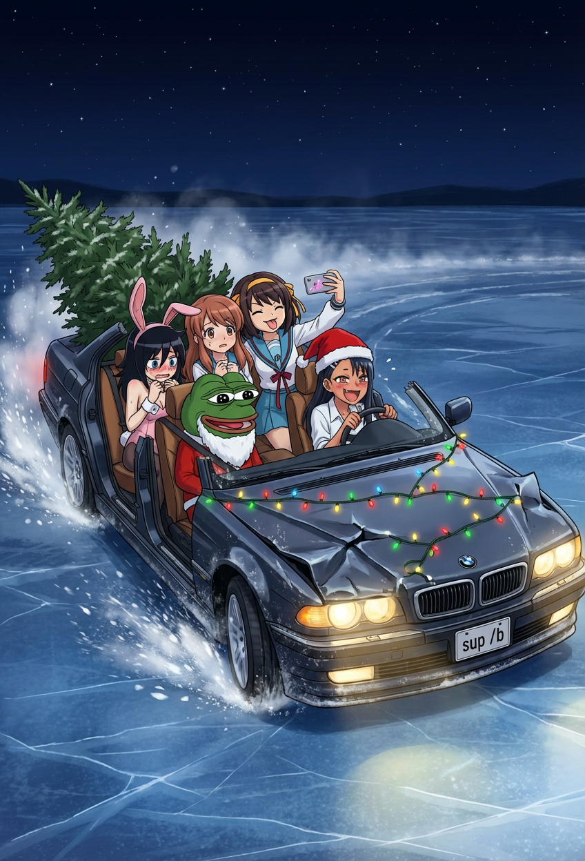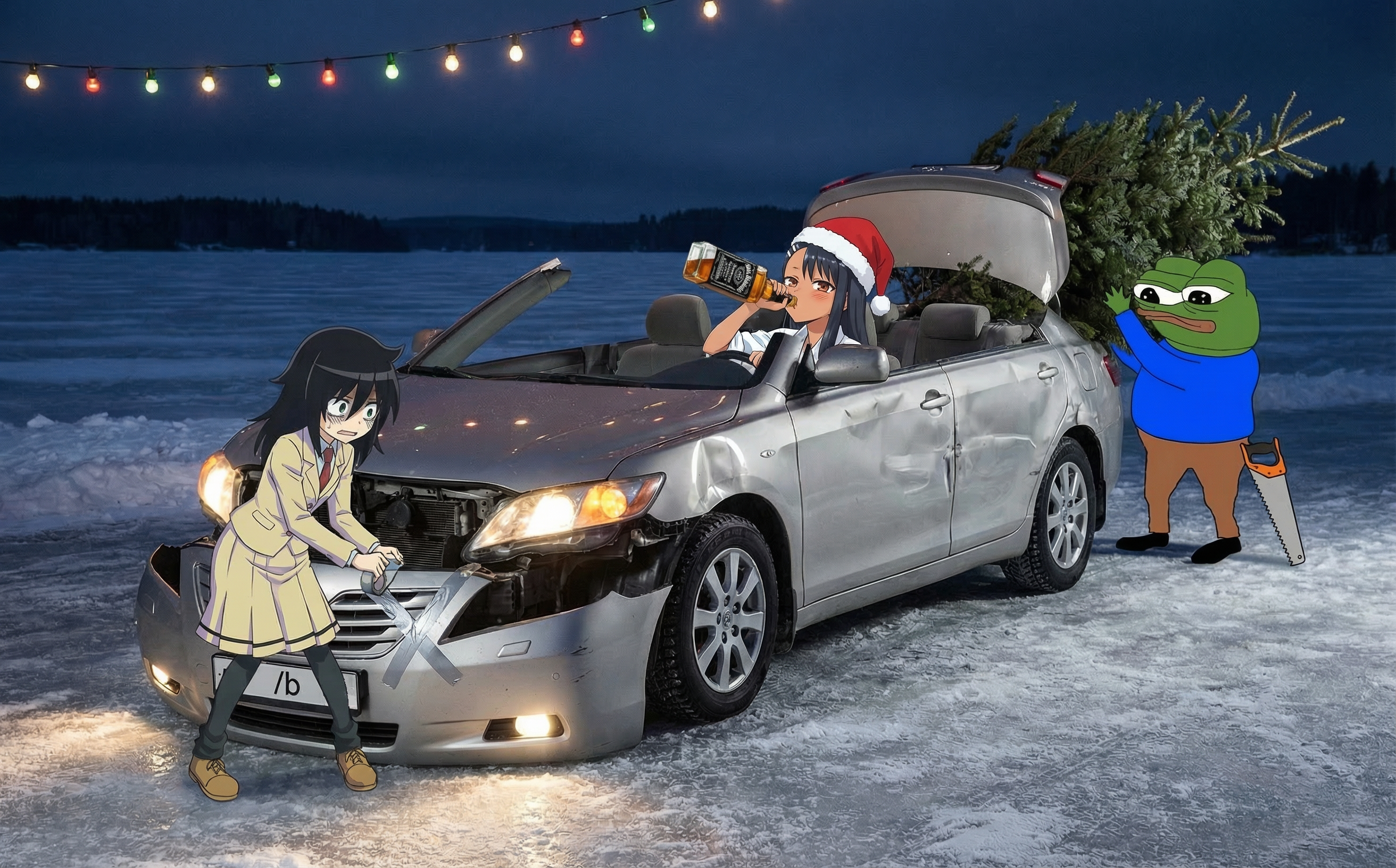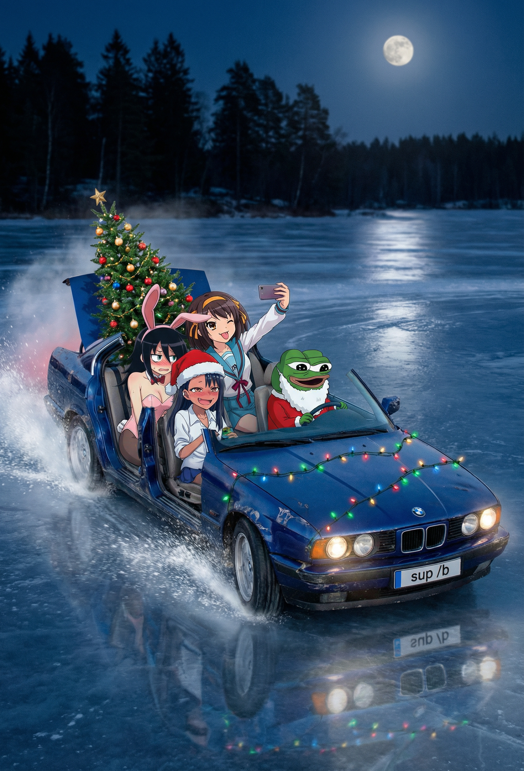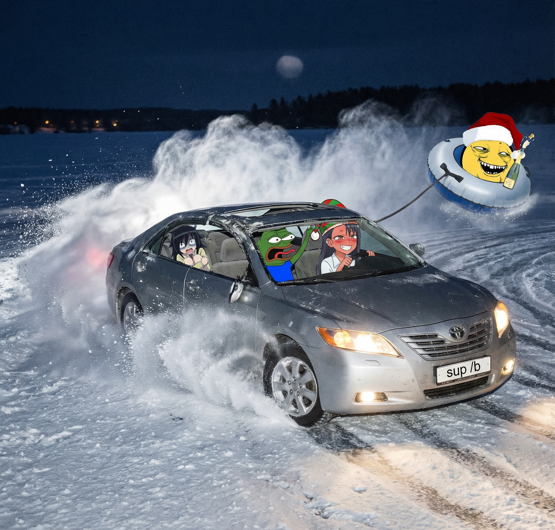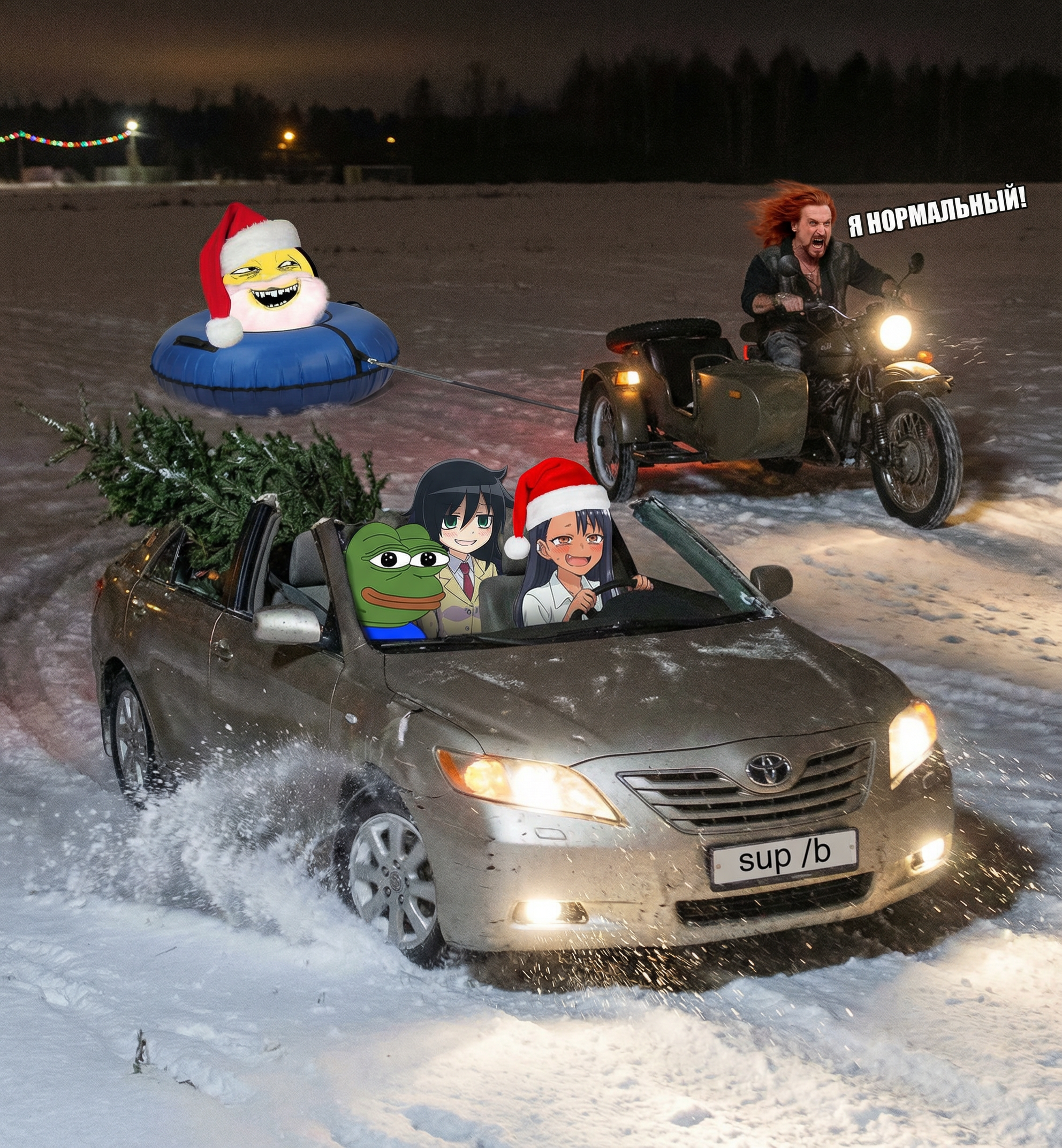 вторая Нагаторо, Томоко Куроки и лягушонок Пепе быстро едут ночью на машине Toyota Camry по полю. Из-под передних колес машины сильно вылетает снег как от пробуксовки. Машина как на загруженной картинке. Машина сильно помятая с полностью отпиленной крышей. Из багажника машины торчит елка. На номере машины надпись sup /b За рулем сидит сильно пьяная Нагаторо, рядом на сиденье сидит Пепе. Нагаторо в новогодней шапке колпаке. Томоко сидит на заднем сиденье. Пепе и Томоко улыбаются. К машине сзади привязана на трос ватрушка тюбинг. Машина тащит тюбинг за собой. В тюбинге находится желтый персонаж как на загруженной картинке. За машиной быстро едет Никита Джигурда на мотоцикле Урал с коляской и кричит "я нормальный!". Рыжие волосы Никиты развеваются на ветру.