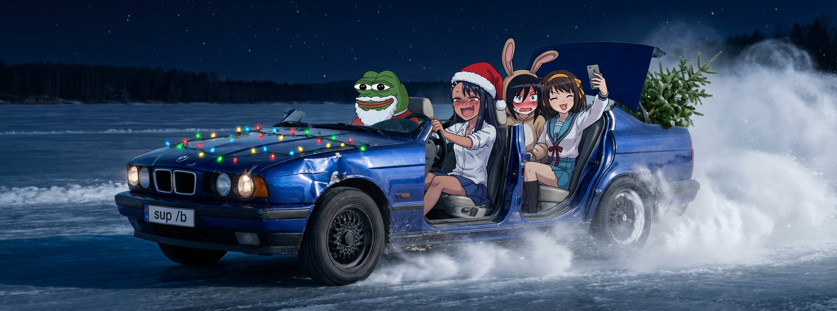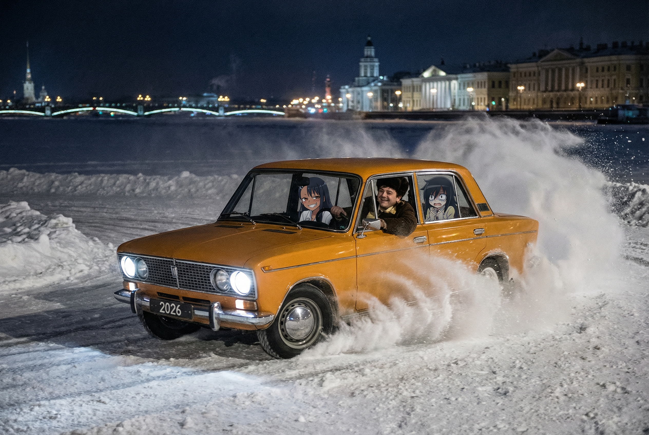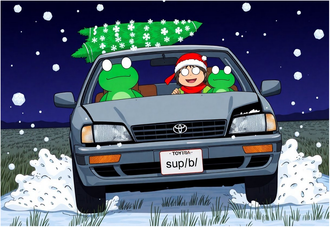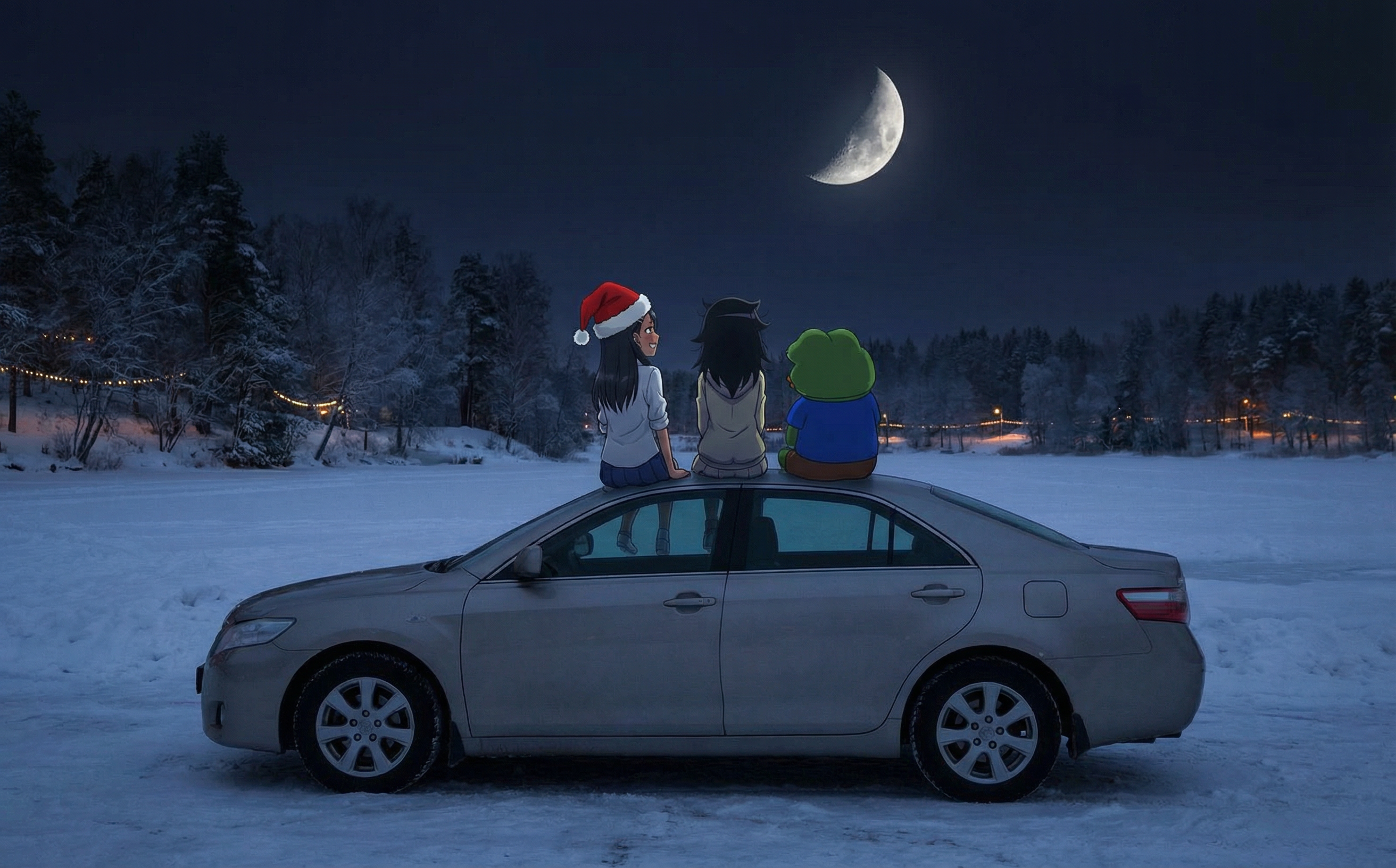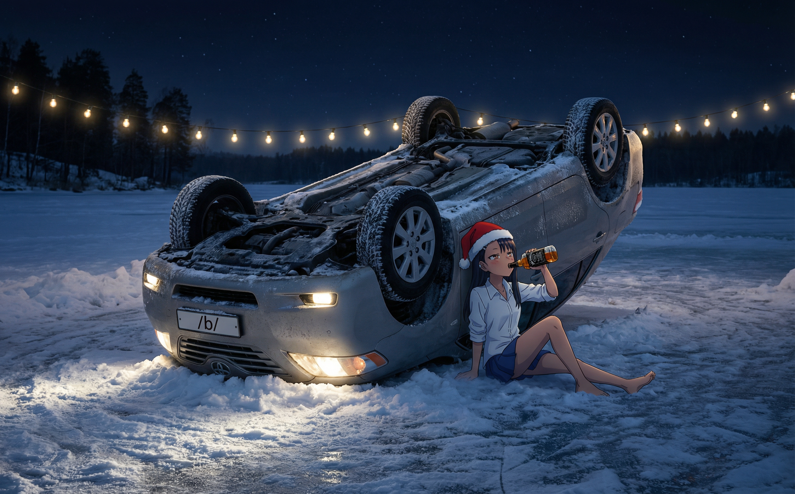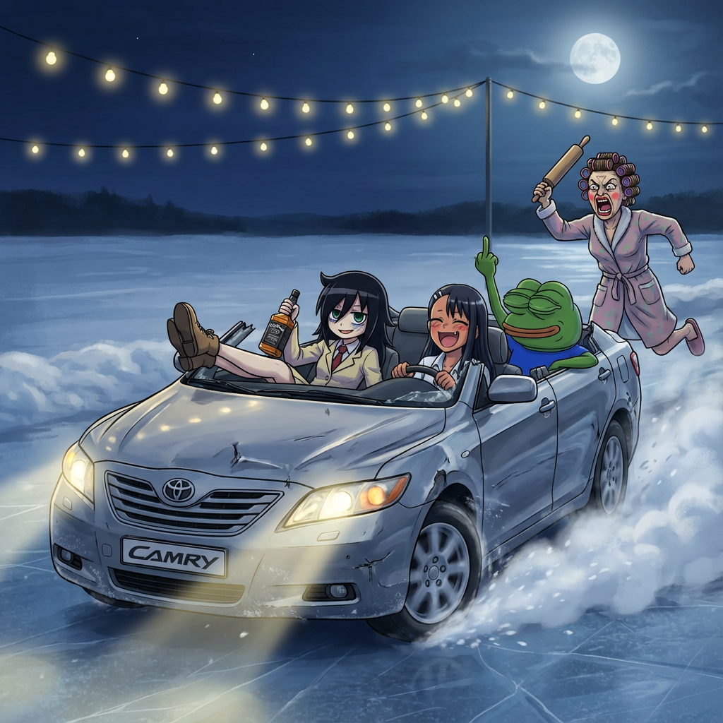 вторая Нагаторо, Томоко Куроки и лягушонок Пепе быстро едут ночью на машине Toyota Camry по полю. Из-под передних колес машины сильно вылетает снег как от пробуксовки. Машина как на загруженной картинке. Машина сильно помятая с полностью отпиленной крышей. Из багажника машины торчит елка. На номере машины надпись sup /b За рулем сидит сильно пьяная Нагаторо, рядом на сиденье сидит Пепе. Нагаторо в новогодней шапке колпаке. Томоко сидит на заднем сиденье. Пепе и Томоко улыбаются. К машине сзади привязана на трос ватрушка тюбинг. Машина тащит тюбинг за собой. В тюбинге находится желтый персонаж как на загруженной картинке. За машиной быстро едет Никита Джигурда на мотоцикле Урал с коляской и кричит "я нормальный!". Рыжие волосы Никиты развеваются на ветру.