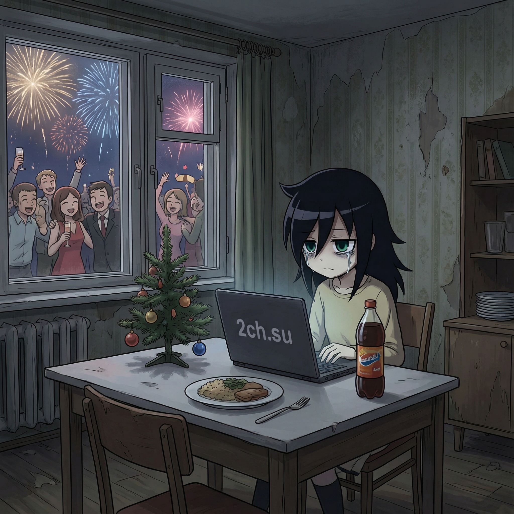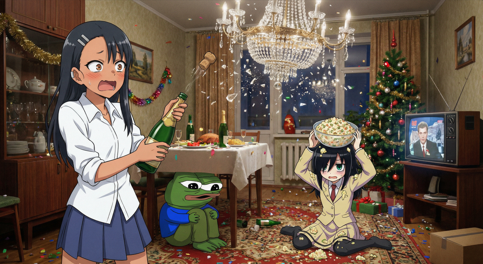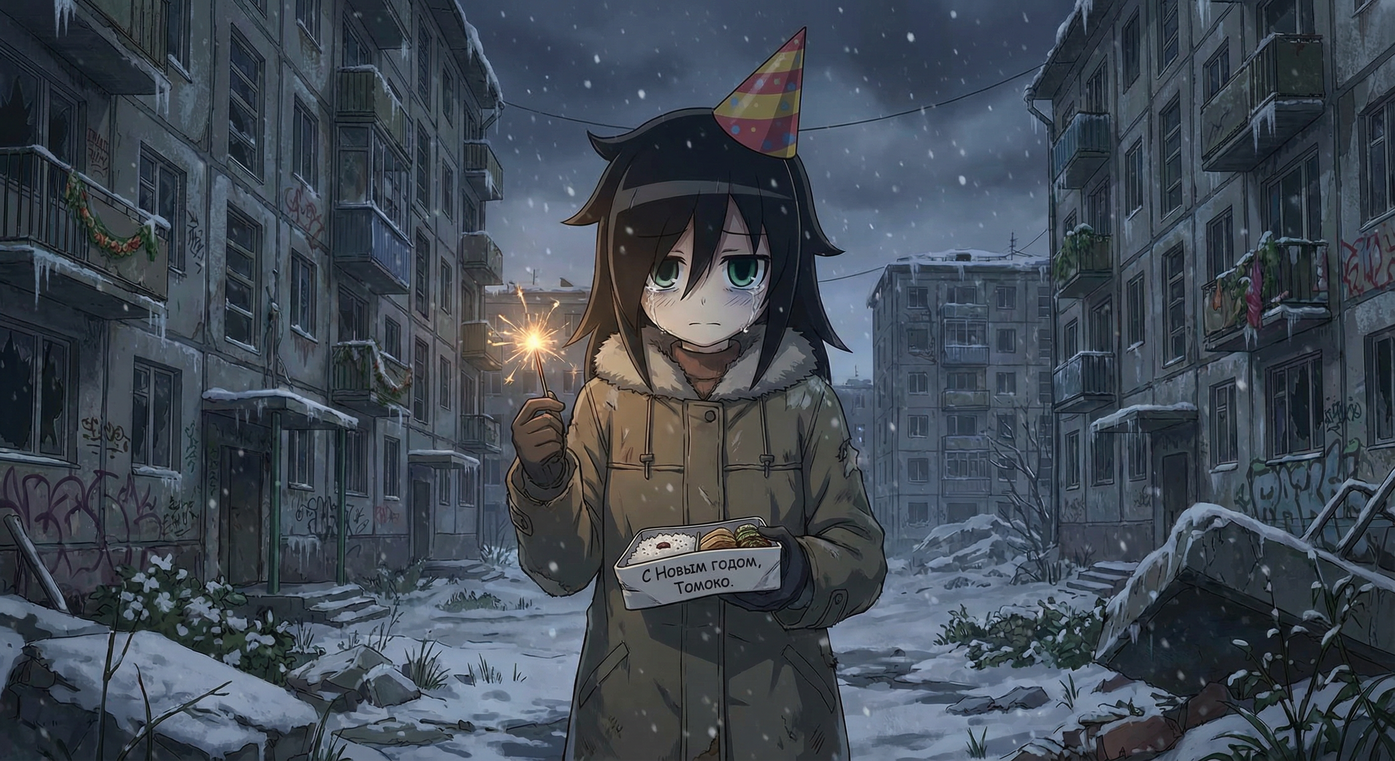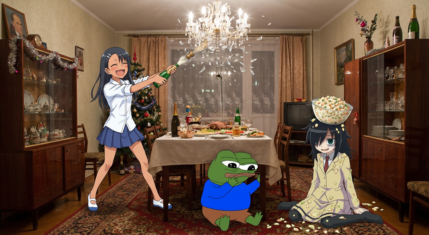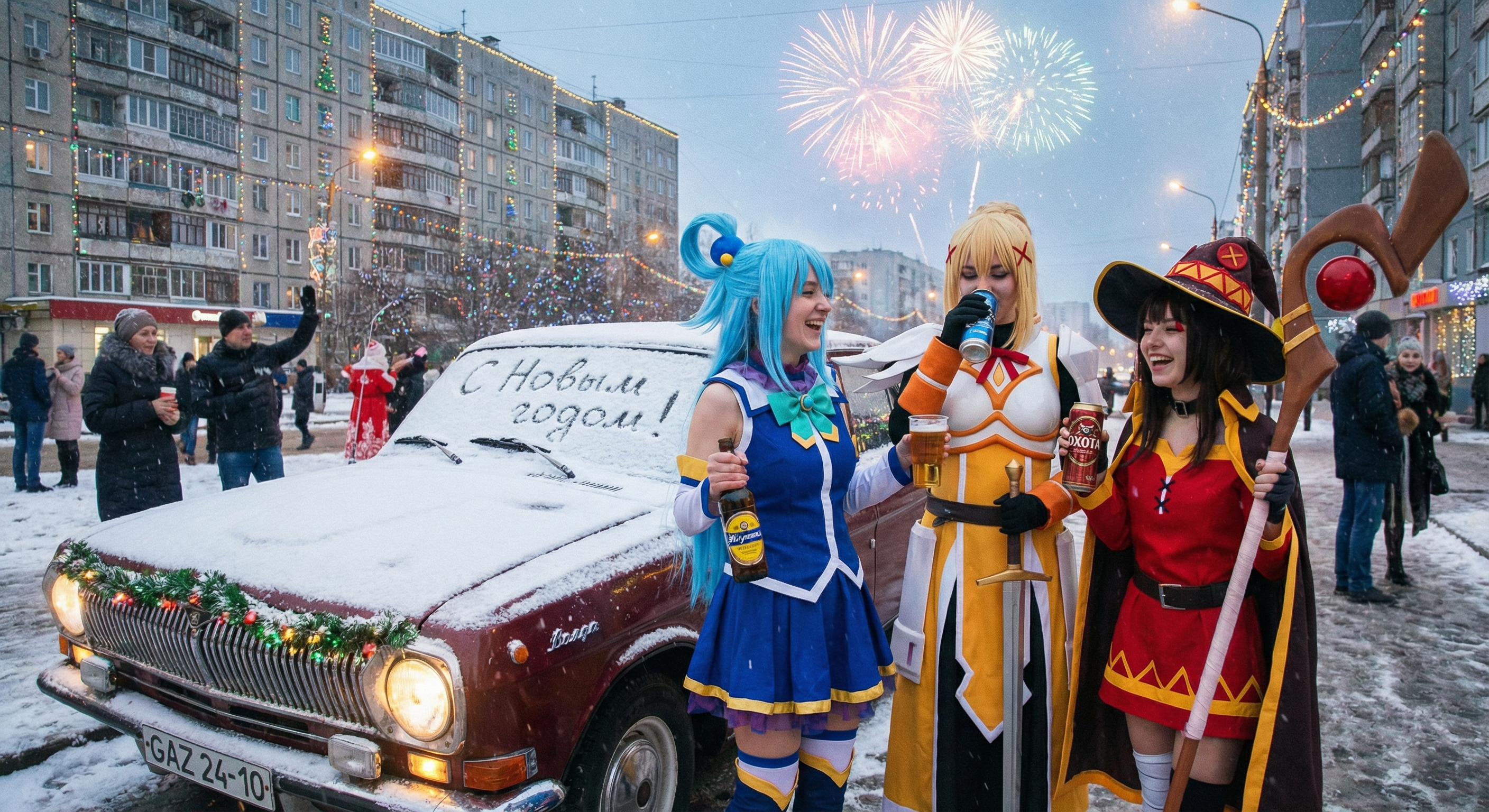 вторая Нагаторо, Томоко Куроки и лягушонок Пепе быстро едут ночью на машине Toyota Camry по полю. Из-под передних колес машины сильно вылетает снег как от пробуксовки. Машина как на загруженной картинке. Машина сильно помятая с полностью отпиленной крышей. Из багажника машины торчит елка. На номере машины надпись sup /b За рулем сидит сильно пьяная Нагаторо, рядом на сиденье сидит Пепе. Нагаторо в новогодней шапке колпаке. Томоко сидит на заднем сиденье. Пепе и Томоко улыбаются. К машине сзади привязана на трос ватрушка тюбинг. Машина тащит тюбинг за собой. В тюбинге находится желтый персонаж как на загруженной картинке. За машиной быстро едет Никита Джигурда на мотоцикле Урал с коляской и кричит "я нормальный!". Рыжие волосы Никиты развеваются на ветру.