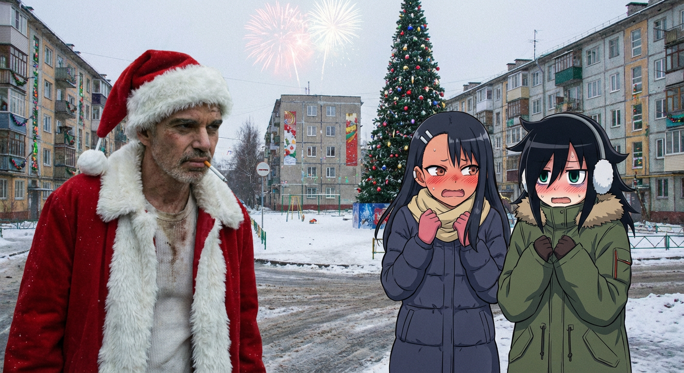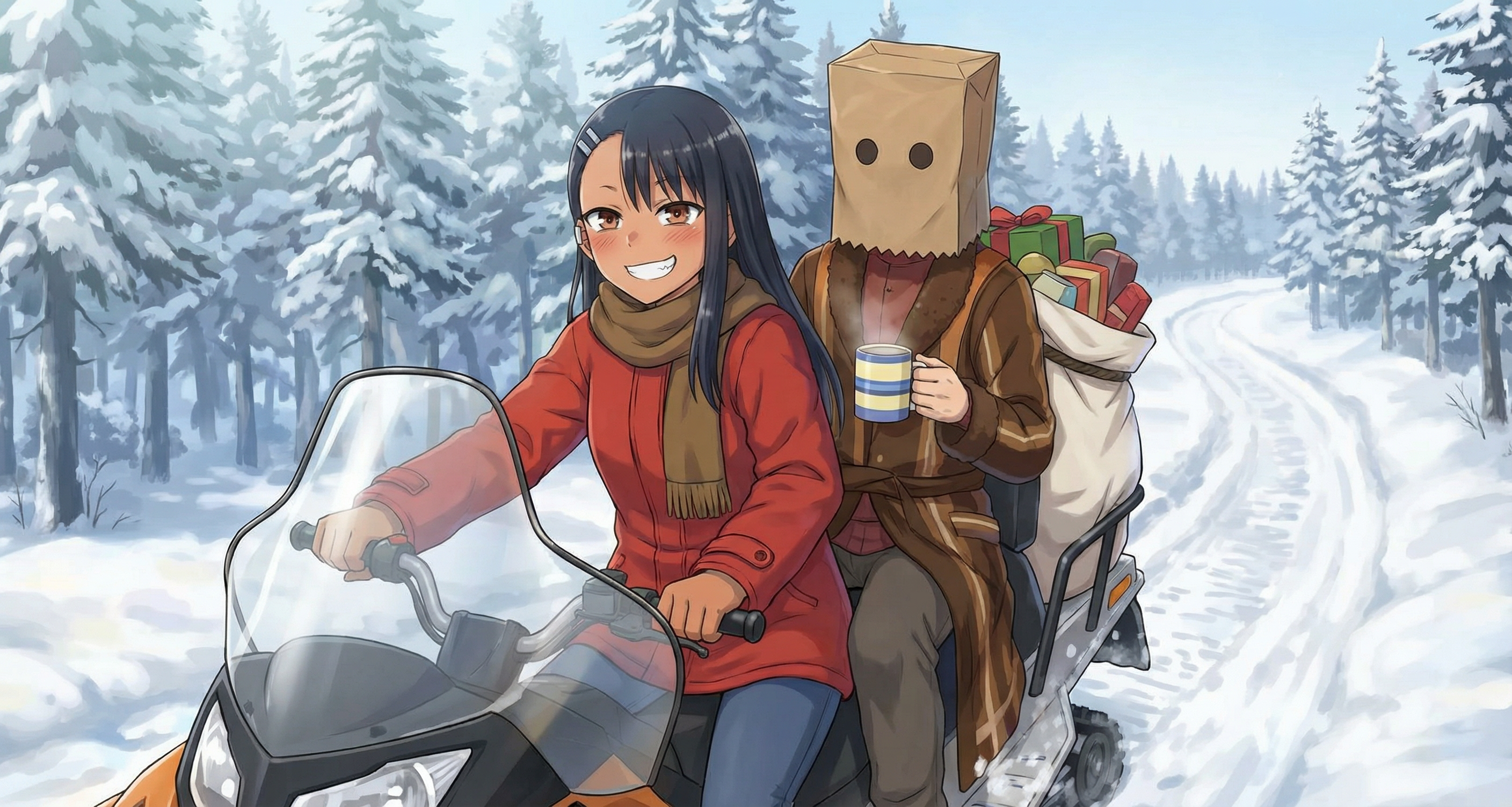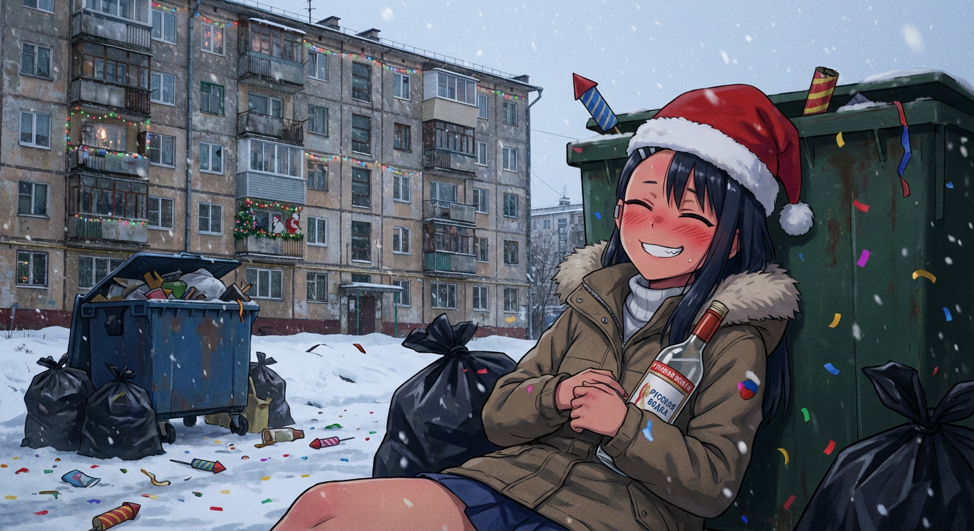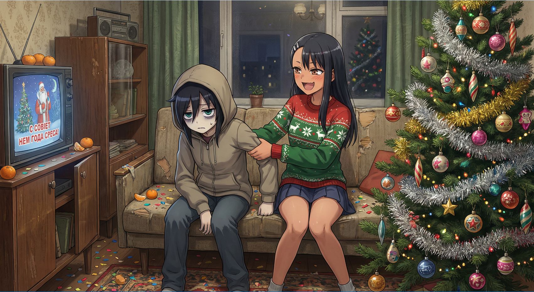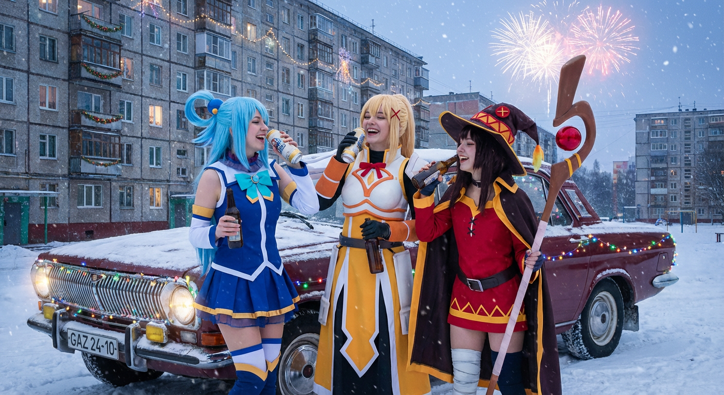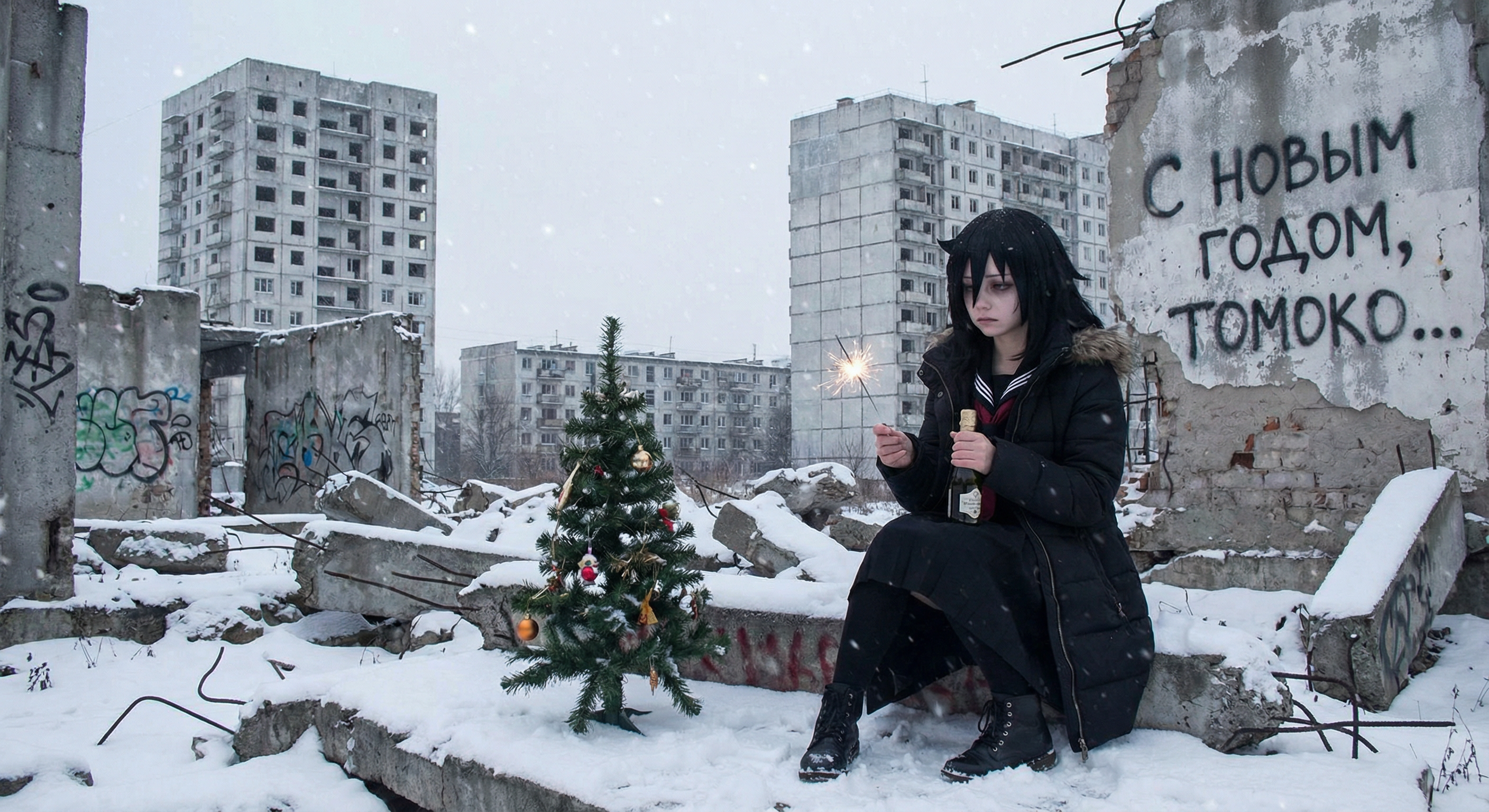 вторая Нагаторо, Томоко Куроки и лягушонок Пепе быстро едут ночью на машине Toyota Camry по полю. Из-под передних колес машины сильно вылетает снег как от пробуксовки. Машина как на загруженной картинке. Машина сильно помятая с полностью отпиленной крышей. Из багажника машины торчит елка. На номере машины надпись sup /b За рулем сидит сильно пьяная Нагаторо, рядом на сиденье сидит Пепе. Нагаторо в новогодней шапке колпаке. Томоко сидит на заднем сиденье. Пепе и Томоко улыбаются. К машине сзади привязана на трос ватрушка тюбинг. Машина тащит тюбинг за собой. В тюбинге находится желтый персонаж как на загруженной картинке. За машиной быстро едет Никита Джигурда на мотоцикле Урал с коляской и кричит "я нормальный!". Рыжие волосы Никиты развеваются на ветру.