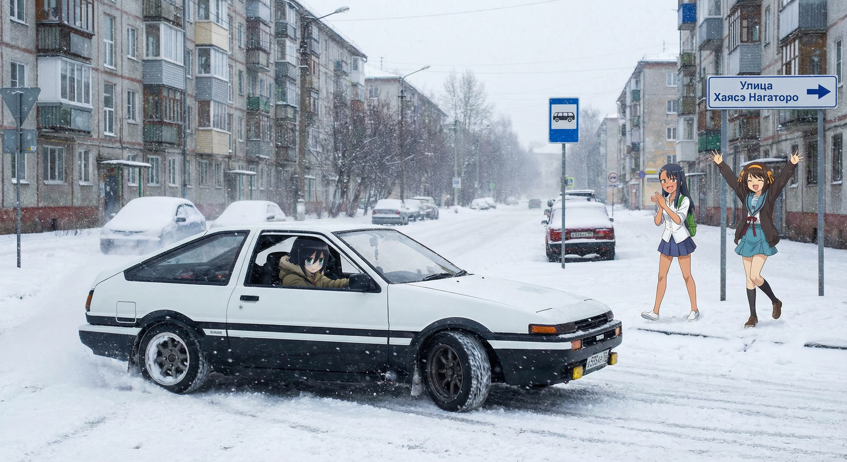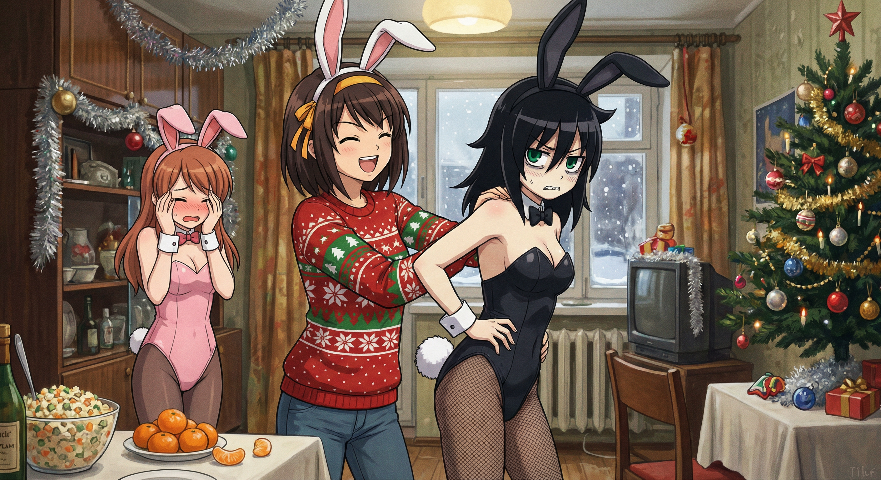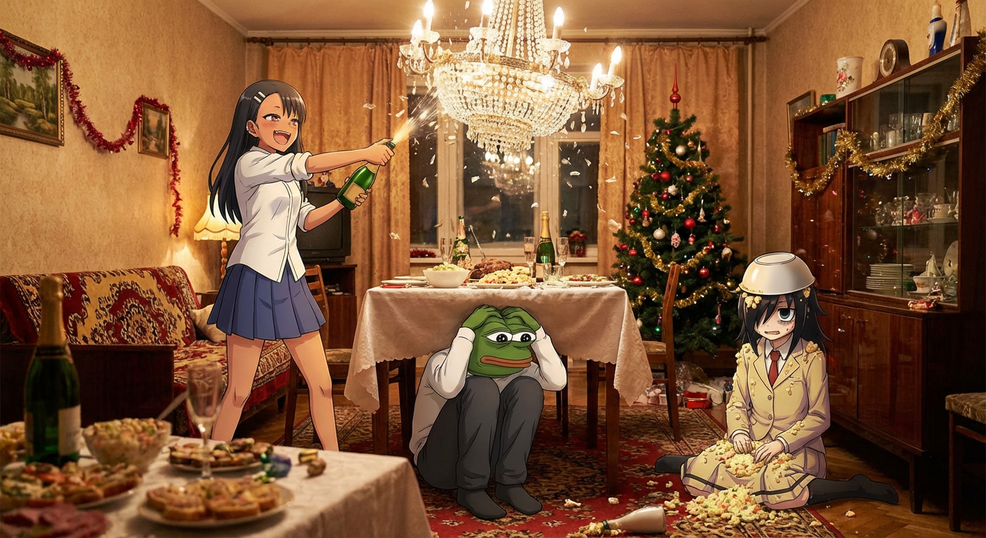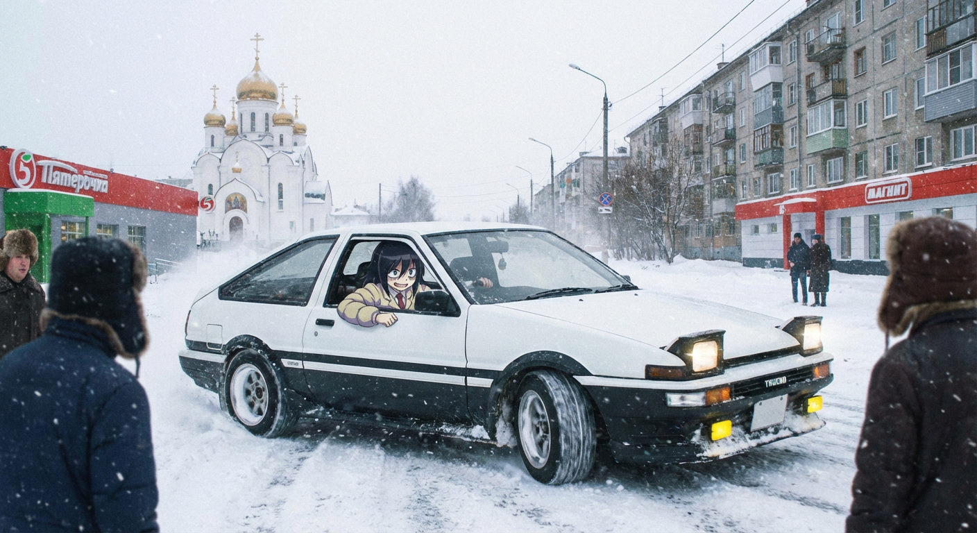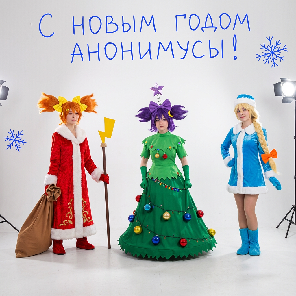 вторая Нагаторо, Томоко Куроки и лягушонок Пепе быстро едут ночью на машине Toyota Camry по полю. Из-под передних колес машины сильно вылетает снег как от пробуксовки. Машина как на загруженной картинке. Машина сильно помятая с полностью отпиленной крышей. Из багажника машины торчит елка. На номере машины надпись sup /b За рулем сидит сильно пьяная Нагаторо, рядом на сиденье сидит Пепе. Нагаторо в новогодней шапке колпаке. Томоко сидит на заднем сиденье. Пепе и Томоко улыбаются. К машине сзади привязана на трос ватрушка тюбинг. Машина тащит тюбинг за собой. В тюбинге находится желтый персонаж как на загруженной картинке. За машиной быстро едет Никита Джигурда на мотоцикле Урал с коляской и кричит "я нормальный!". Рыжие волосы Никиты развеваются на ветру.