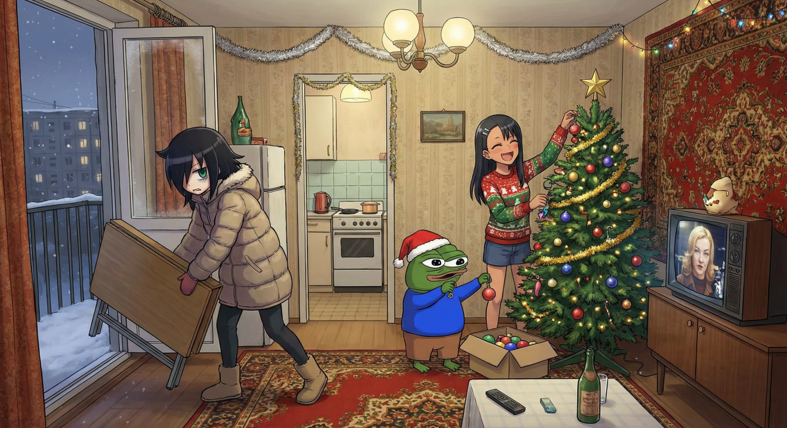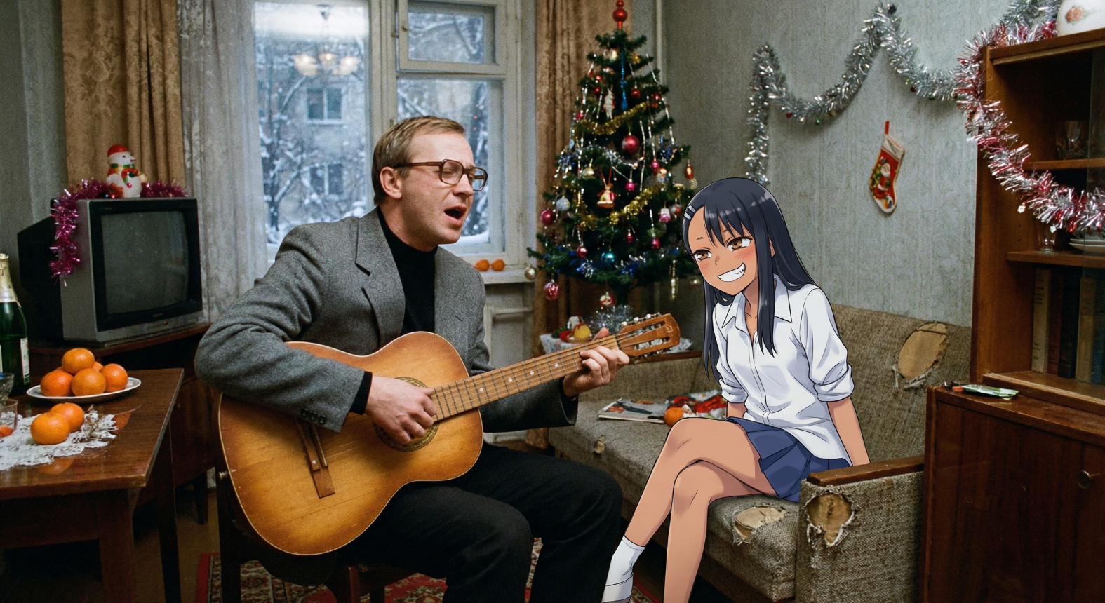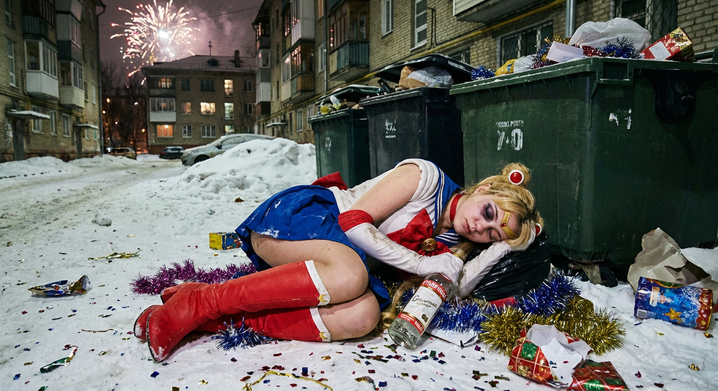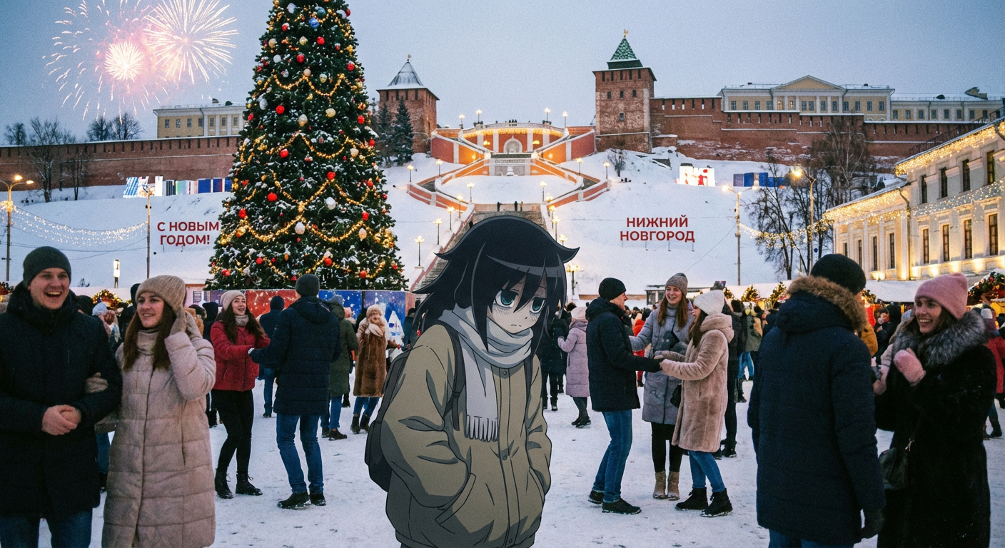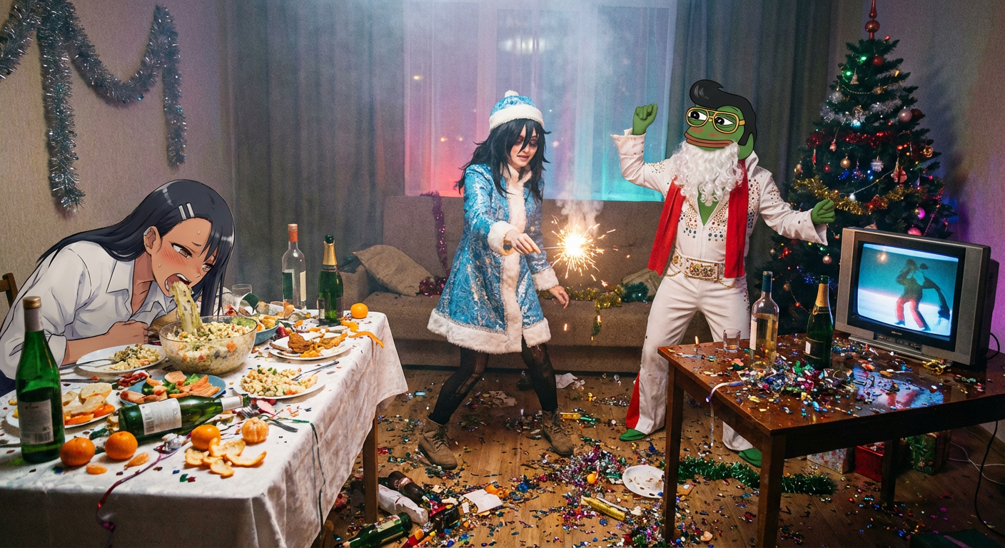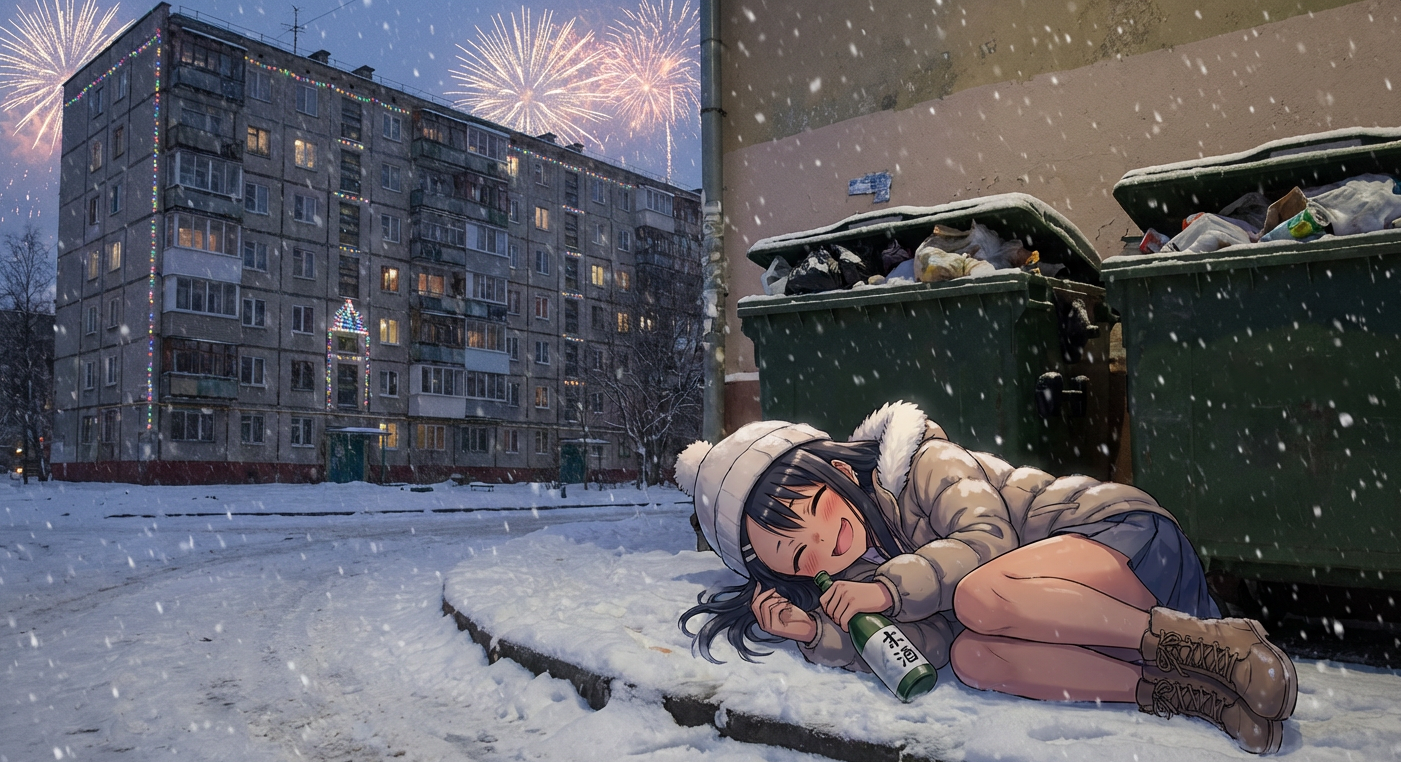 вторая Нагаторо, Томоко Куроки и лягушонок Пепе быстро едут ночью на машине Toyota Camry по полю. Из-под передних колес машины сильно вылетает снег как от пробуксовки. Машина как на загруженной картинке. Машина сильно помятая с полностью отпиленной крышей. Из багажника машины торчит елка. На номере машины надпись sup /b За рулем сидит сильно пьяная Нагаторо, рядом на сиденье сидит Пепе. Нагаторо в новогодней шапке колпаке. Томоко сидит на заднем сиденье. Пепе и Томоко улыбаются. К машине сзади привязана на трос ватрушка тюбинг. Машина тащит тюбинг за собой. В тюбинге находится желтый персонаж как на загруженной картинке. За машиной быстро едет Никита Джигурда на мотоцикле Урал с коляской и кричит "я нормальный!". Рыжие волосы Никиты развеваются на ветру.