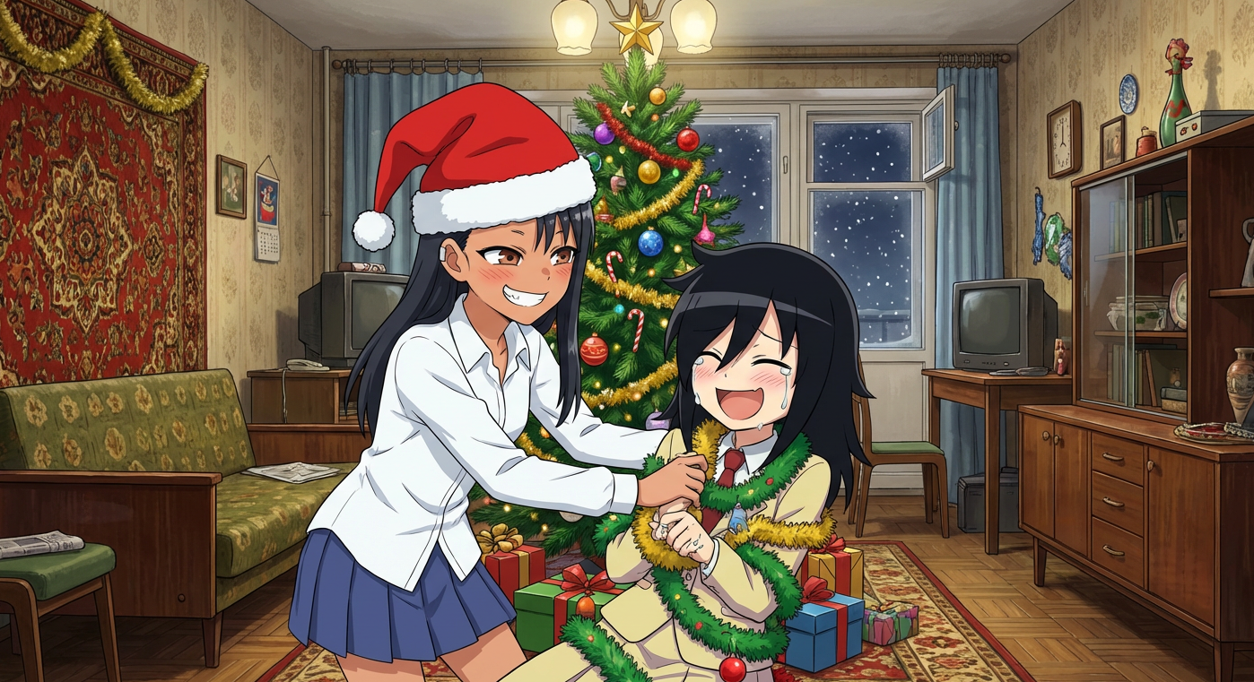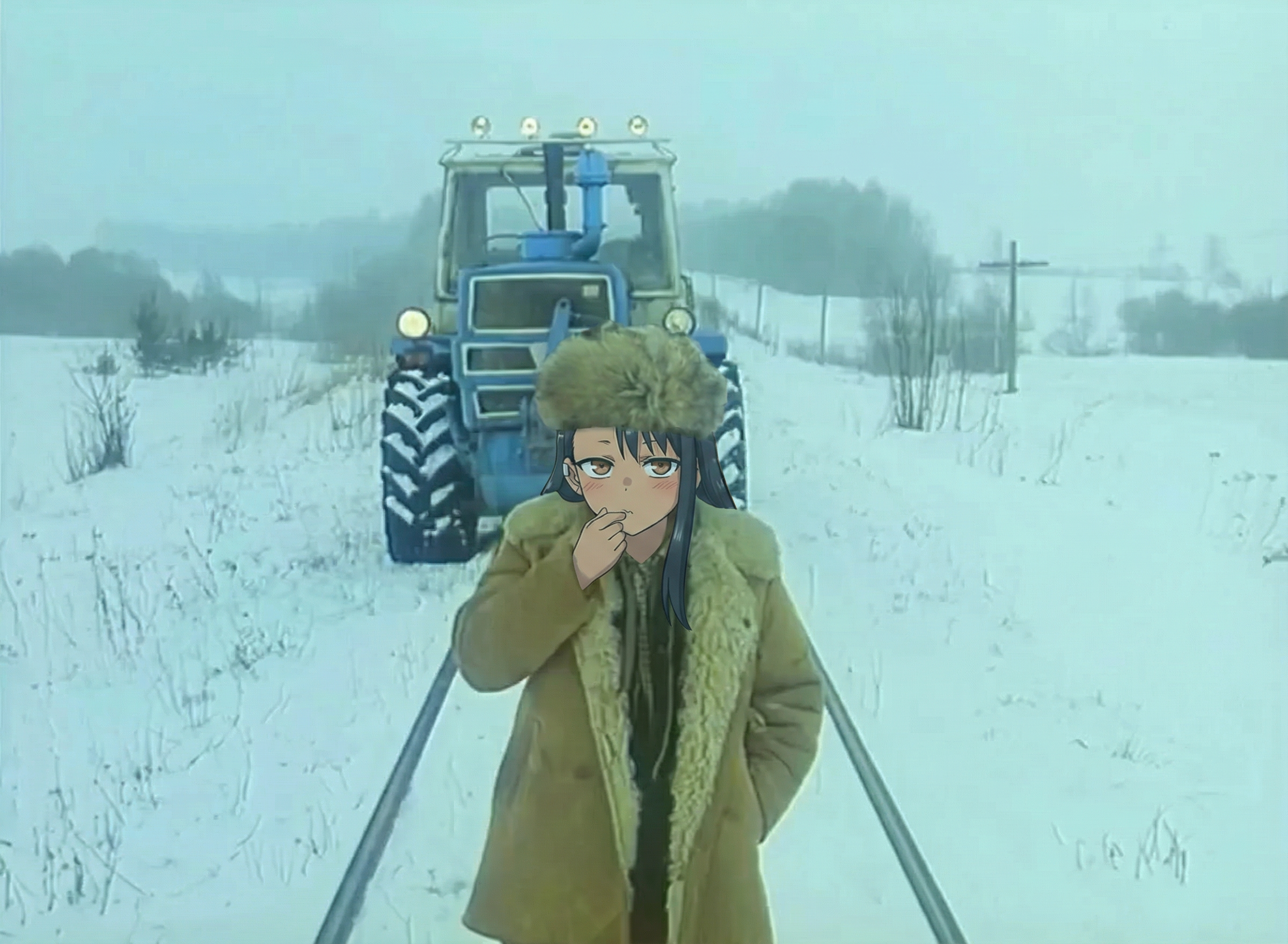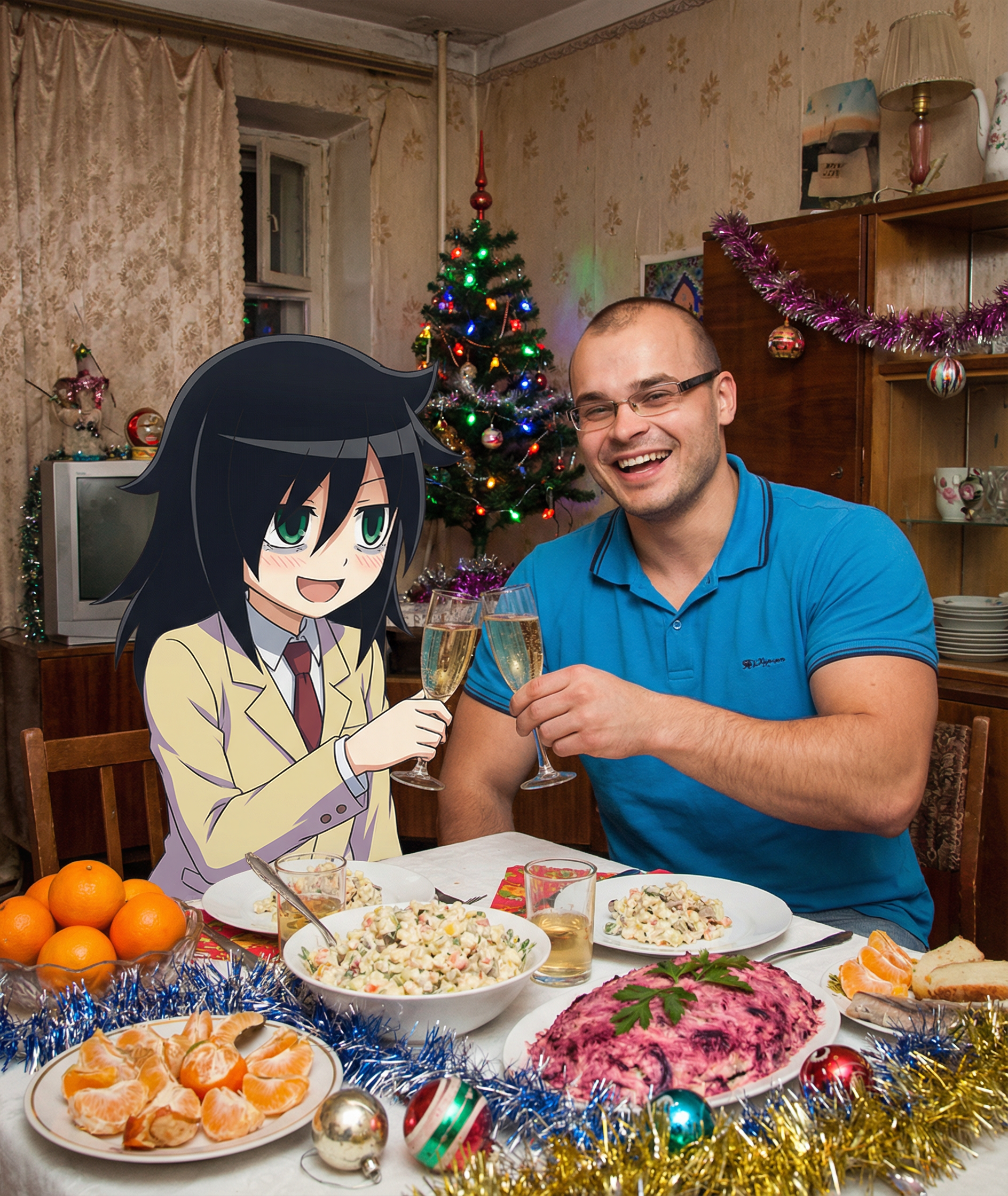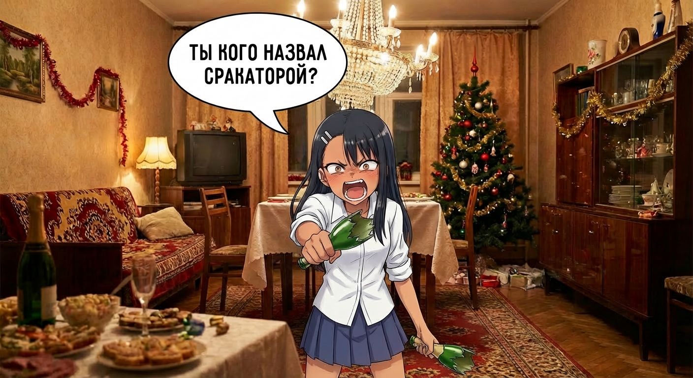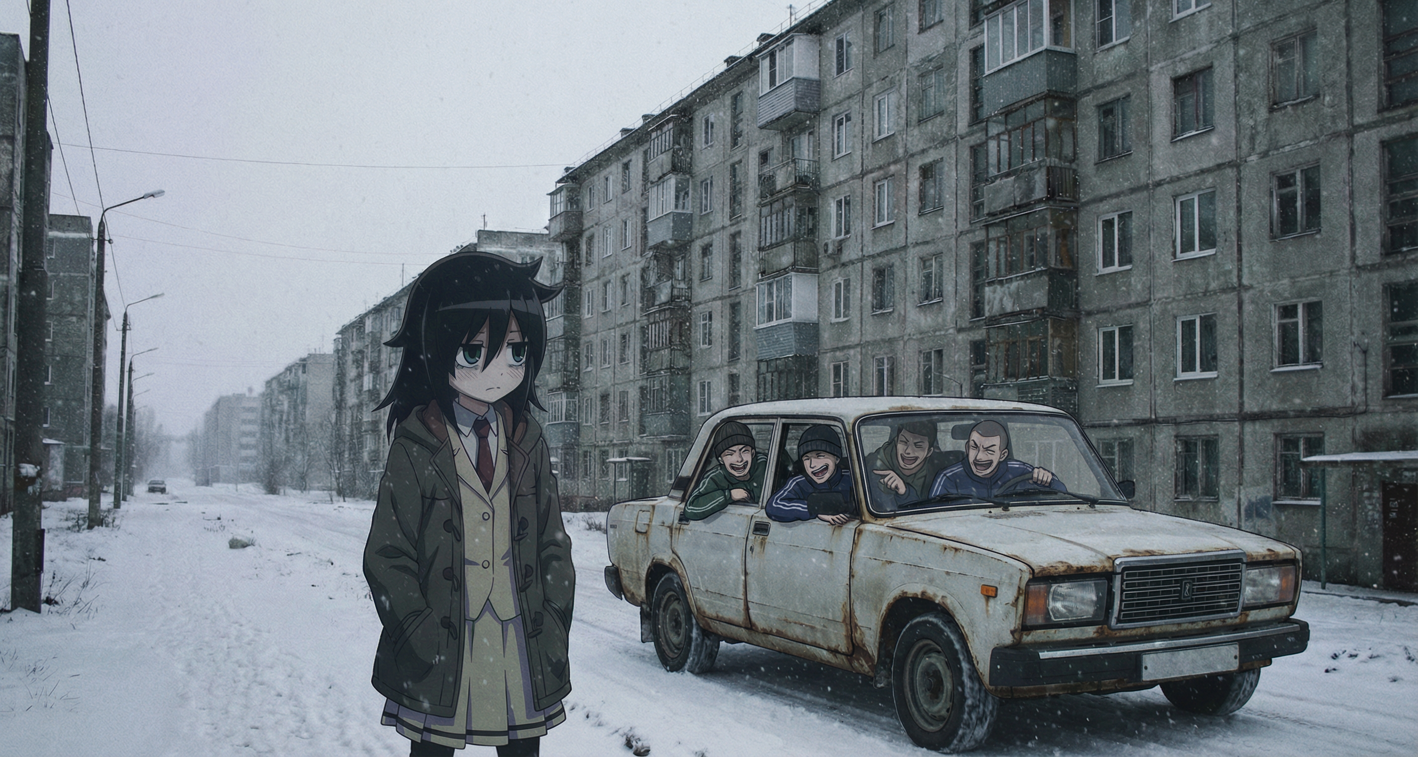 вторая Нагаторо, Томоко Куроки и лягушонок Пепе быстро едут ночью на машине Toyota Camry по полю. Из-под передних колес машины сильно вылетает снег как от пробуксовки. Машина как на загруженной картинке. Машина сильно помятая с полностью отпиленной крышей. Из багажника машины торчит елка. На номере машины надпись sup /b За рулем сидит сильно пьяная Нагаторо, рядом на сиденье сидит Пепе. Нагаторо в новогодней шапке колпаке. Томоко сидит на заднем сиденье. Пепе и Томоко улыбаются. К машине сзади привязана на трос ватрушка тюбинг. Машина тащит тюбинг за собой. В тюбинге находится желтый персонаж как на загруженной картинке. За машиной быстро едет Никита Джигурда на мотоцикле Урал с коляской и кричит "я нормальный!". Рыжие волосы Никиты развеваются на ветру.