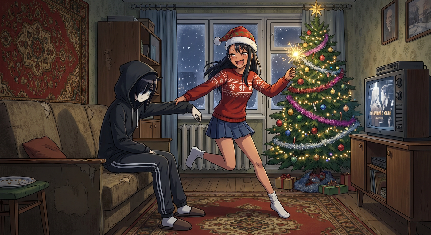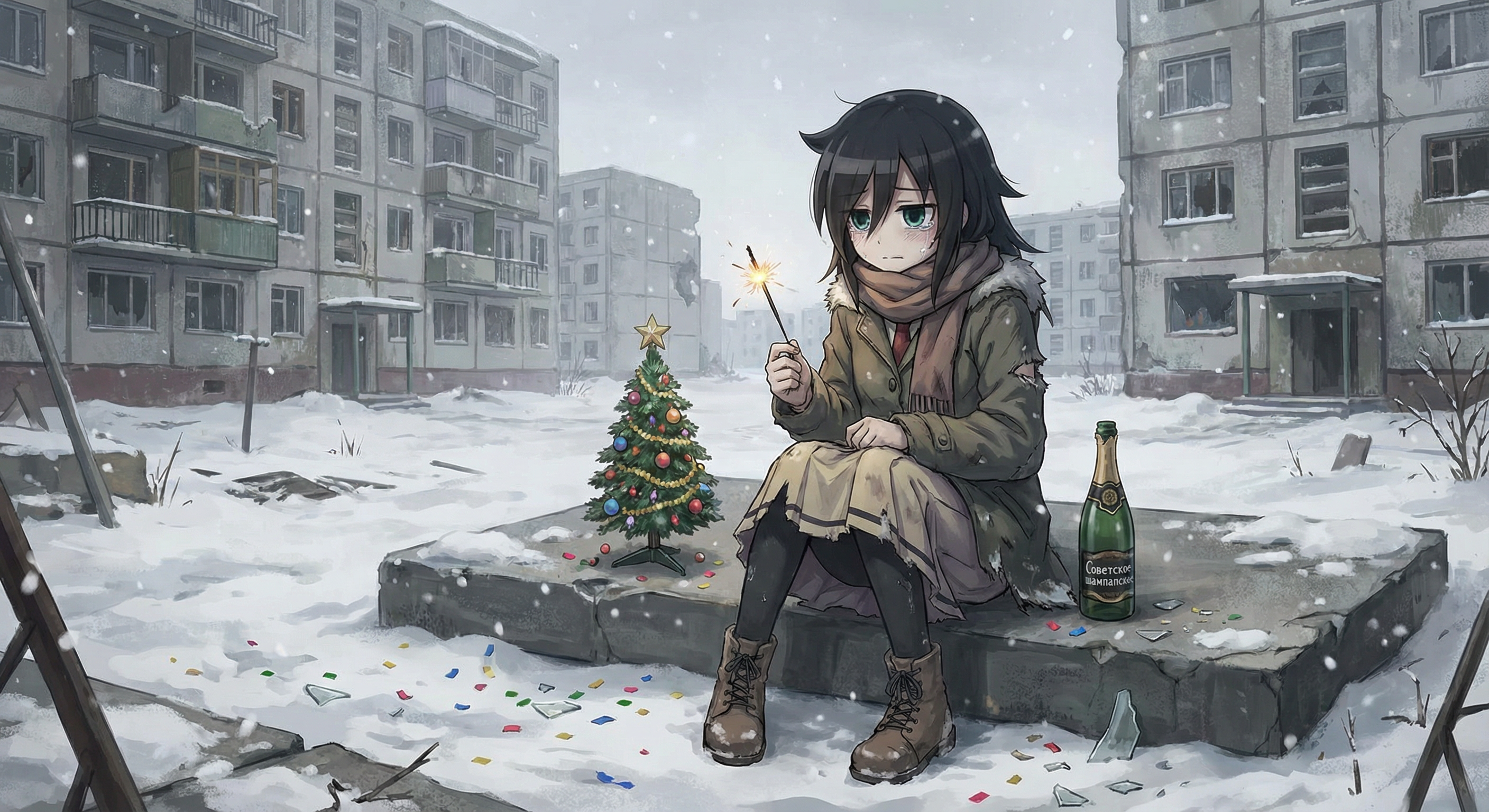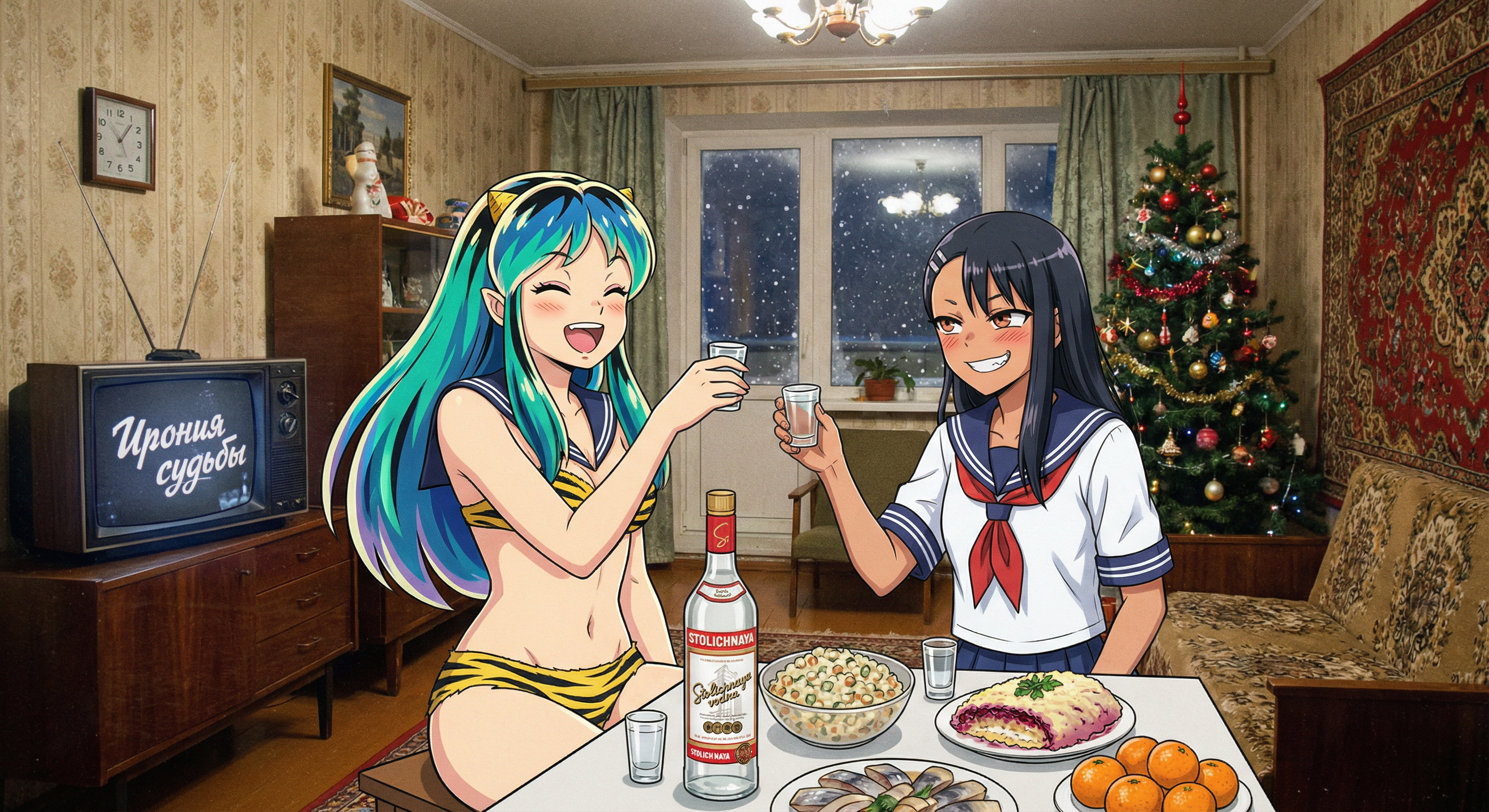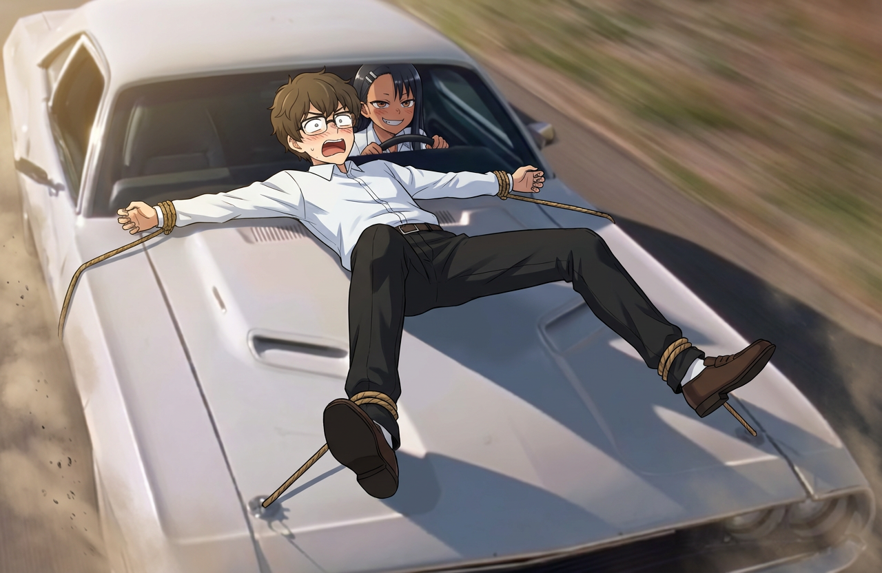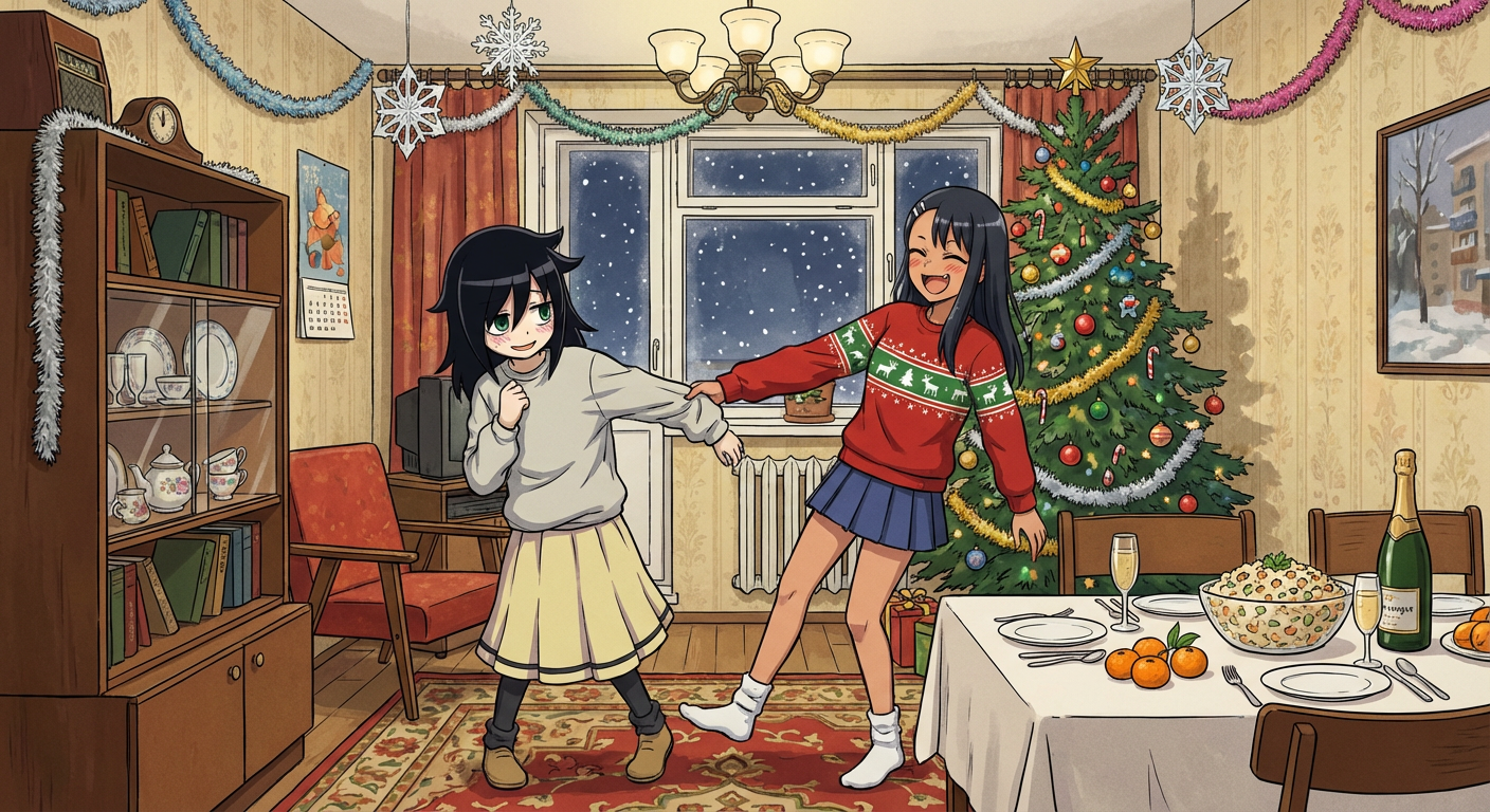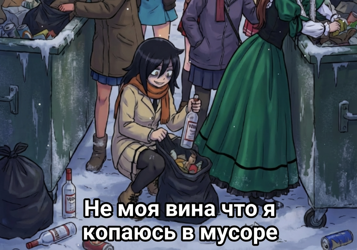вторая Нагаторо, Томоко Куроки и лягушонок Пепе быстро едут ночью на машине Toyota Camry по полю. Из-под передних колес машины сильно вылетает снег как от пробуксовки. Машина как на загруженной картинке. Машина сильно помятая с полностью отпиленной крышей. Из багажника машины торчит елка. На номере машины надпись sup /b За рулем сидит сильно пьяная Нагаторо, рядом на сиденье сидит Пепе. Нагаторо в новогодней шапке колпаке. Томоко сидит на заднем сиденье. Пепе и Томоко улыбаются. К машине сзади привязана на трос ватрушка тюбинг. Машина тащит тюбинг за собой. В тюбинге находится желтый персонаж как на загруженной картинке. За машиной быстро едет Никита Джигурда на мотоцикле Урал с коляской и кричит "я нормальный!". Рыжие волосы Никиты развеваются на ветру.
