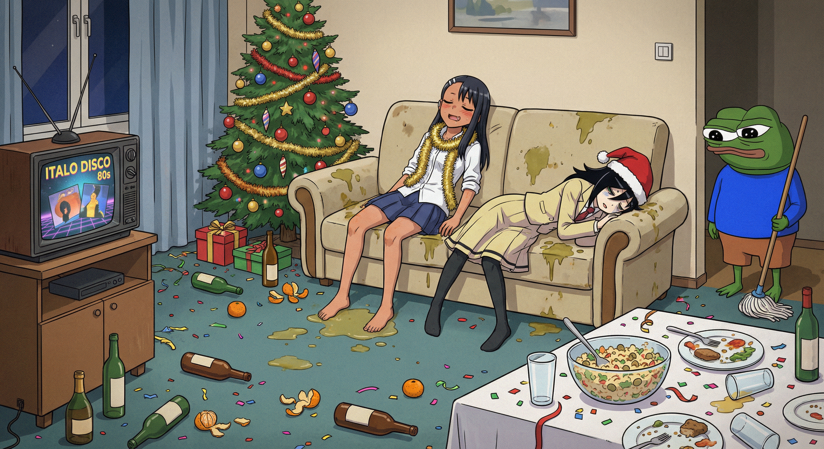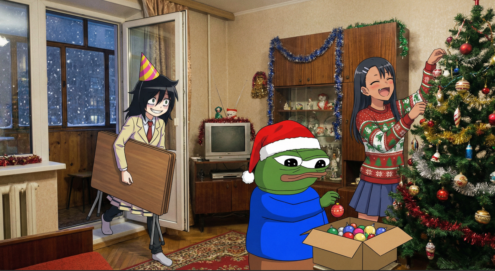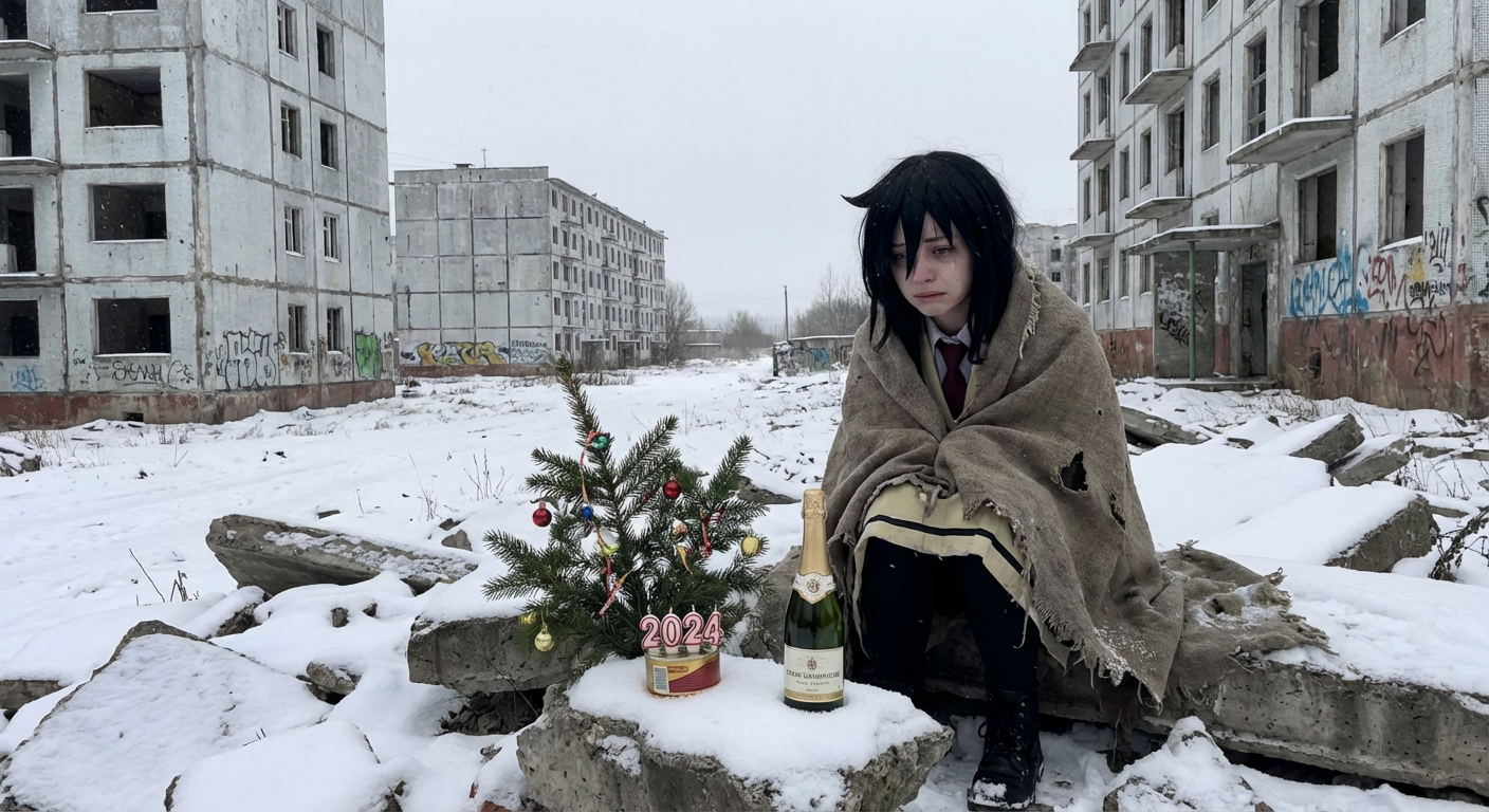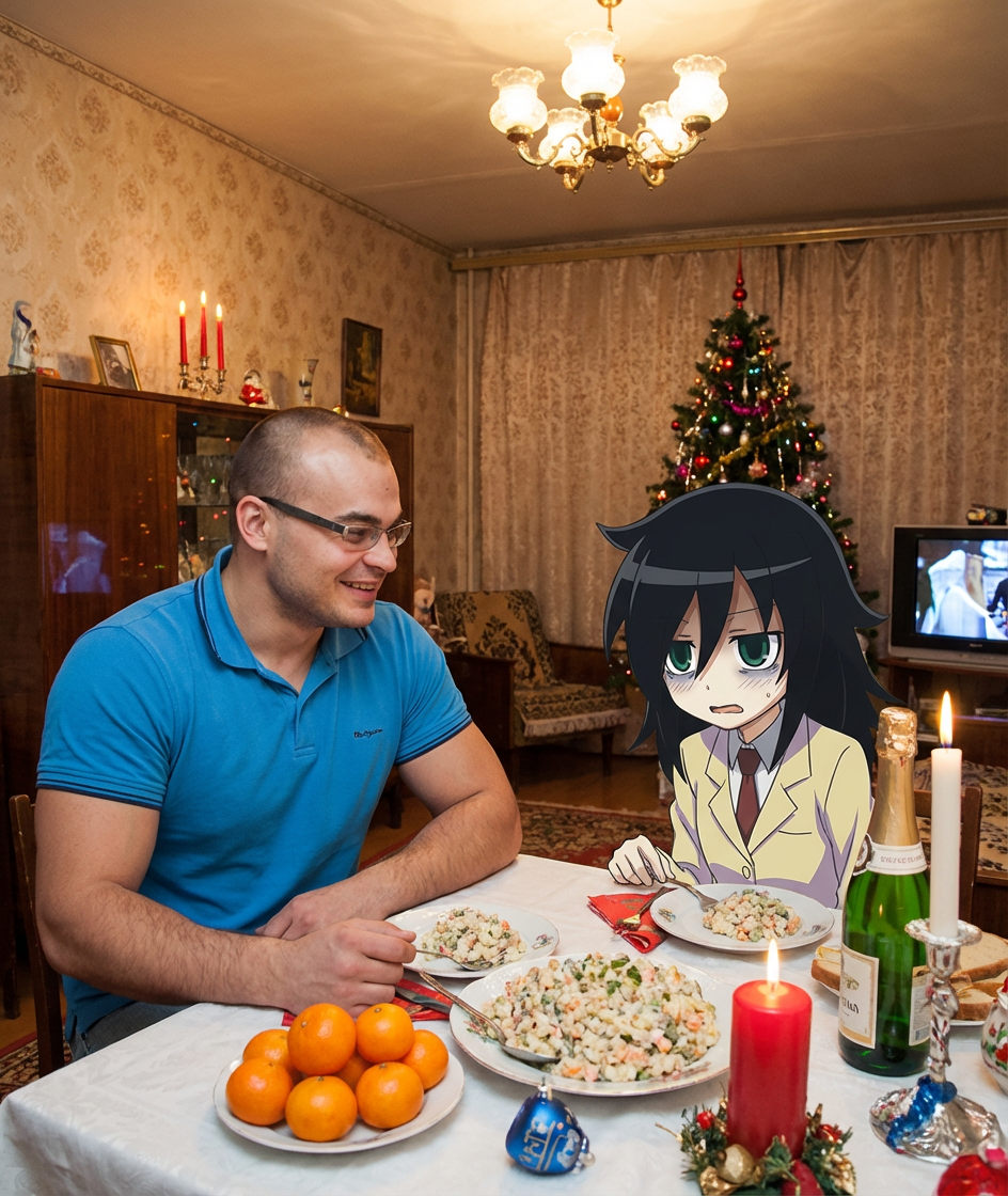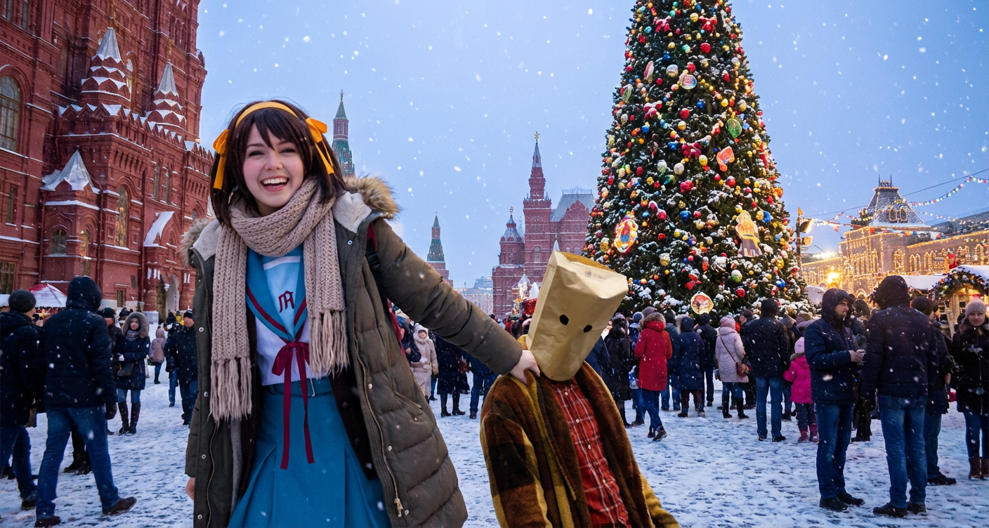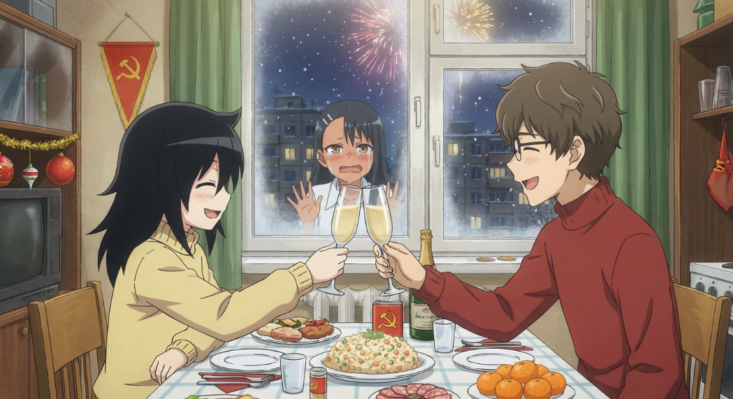 вторая Нагаторо, Томоко Куроки и лягушонок Пепе быстро едут ночью на машине Toyota Camry по полю. Из-под передних колес машины сильно вылетает снег как от пробуксовки. Машина как на загруженной картинке. Машина сильно помятая с полностью отпиленной крышей. Из багажника машины торчит елка. На номере машины надпись sup /b За рулем сидит сильно пьяная Нагаторо, рядом на сиденье сидит Пепе. Нагаторо в новогодней шапке колпаке. Томоко сидит на заднем сиденье. Пепе и Томоко улыбаются. К машине сзади привязана на трос ватрушка тюбинг. Машина тащит тюбинг за собой. В тюбинге находится желтый персонаж как на загруженной картинке. За машиной быстро едет Никита Джигурда на мотоцикле Урал с коляской и кричит "я нормальный!". Рыжие волосы Никиты развеваются на ветру.