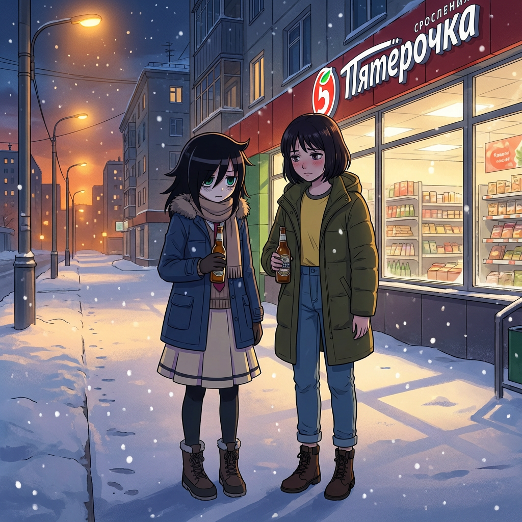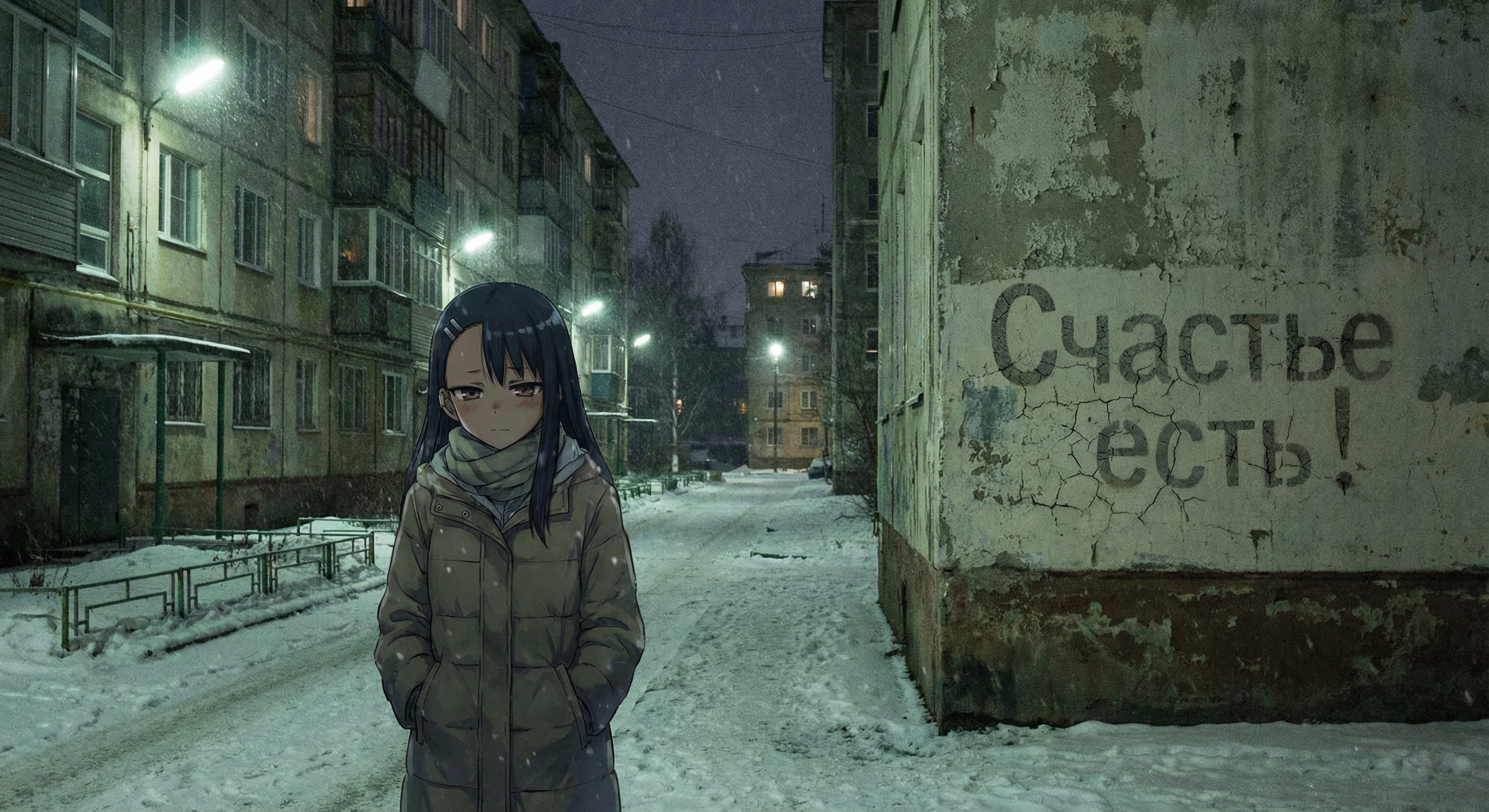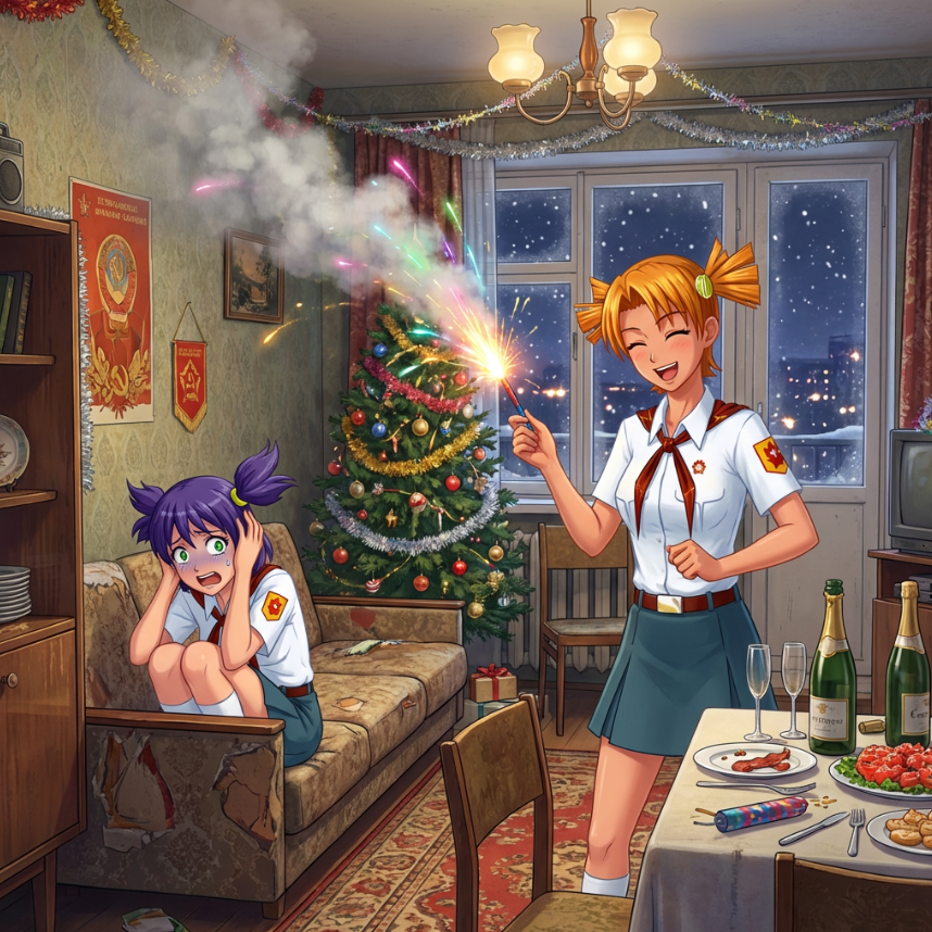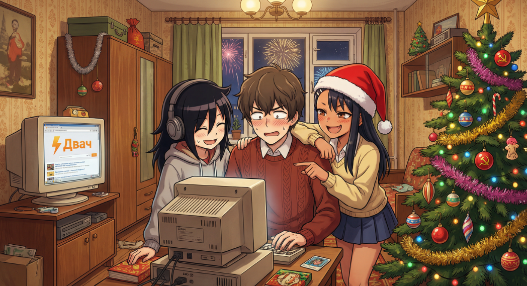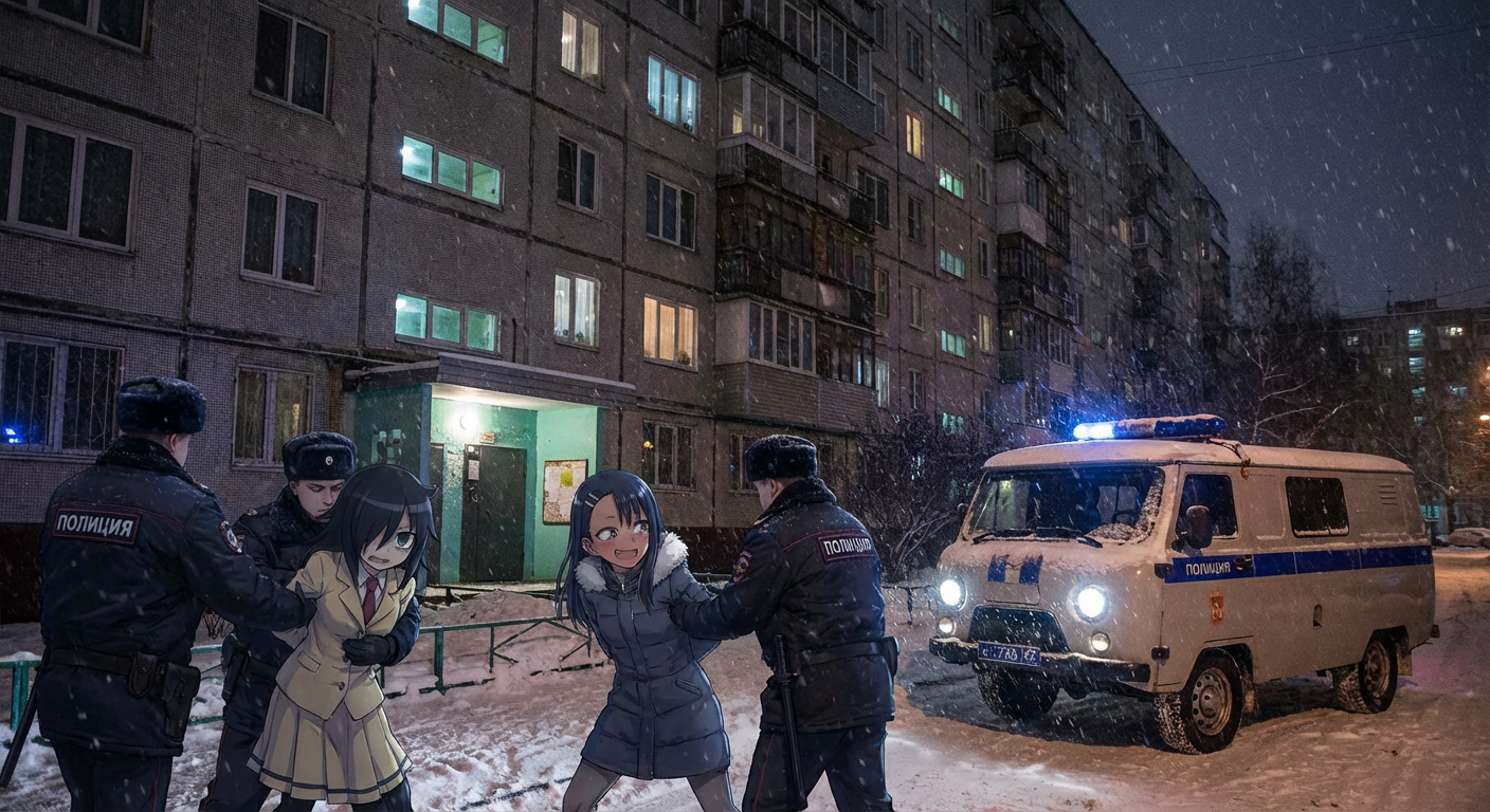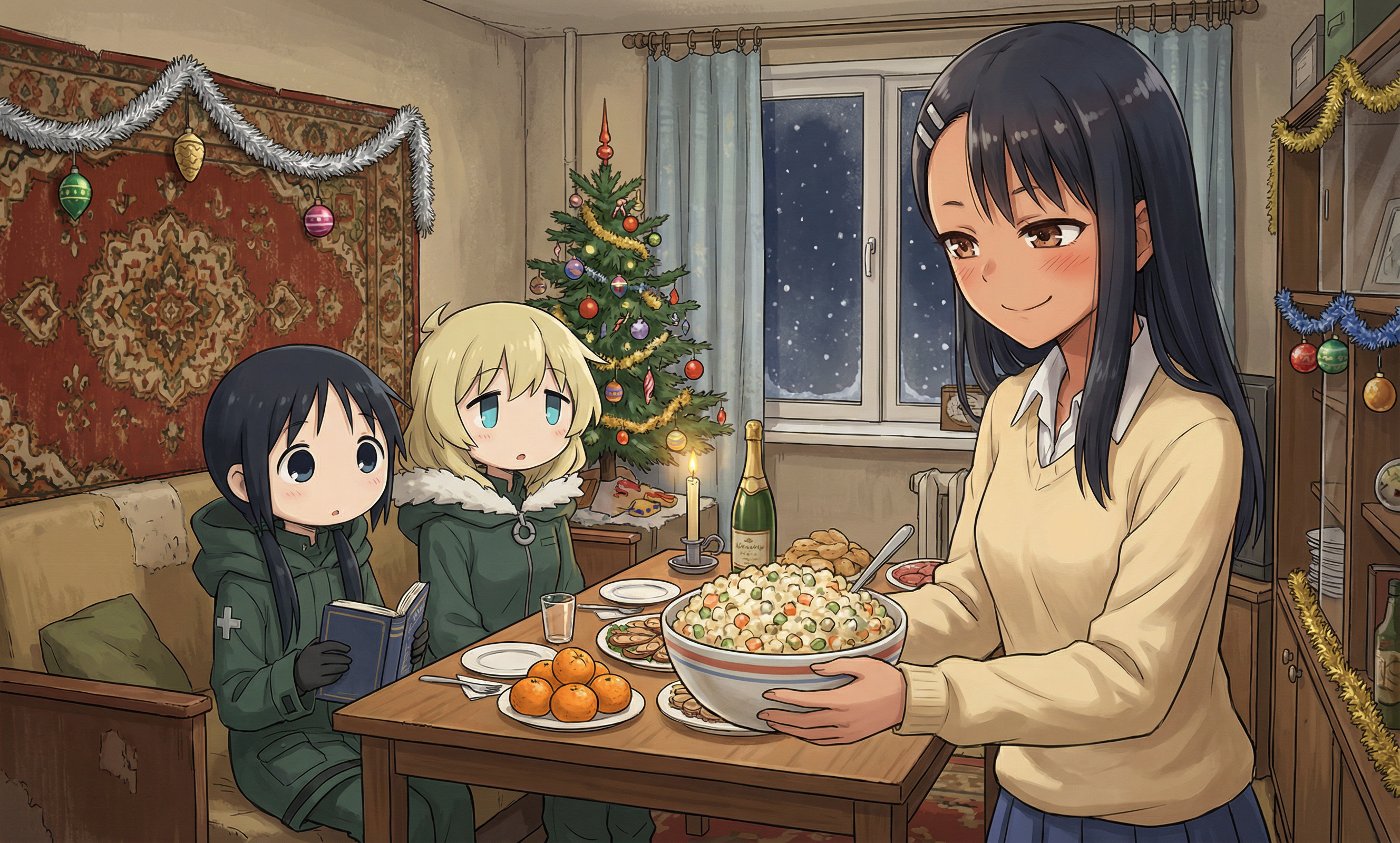 вторая Нагаторо, Томоко Куроки и лягушонок Пепе быстро едут ночью на машине Toyota Camry по полю. Из-под передних колес машины сильно вылетает снег как от пробуксовки. Машина как на загруженной картинке. Машина сильно помятая с полностью отпиленной крышей. Из багажника машины торчит елка. На номере машины надпись sup /b За рулем сидит сильно пьяная Нагаторо, рядом на сиденье сидит Пепе. Нагаторо в новогодней шапке колпаке. Томоко сидит на заднем сиденье. Пепе и Томоко улыбаются. К машине сзади привязана на трос ватрушка тюбинг. Машина тащит тюбинг за собой. В тюбинге находится желтый персонаж как на загруженной картинке. За машиной быстро едет Никита Джигурда на мотоцикле Урал с коляской и кричит "я нормальный!". Рыжие волосы Никиты развеваются на ветру.