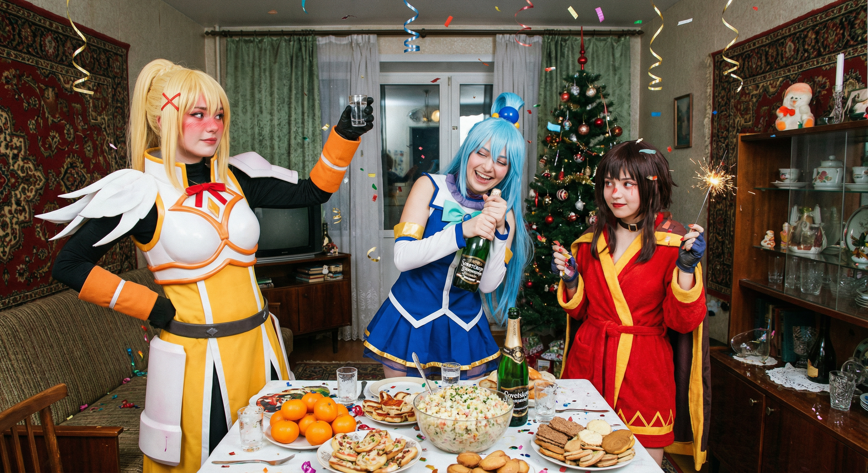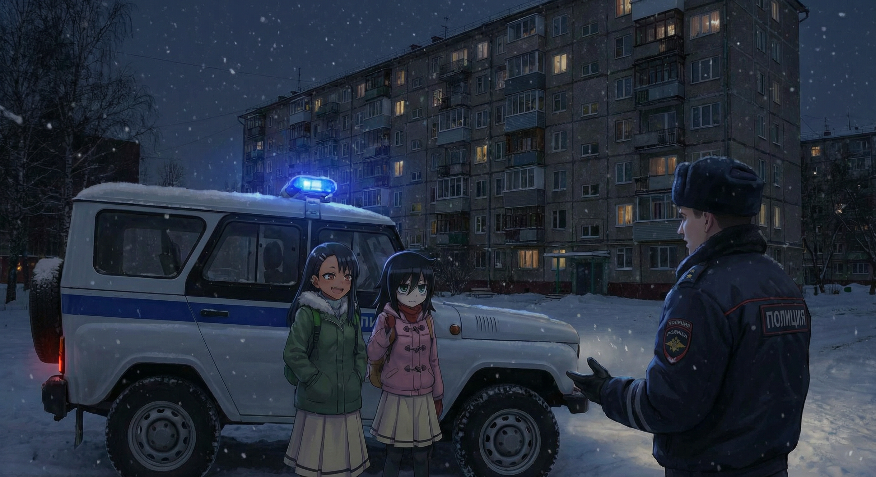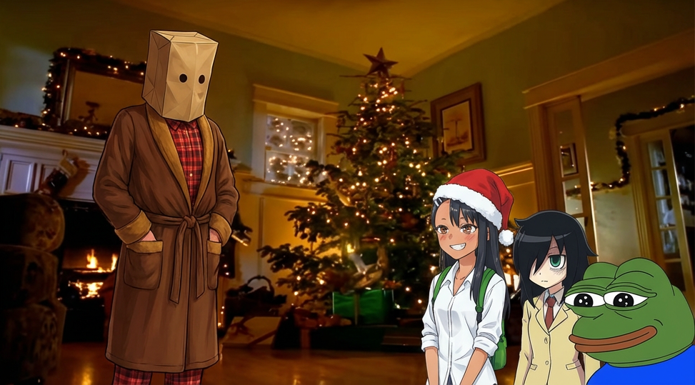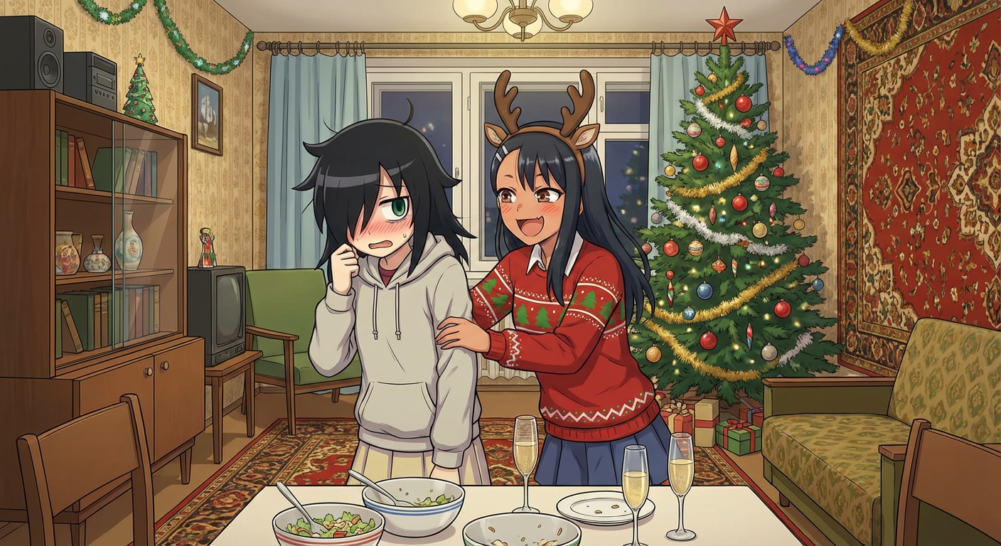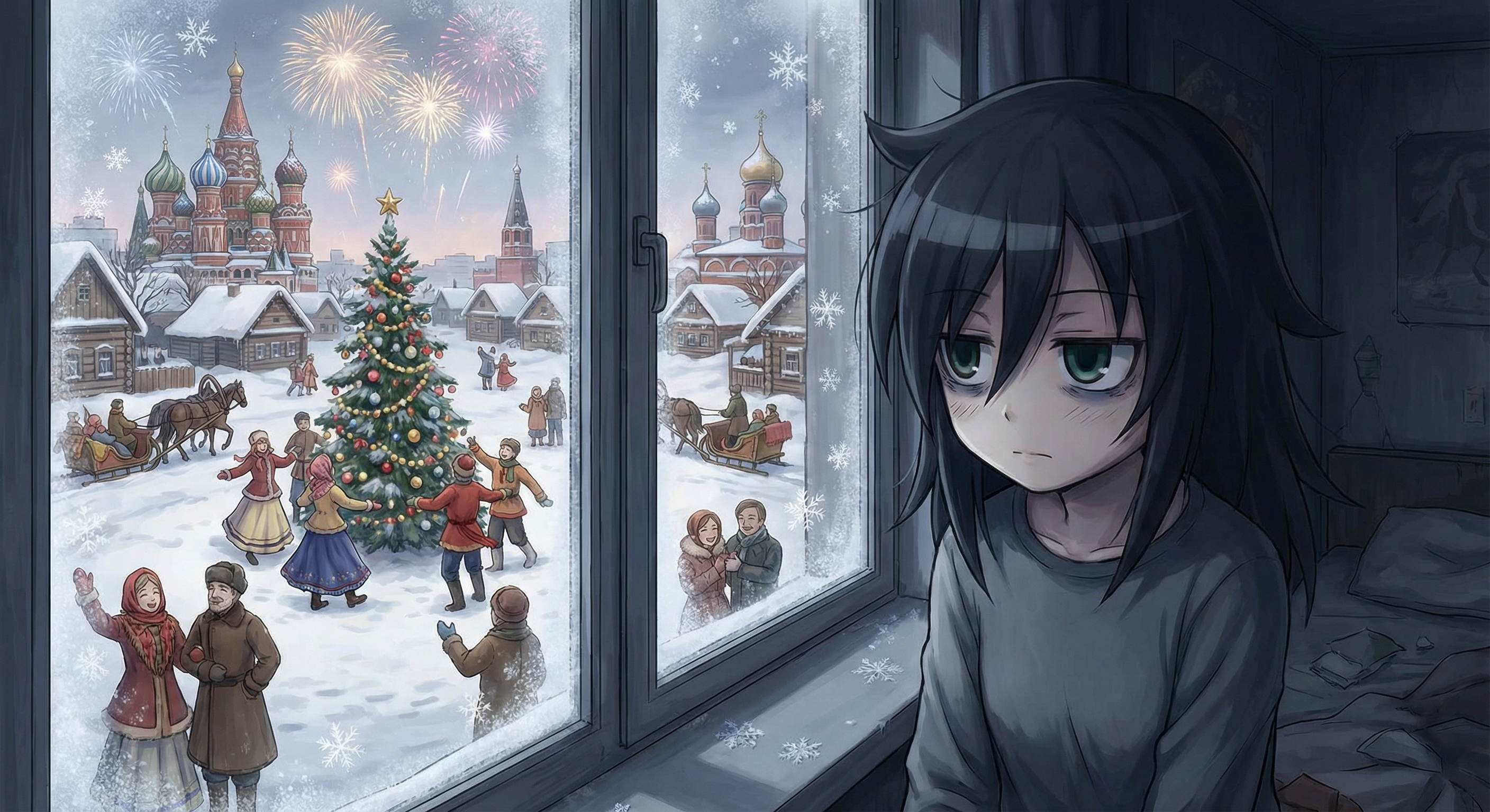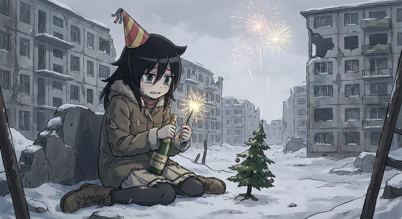 вторая Нагаторо, Томоко Куроки и лягушонок Пепе быстро едут ночью на машине Toyota Camry по полю. Из-под передних колес машины сильно вылетает снег как от пробуксовки. Машина как на загруженной картинке. Машина сильно помятая с полностью отпиленной крышей. Из багажника машины торчит елка. На номере машины надпись sup /b За рулем сидит сильно пьяная Нагаторо, рядом на сиденье сидит Пепе. Нагаторо в новогодней шапке колпаке. Томоко сидит на заднем сиденье. Пепе и Томоко улыбаются. К машине сзади привязана на трос ватрушка тюбинг. Машина тащит тюбинг за собой. В тюбинге находится желтый персонаж как на загруженной картинке. За машиной быстро едет Никита Джигурда на мотоцикле Урал с коляской и кричит "я нормальный!". Рыжие волосы Никиты развеваются на ветру.