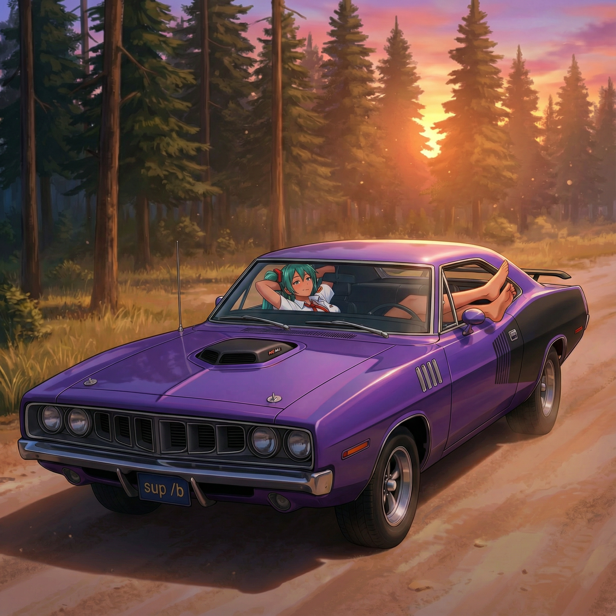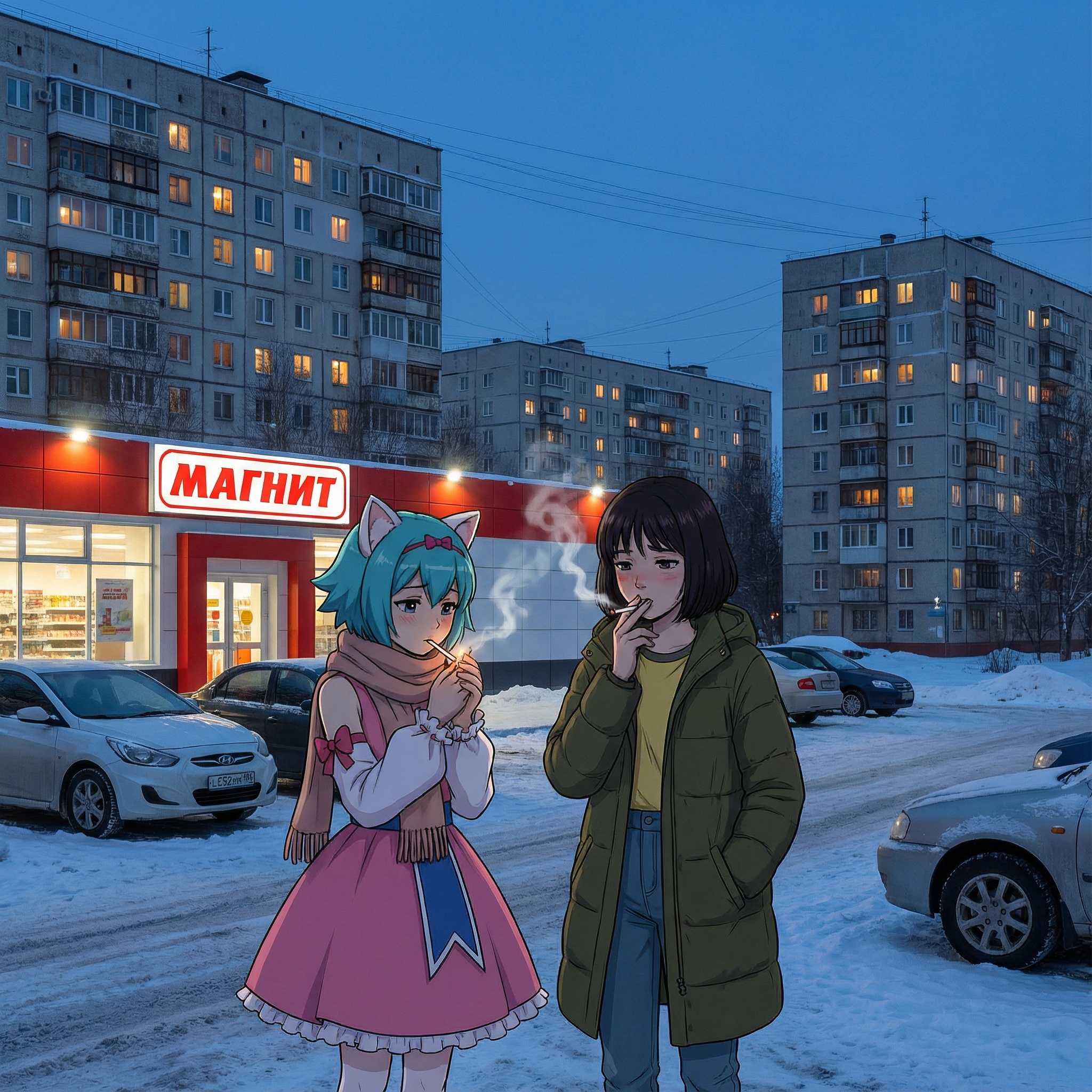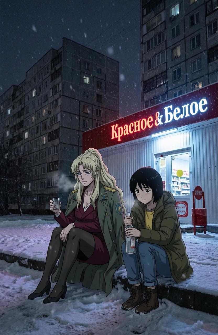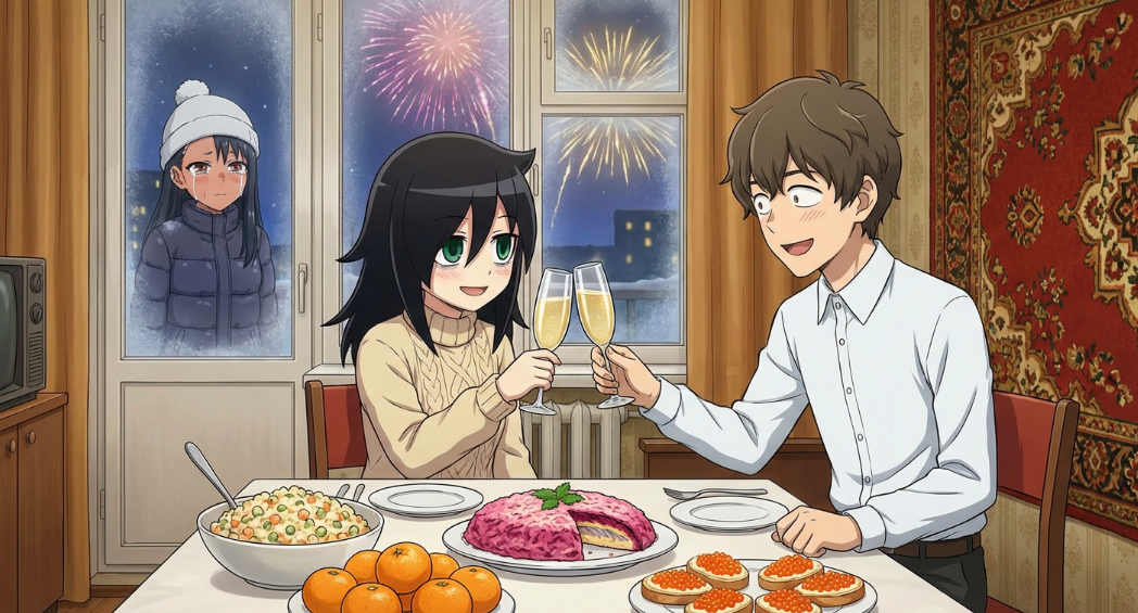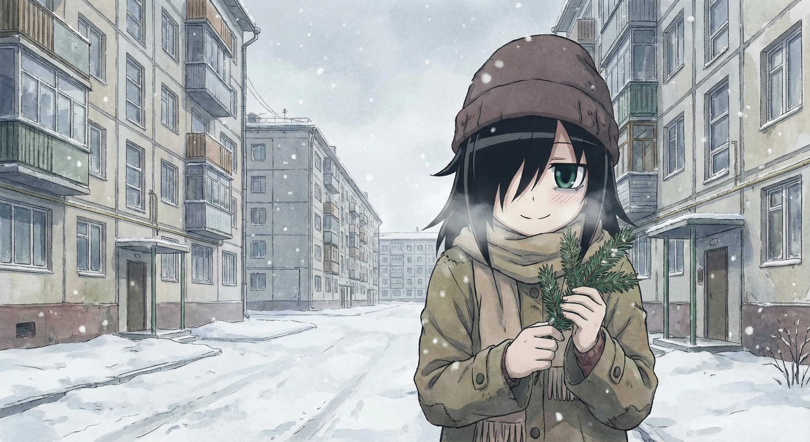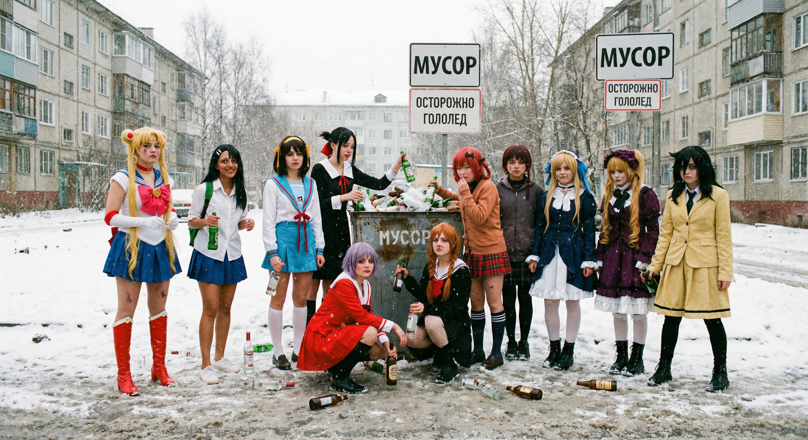вторая Нагаторо, Томоко Куроки и лягушонок Пепе быстро едут ночью на машине Toyota Camry по полю. Из-под передних колес машины сильно вылетает снег как от пробуксовки. Машина как на загруженной картинке. Машина сильно помятая с полностью отпиленной крышей. Из багажника машины торчит елка. На номере машины надпись sup /b За рулем сидит сильно пьяная Нагаторо, рядом на сиденье сидит Пепе. Нагаторо в новогодней шапке колпаке. Томоко сидит на заднем сиденье. Пепе и Томоко улыбаются. К машине сзади привязана на трос ватрушка тюбинг. Машина тащит тюбинг за собой. В тюбинге находится желтый персонаж как на загруженной картинке. За машиной быстро едет Никита Джигурда на мотоцикле Урал с коляской и кричит "я нормальный!". Рыжие волосы Никиты развеваются на ветру.
