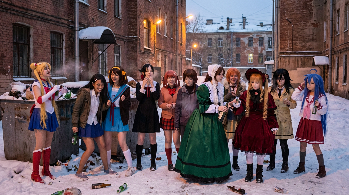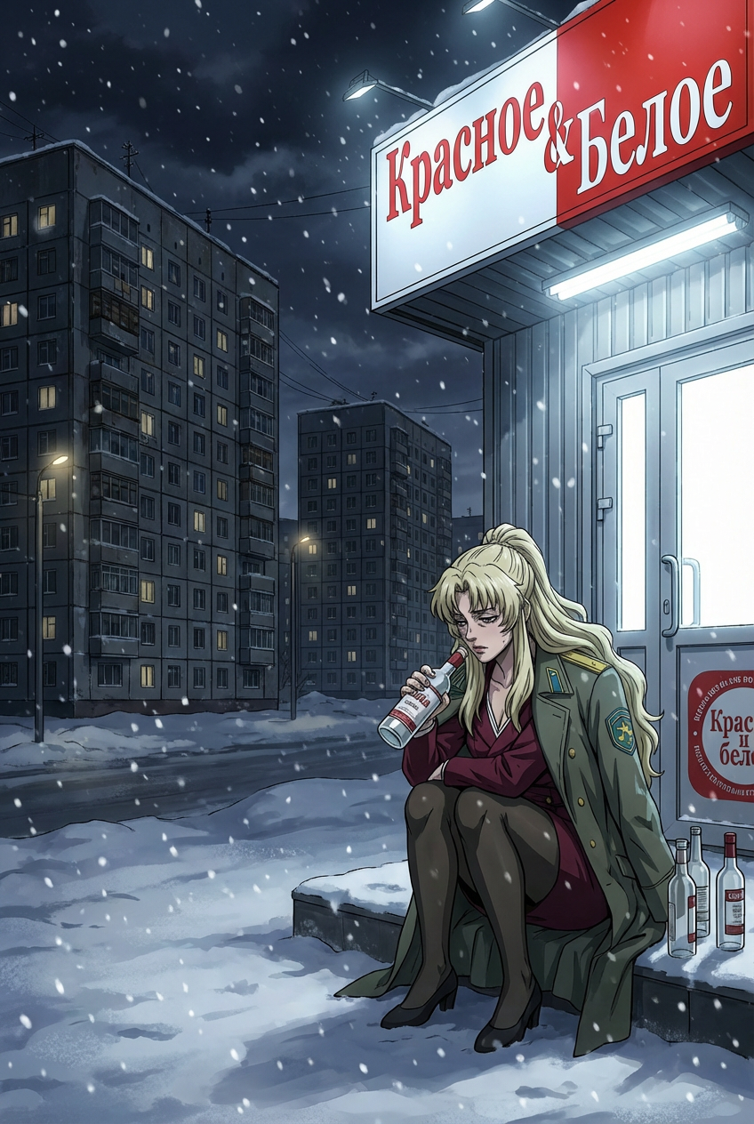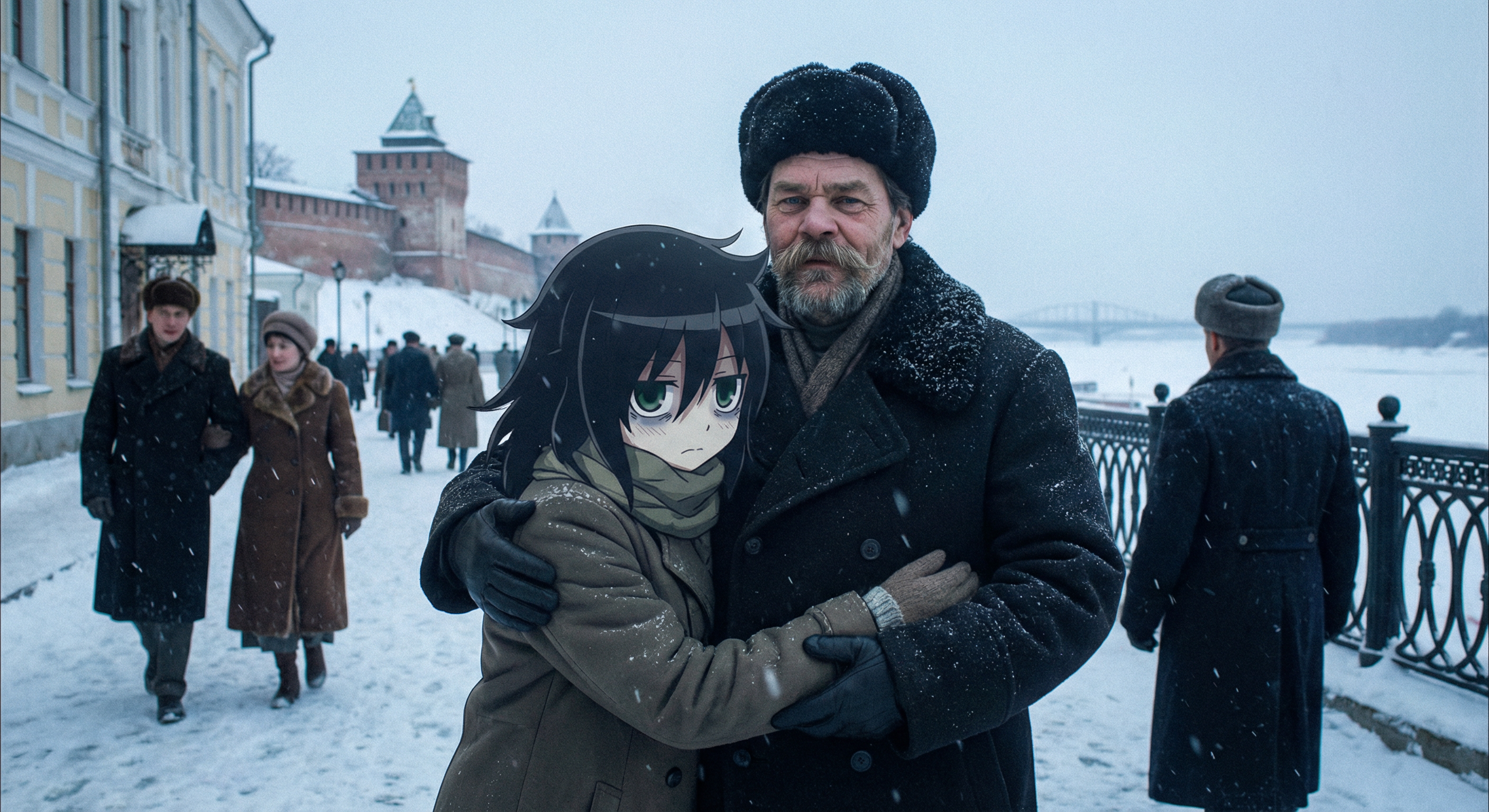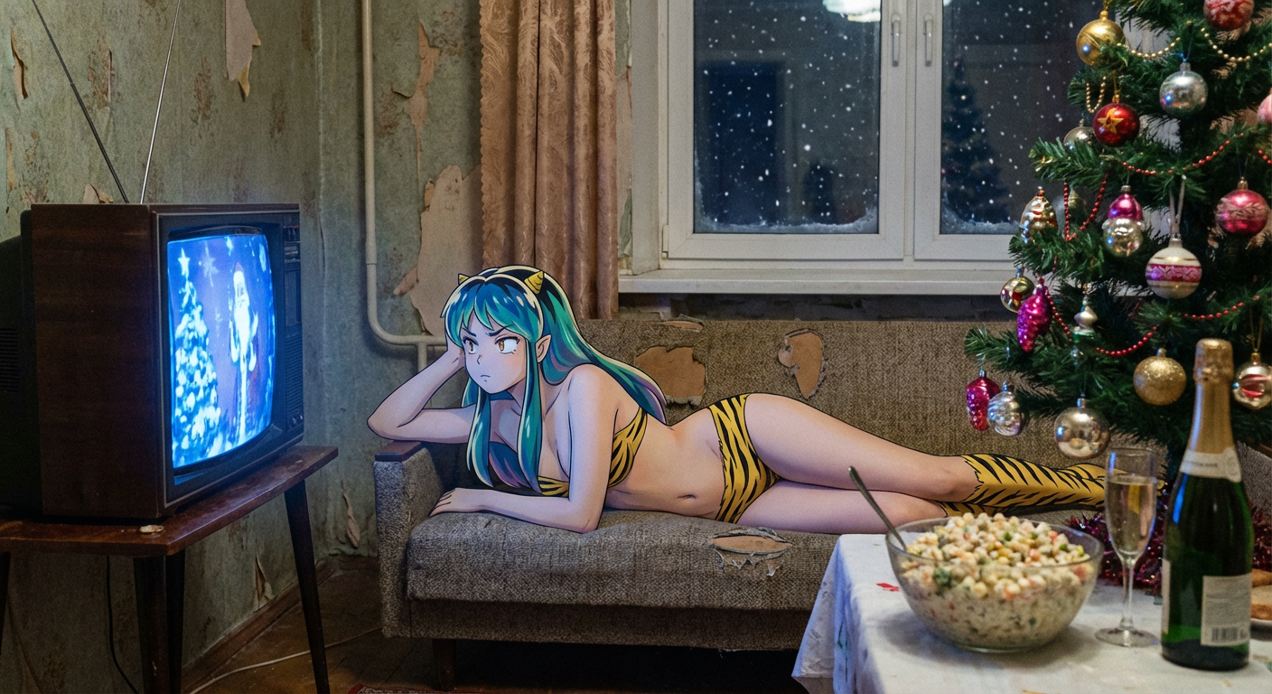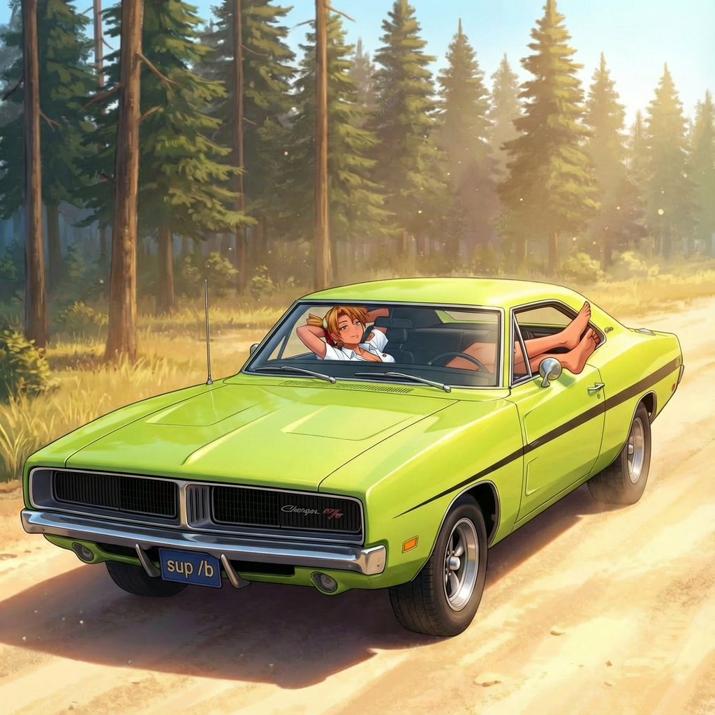 вторая Нагаторо, Томоко Куроки и лягушонок Пепе быстро едут ночью на машине Toyota Camry по полю. Из-под передних колес машины сильно вылетает снег как от пробуксовки. Машина как на загруженной картинке. Машина сильно помятая с полностью отпиленной крышей. Из багажника машины торчит елка. На номере машины надпись sup /b За рулем сидит сильно пьяная Нагаторо, рядом на сиденье сидит Пепе. Нагаторо в новогодней шапке колпаке. Томоко сидит на заднем сиденье. Пепе и Томоко улыбаются. К машине сзади привязана на трос ватрушка тюбинг. Машина тащит тюбинг за собой. В тюбинге находится желтый персонаж как на загруженной картинке. За машиной быстро едет Никита Джигурда на мотоцикле Урал с коляской и кричит "я нормальный!". Рыжие волосы Никиты развеваются на ветру.