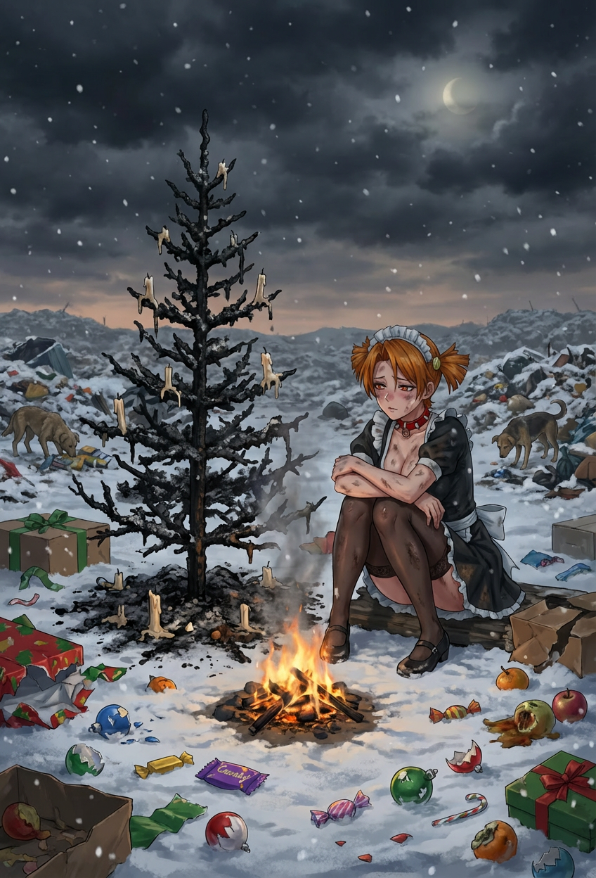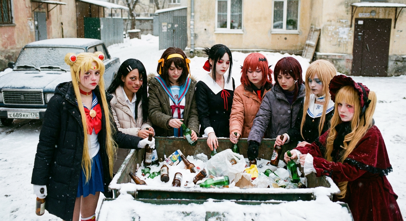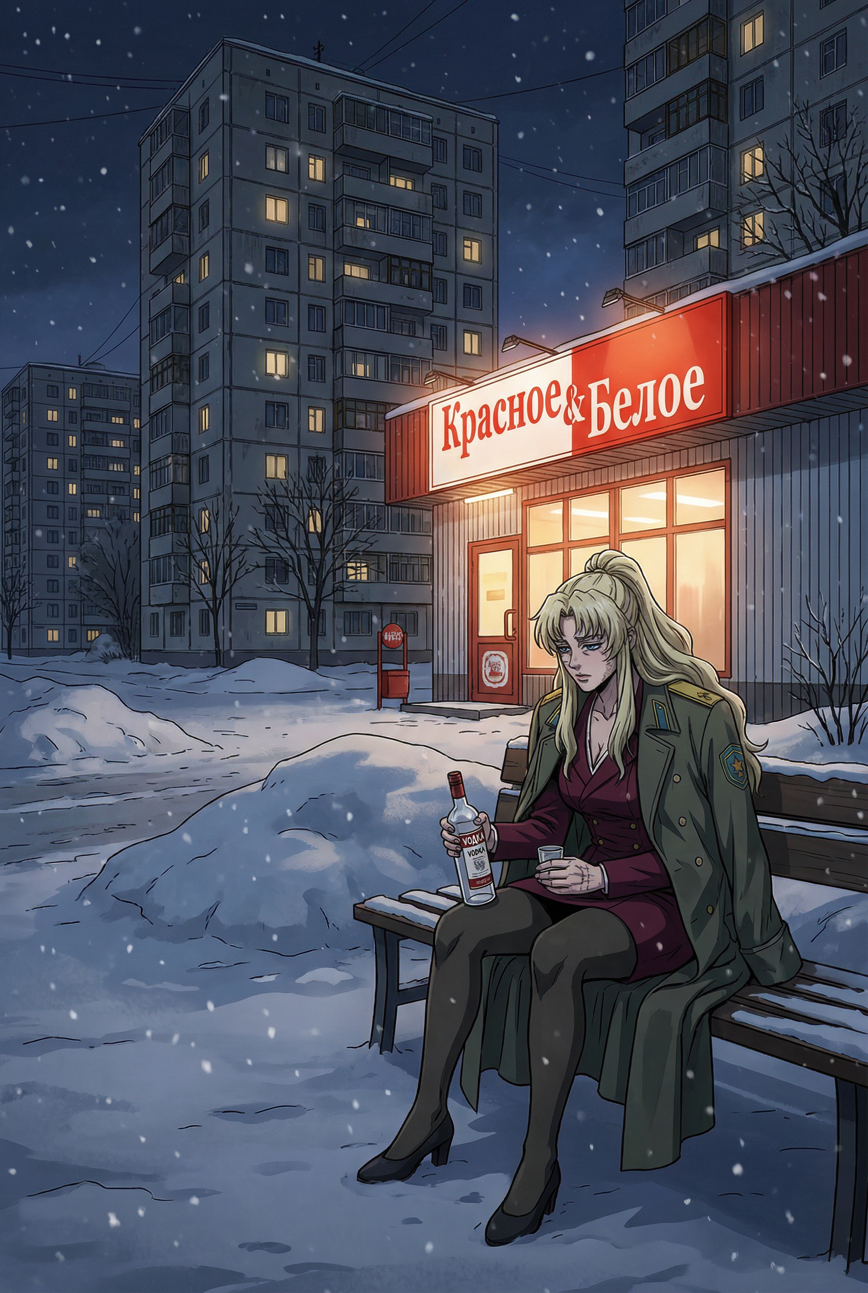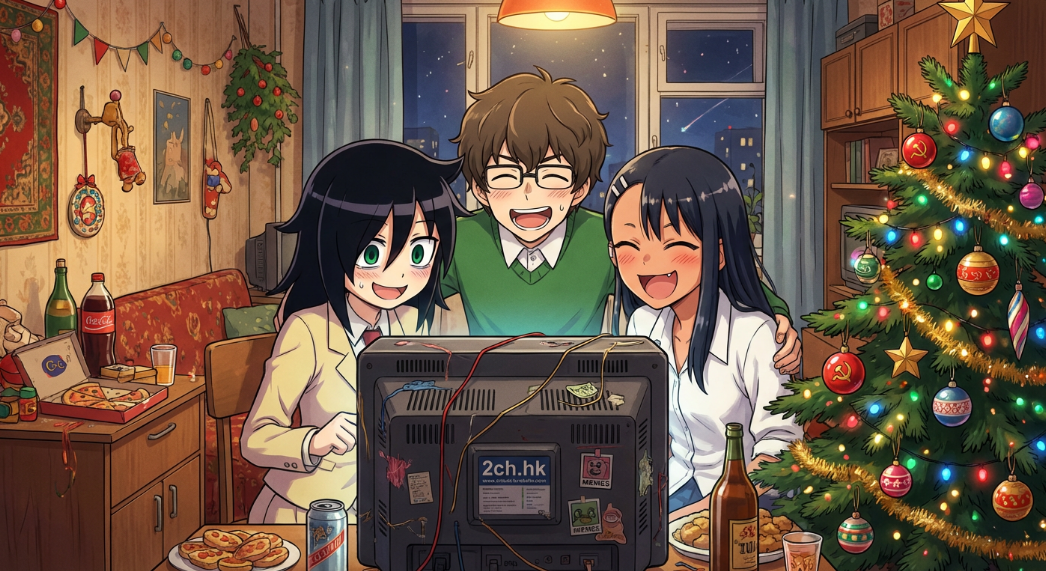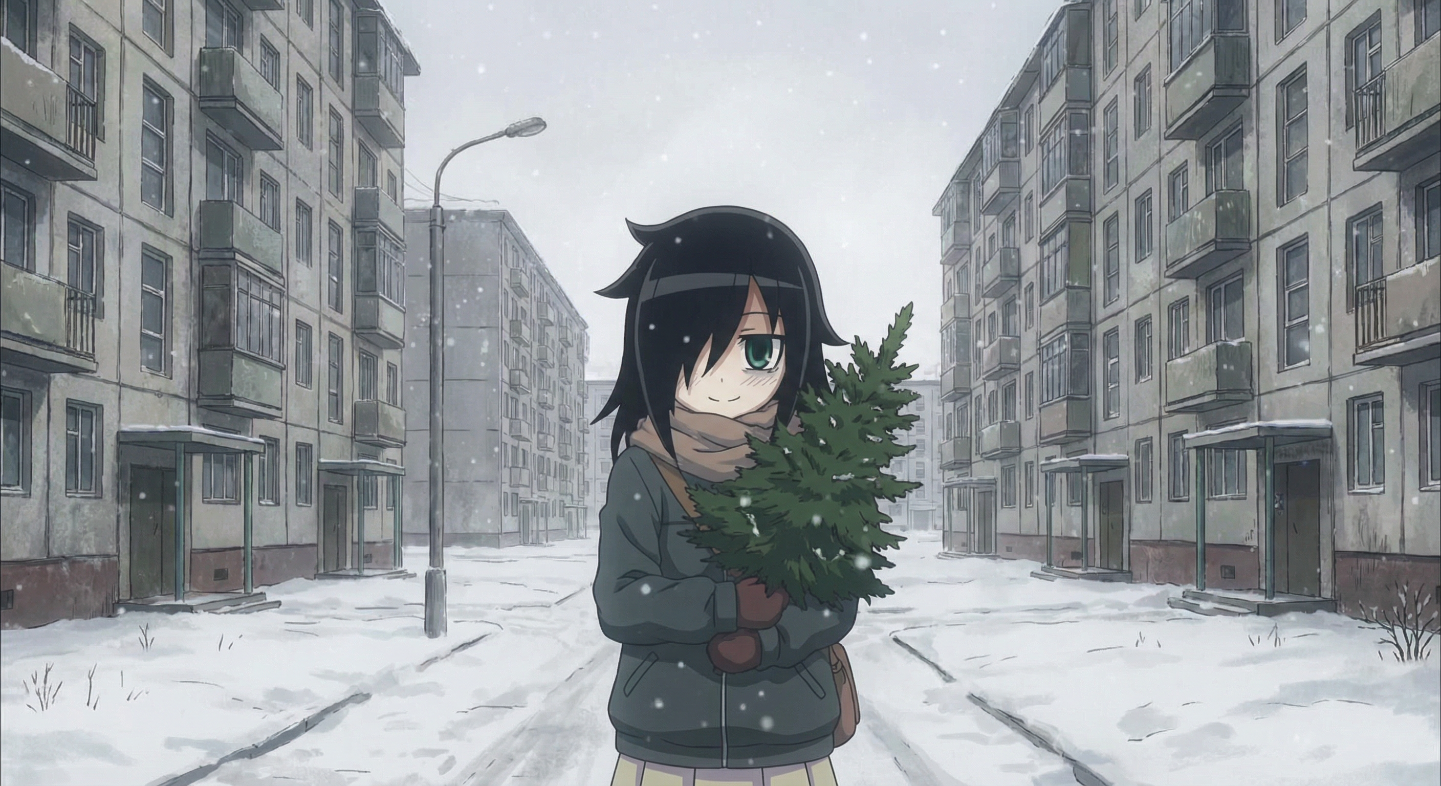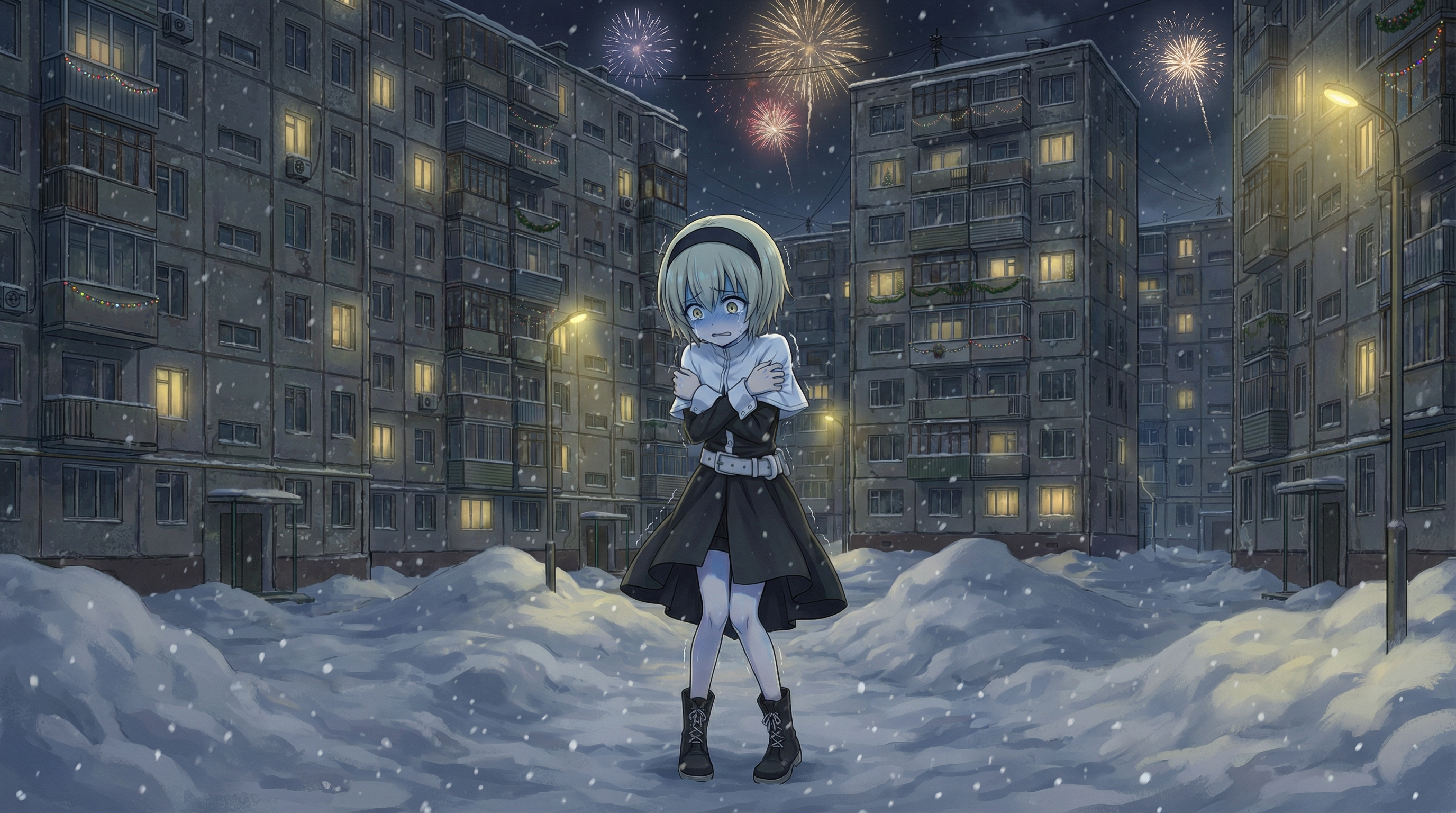 вторая Нагаторо, Томоко Куроки и лягушонок Пепе быстро едут ночью на машине Toyota Camry по полю. Из-под передних колес машины сильно вылетает снег как от пробуксовки. Машина как на загруженной картинке. Машина сильно помятая с полностью отпиленной крышей. Из багажника машины торчит елка. На номере машины надпись sup /b За рулем сидит сильно пьяная Нагаторо, рядом на сиденье сидит Пепе. Нагаторо в новогодней шапке колпаке. Томоко сидит на заднем сиденье. Пепе и Томоко улыбаются. К машине сзади привязана на трос ватрушка тюбинг. Машина тащит тюбинг за собой. В тюбинге находится желтый персонаж как на загруженной картинке. За машиной быстро едет Никита Джигурда на мотоцикле Урал с коляской и кричит "я нормальный!". Рыжие волосы Никиты развеваются на ветру.