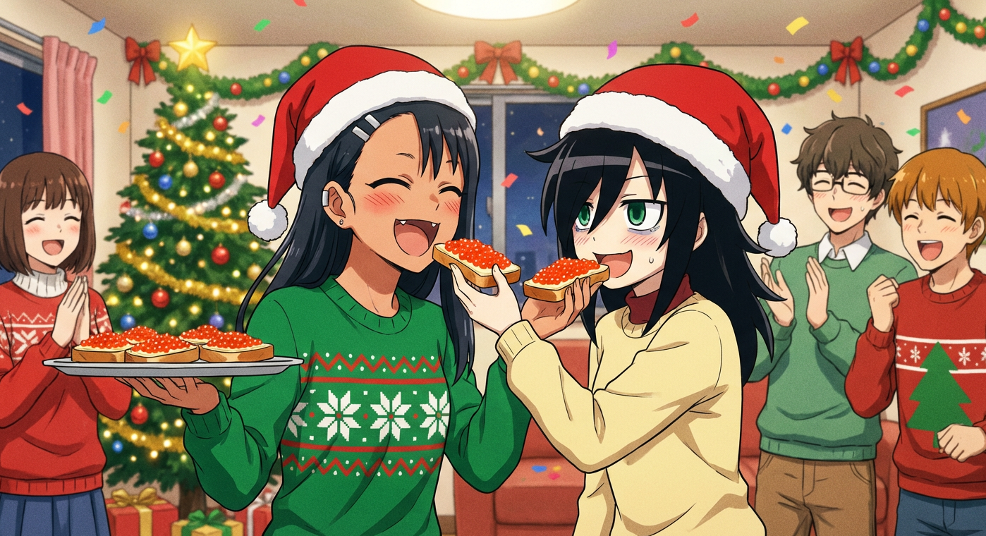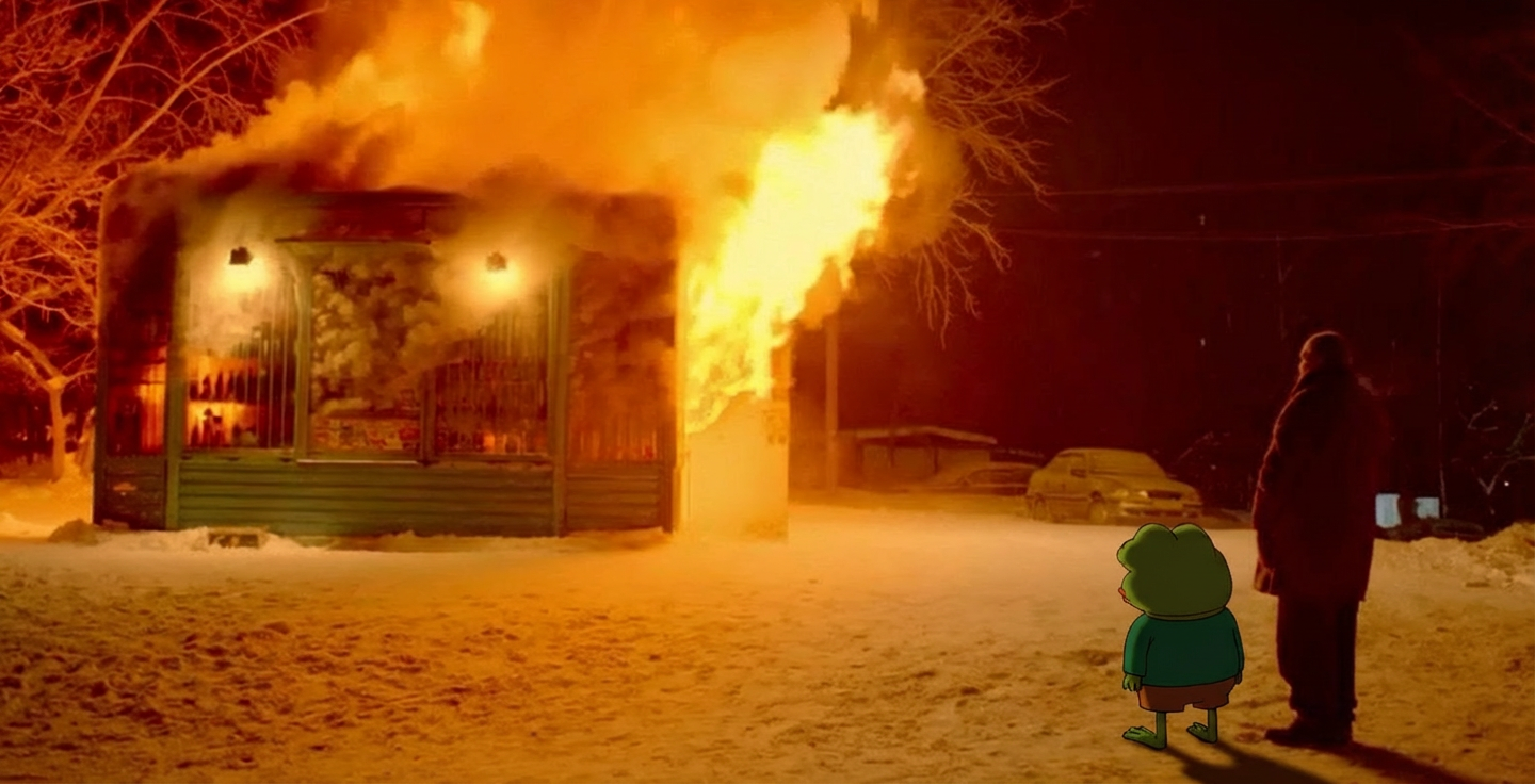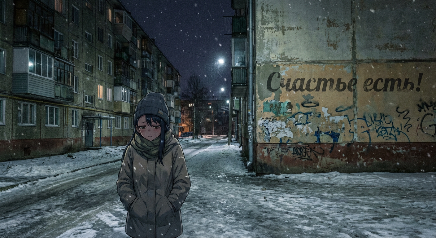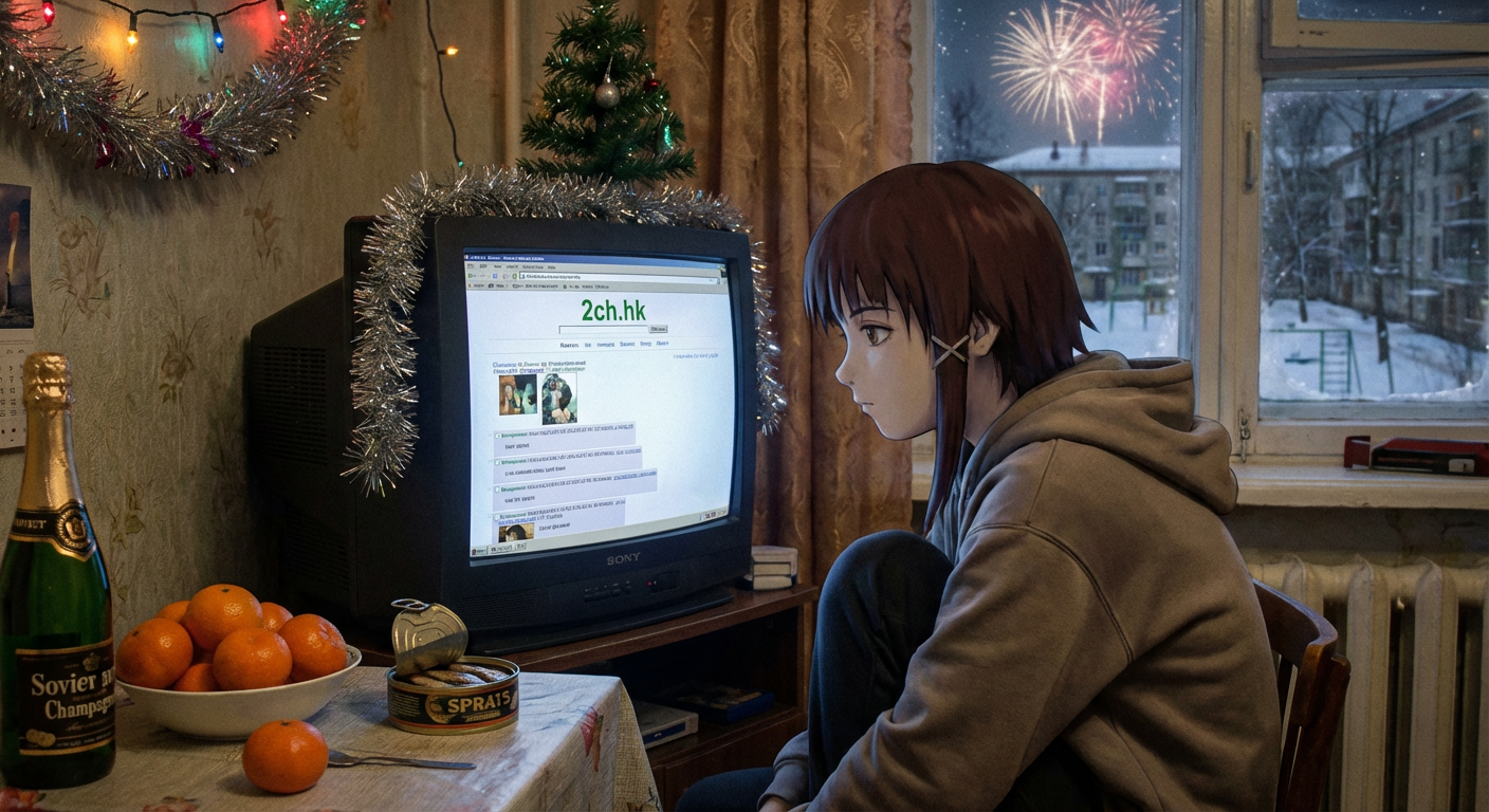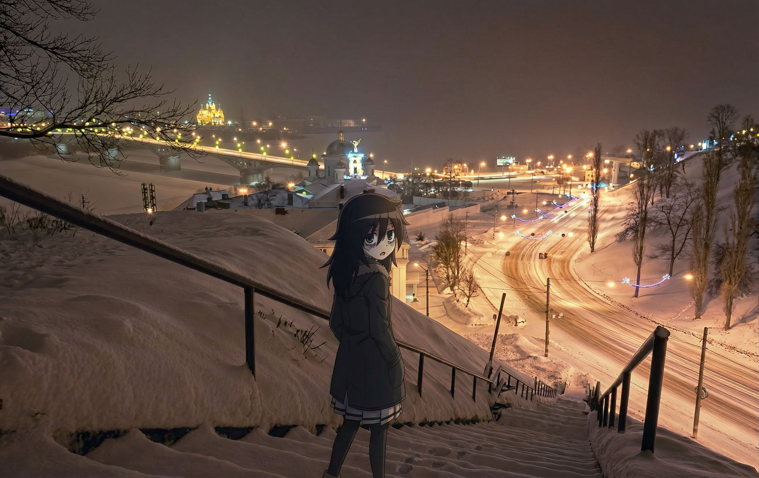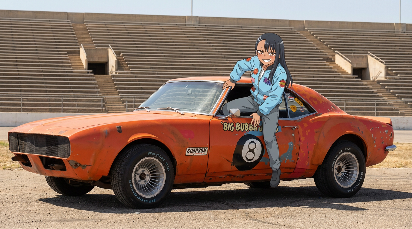 вторая Нагаторо, Томоко Куроки и лягушонок Пепе быстро едут ночью на машине Toyota Camry по полю. Из-под передних колес машины сильно вылетает снег как от пробуксовки. Машина как на загруженной картинке. Машина сильно помятая с полностью отпиленной крышей. Из багажника машины торчит елка. На номере машины надпись sup /b За рулем сидит сильно пьяная Нагаторо, рядом на сиденье сидит Пепе. Нагаторо в новогодней шапке колпаке. Томоко сидит на заднем сиденье. Пепе и Томоко улыбаются. К машине сзади привязана на трос ватрушка тюбинг. Машина тащит тюбинг за собой. В тюбинге находится желтый персонаж как на загруженной картинке. За машиной быстро едет Никита Джигурда на мотоцикле Урал с коляской и кричит "я нормальный!". Рыжие волосы Никиты развеваются на ветру.