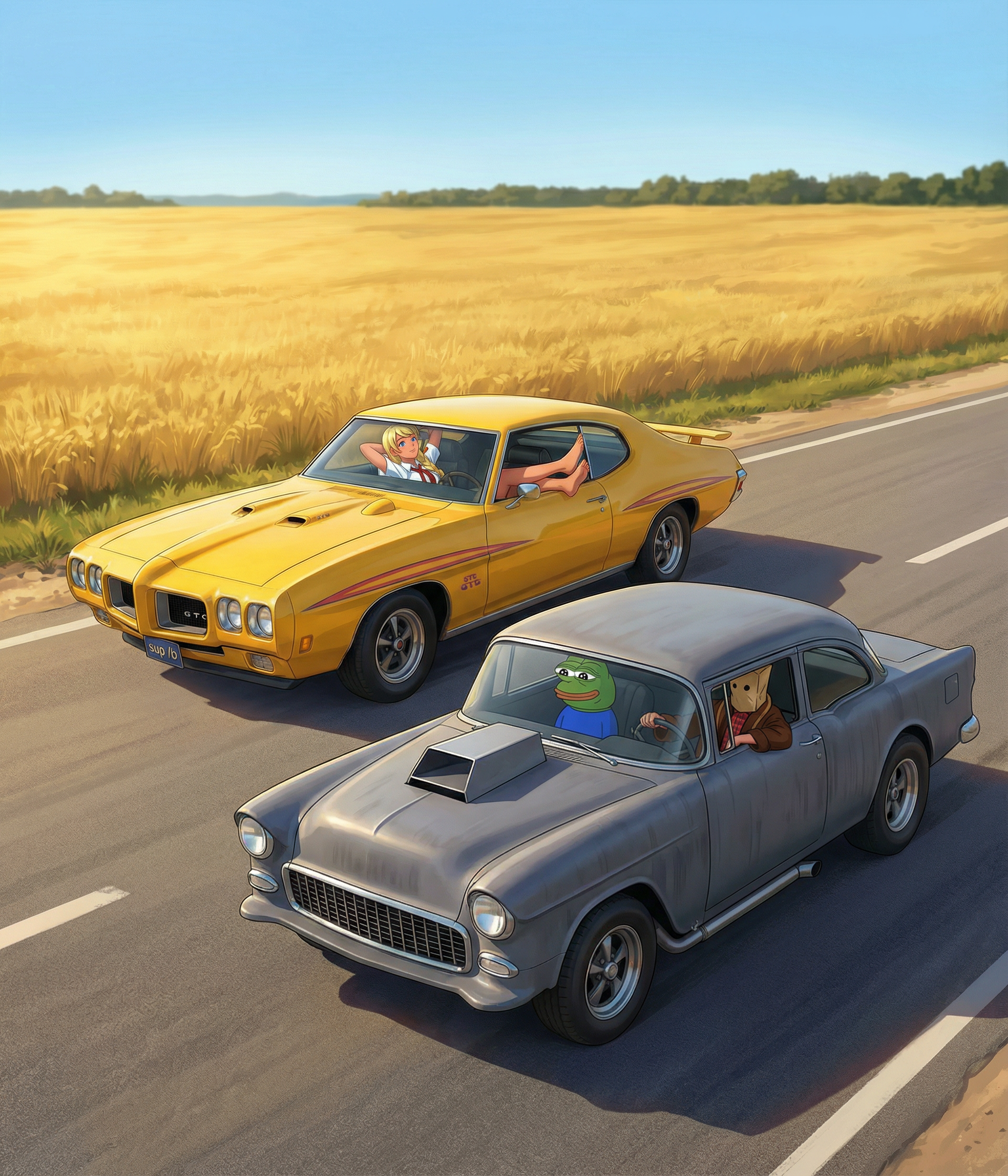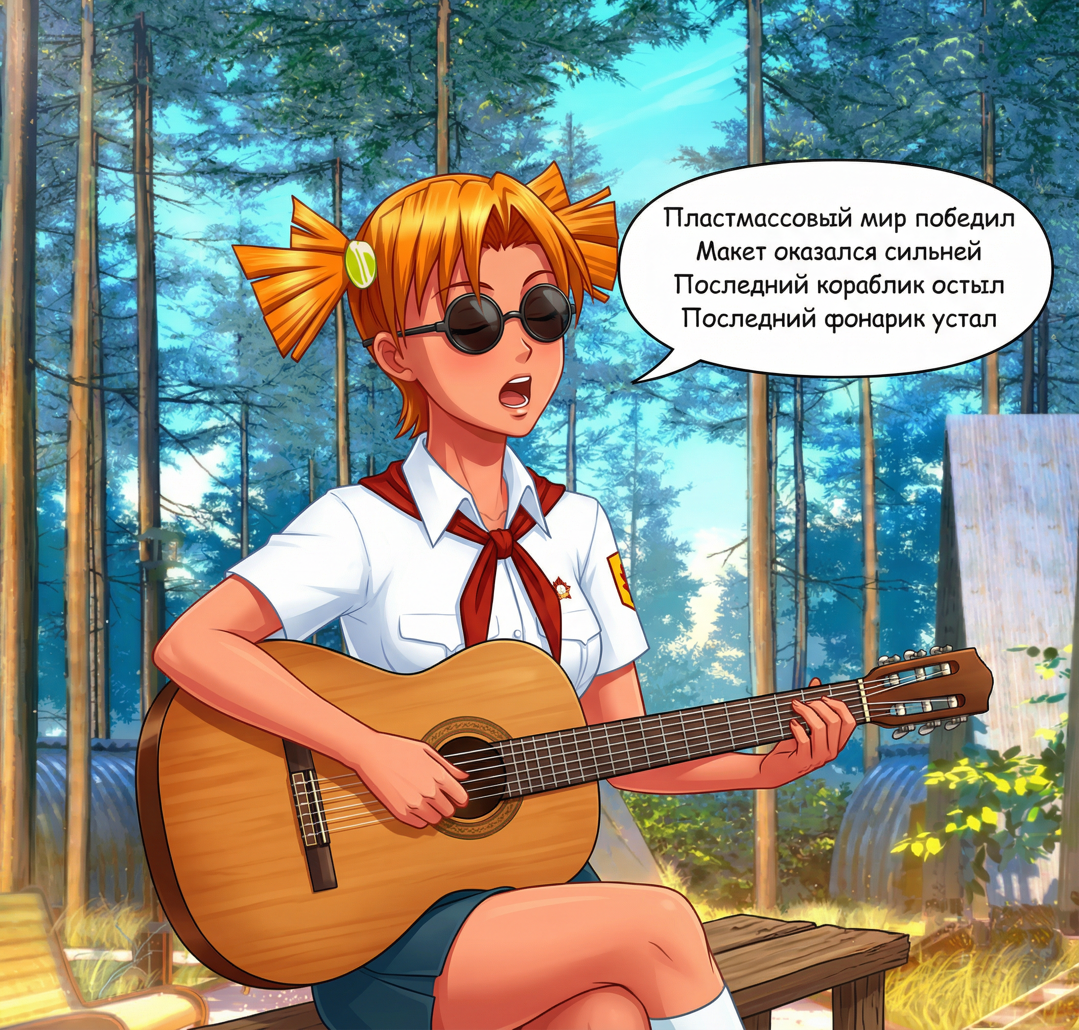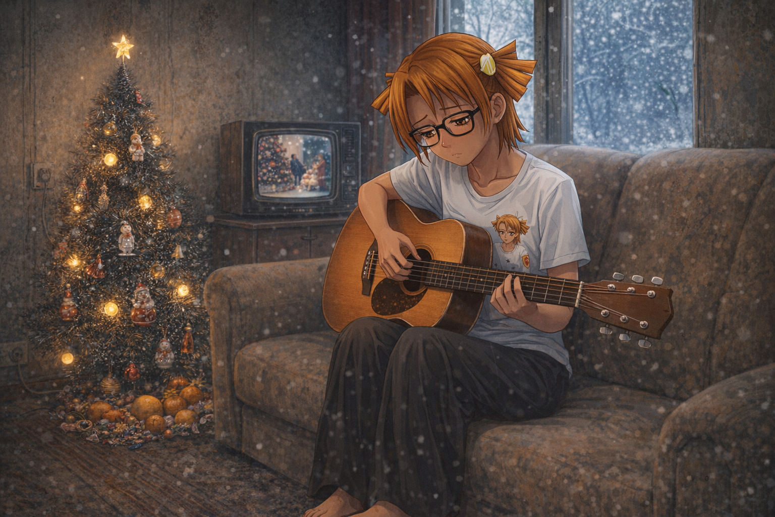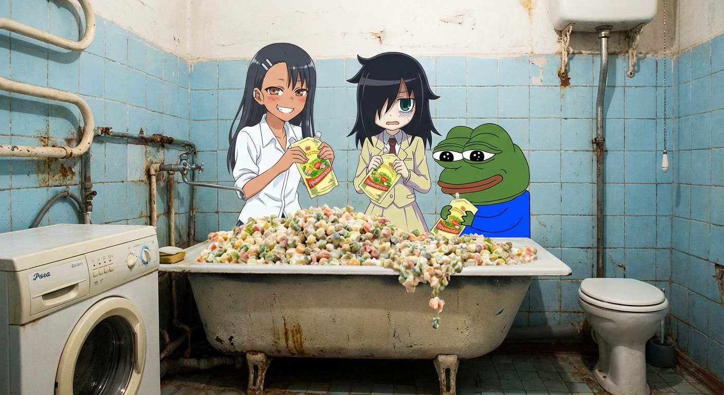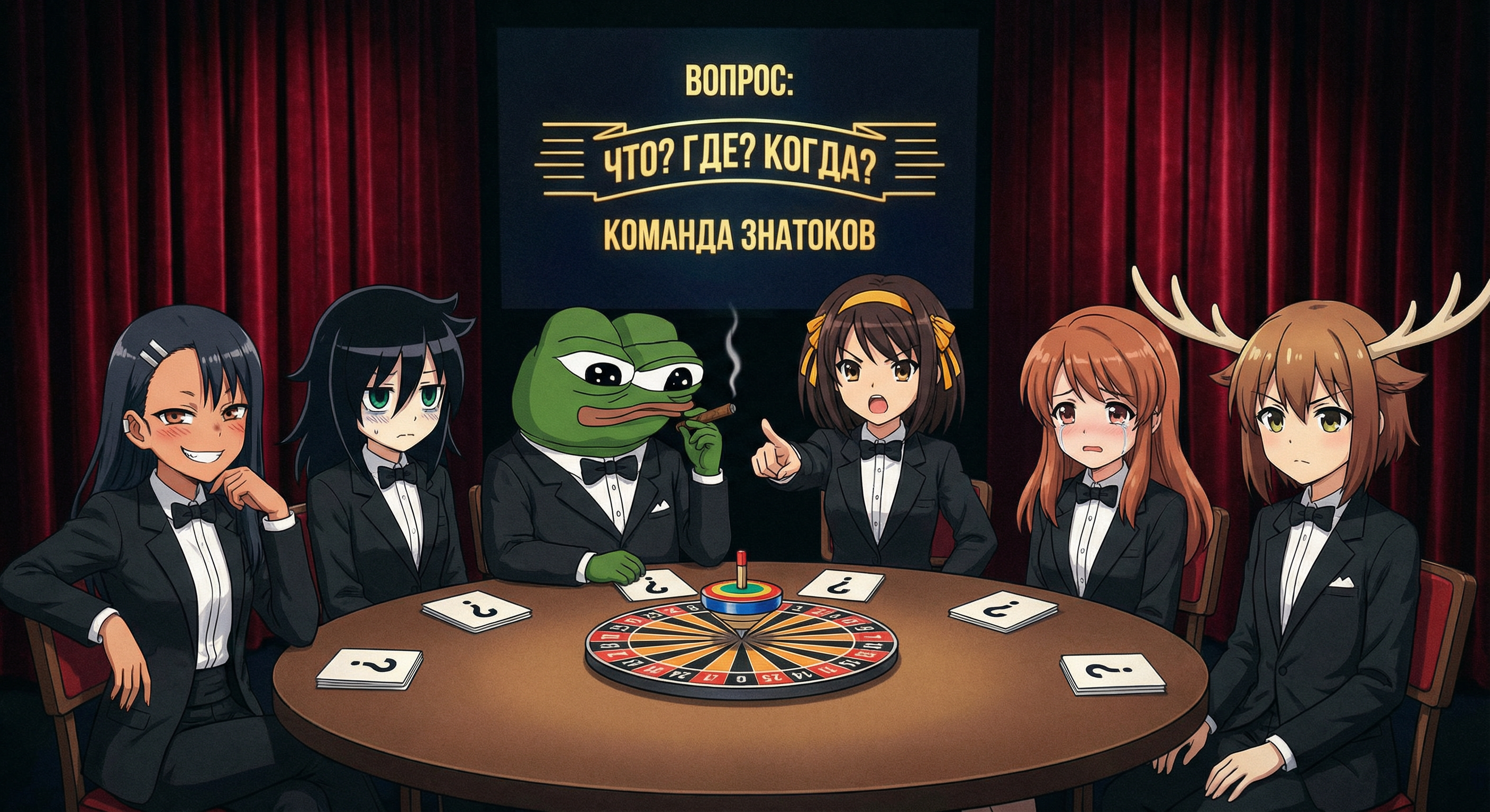 вторая Нагаторо, Томоко Куроки и лягушонок Пепе быстро едут ночью на машине Toyota Camry по полю. Из-под передних колес машины сильно вылетает снег как от пробуксовки. Машина как на загруженной картинке. Машина сильно помятая с полностью отпиленной крышей. Из багажника машины торчит елка. На номере машины надпись sup /b За рулем сидит сильно пьяная Нагаторо, рядом на сиденье сидит Пепе. Нагаторо в новогодней шапке колпаке. Томоко сидит на заднем сиденье. Пепе и Томоко улыбаются. К машине сзади привязана на трос ватрушка тюбинг. Машина тащит тюбинг за собой. В тюбинге находится желтый персонаж как на загруженной картинке. За машиной быстро едет Никита Джигурда на мотоцикле Урал с коляской и кричит "я нормальный!". Рыжие волосы Никиты развеваются на ветру.