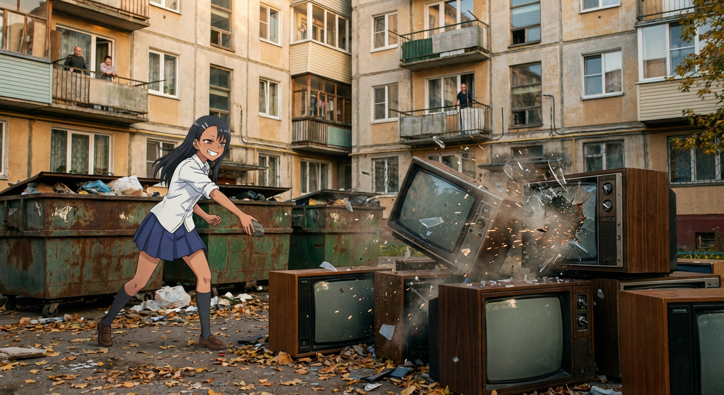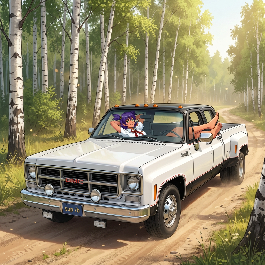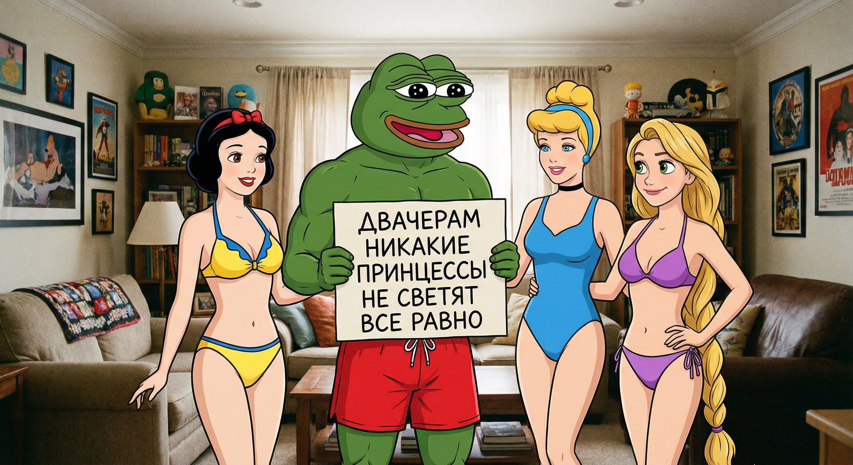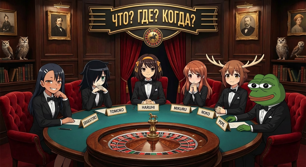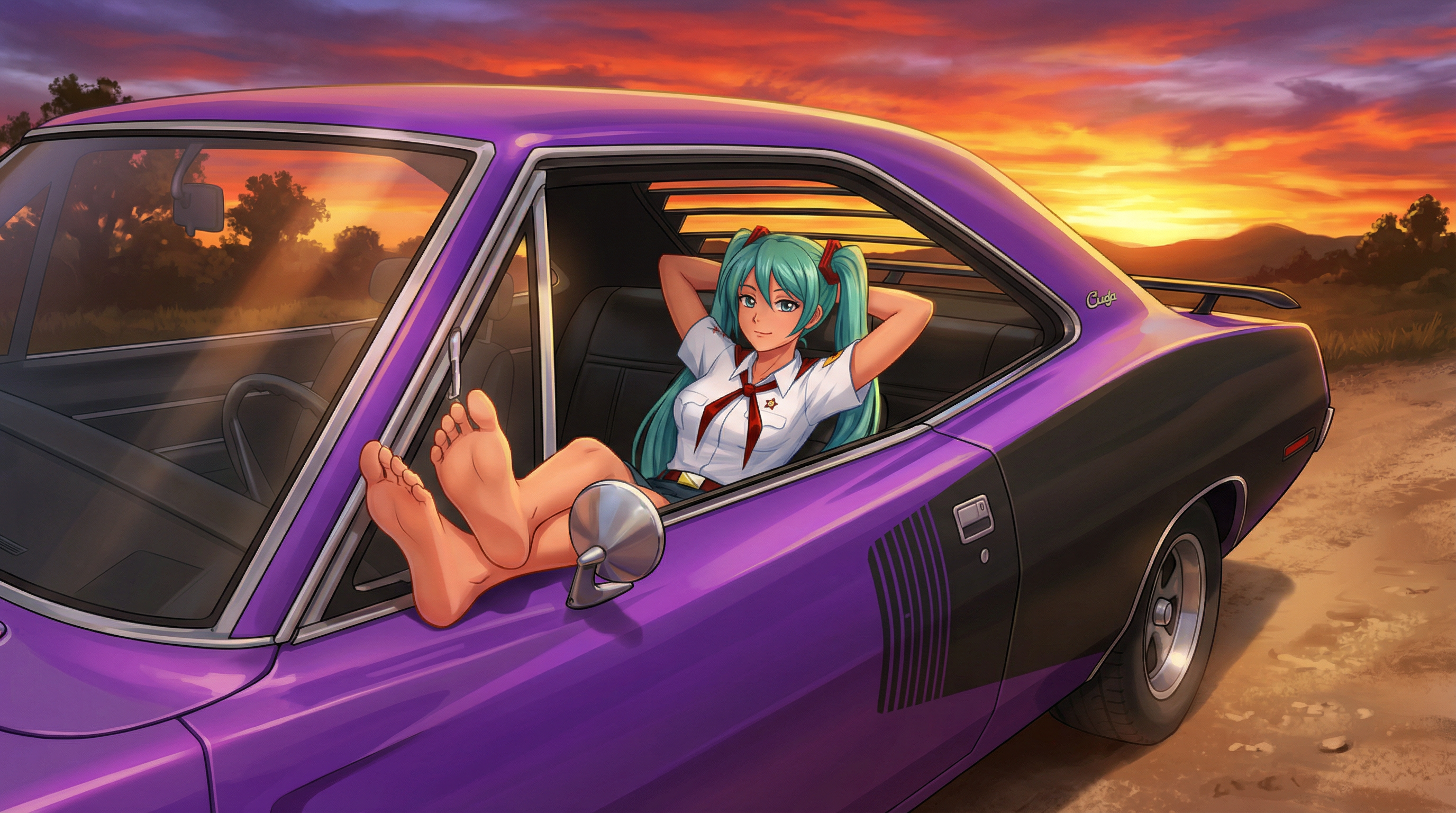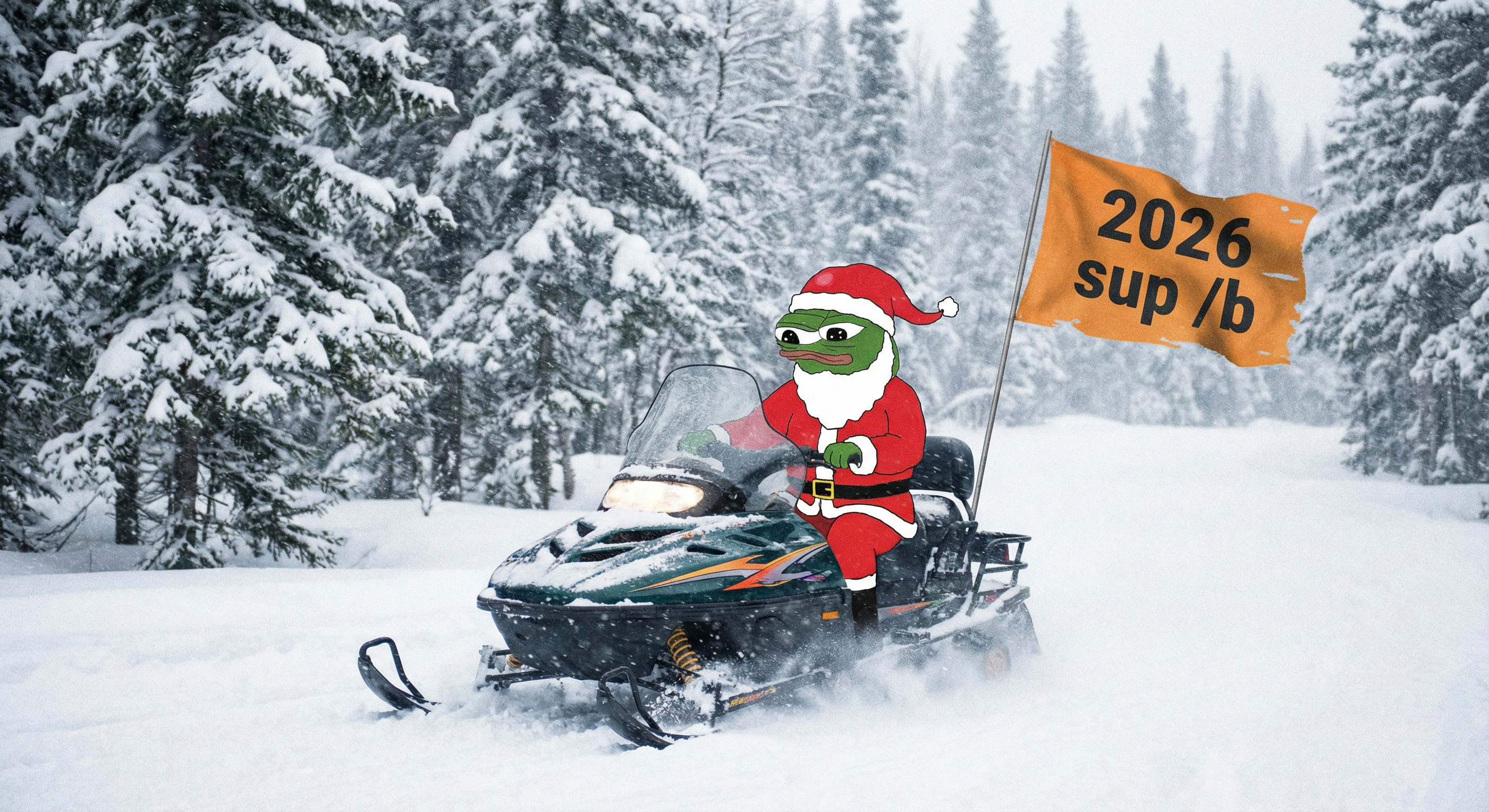 вторая Нагаторо, Томоко Куроки и лягушонок Пепе быстро едут ночью на машине Toyota Camry по полю. Из-под передних колес машины сильно вылетает снег как от пробуксовки. Машина как на загруженной картинке. Машина сильно помятая с полностью отпиленной крышей. Из багажника машины торчит елка. На номере машины надпись sup /b За рулем сидит сильно пьяная Нагаторо, рядом на сиденье сидит Пепе. Нагаторо в новогодней шапке колпаке. Томоко сидит на заднем сиденье. Пепе и Томоко улыбаются. К машине сзади привязана на трос ватрушка тюбинг. Машина тащит тюбинг за собой. В тюбинге находится желтый персонаж как на загруженной картинке. За машиной быстро едет Никита Джигурда на мотоцикле Урал с коляской и кричит "я нормальный!". Рыжие волосы Никиты развеваются на ветру.