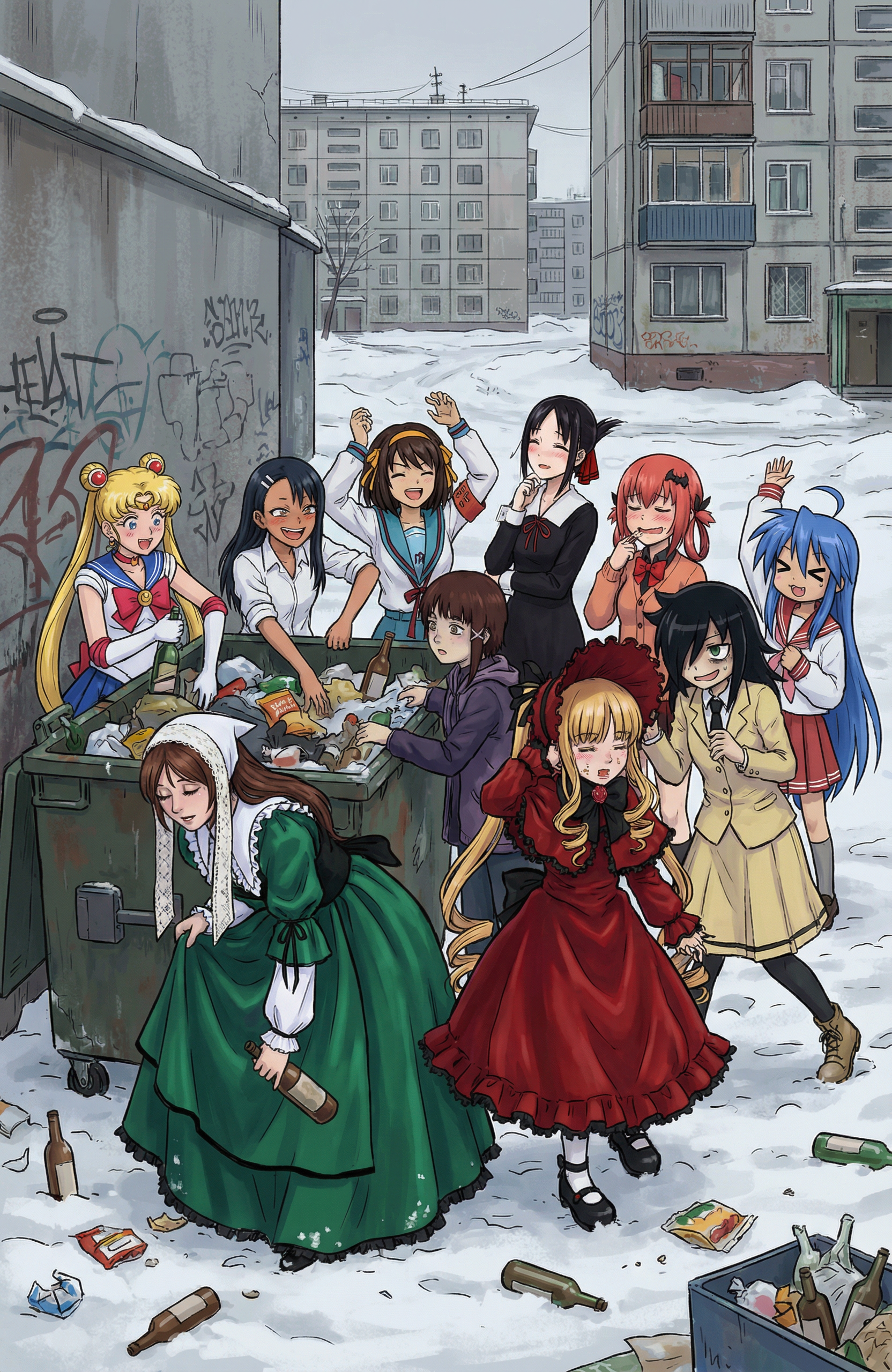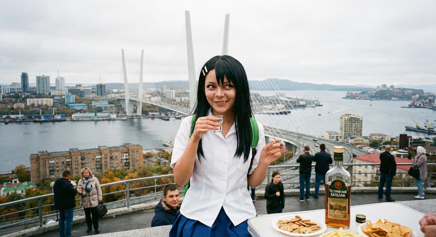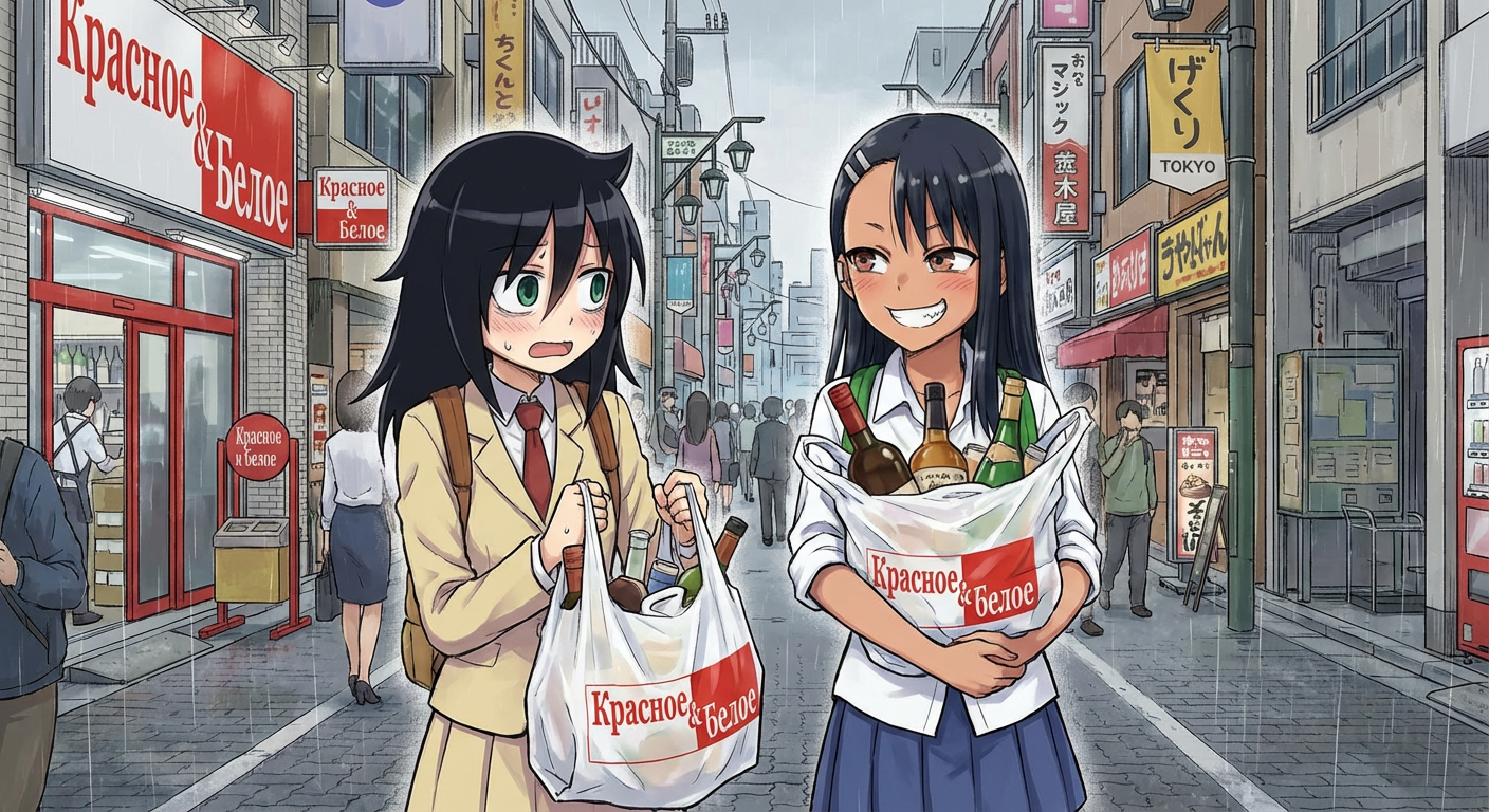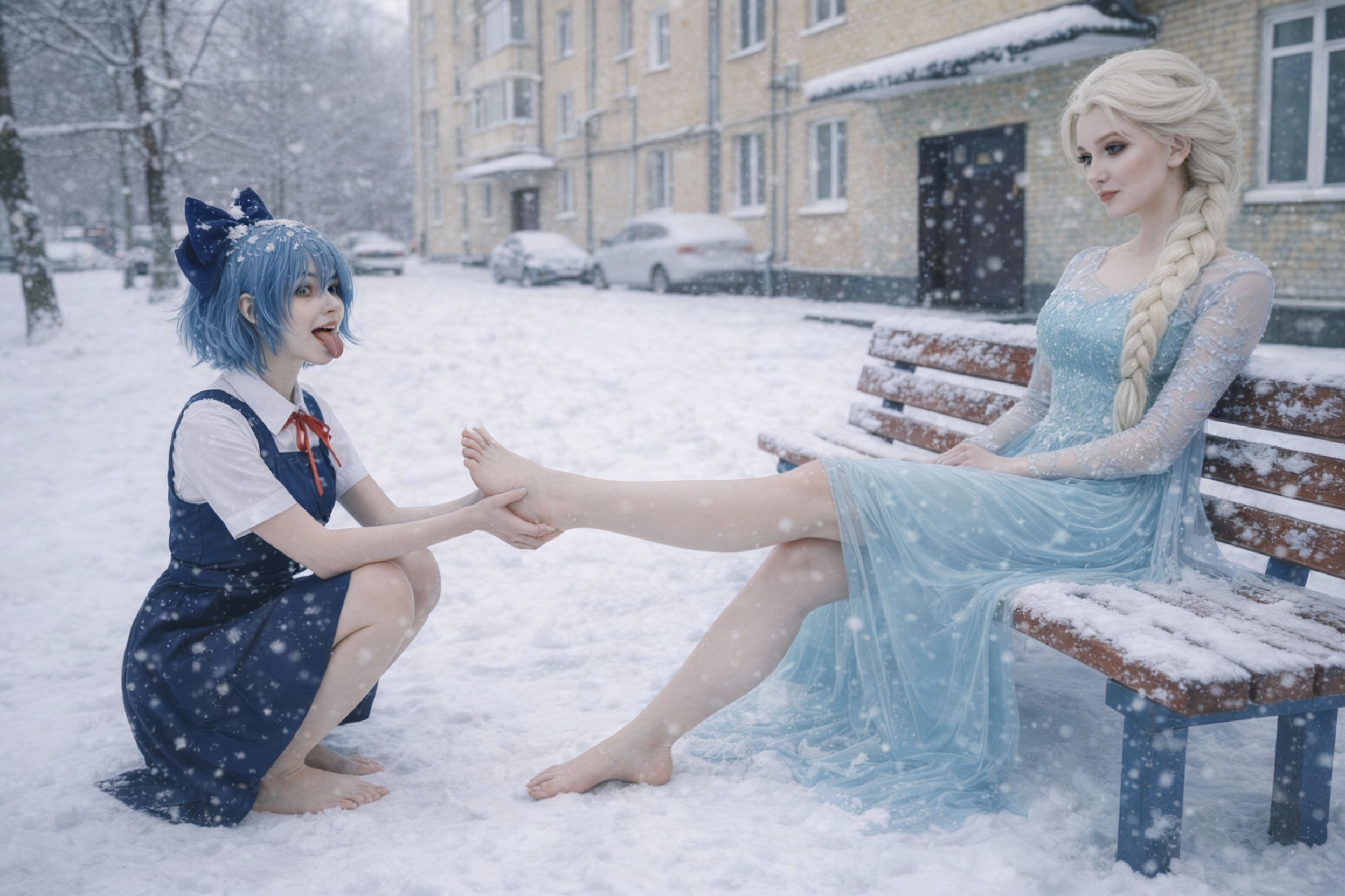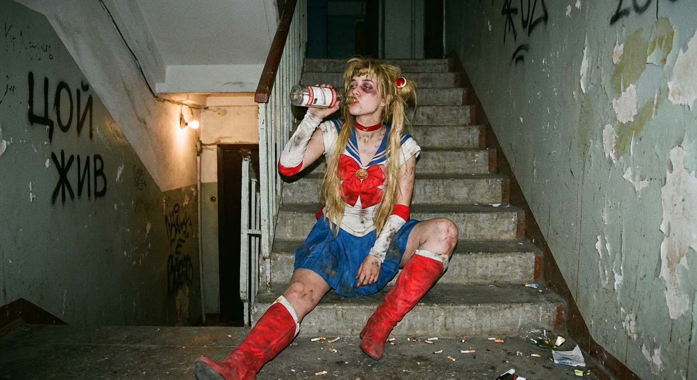 вторая Нагаторо, Томоко Куроки и лягушонок Пепе быстро едут ночью на машине Toyota Camry по полю. Из-под передних колес машины сильно вылетает снег как от пробуксовки. Машина как на загруженной картинке. Машина сильно помятая с полностью отпиленной крышей. Из багажника машины торчит елка. На номере машины надпись sup /b За рулем сидит сильно пьяная Нагаторо, рядом на сиденье сидит Пепе. Нагаторо в новогодней шапке колпаке. Томоко сидит на заднем сиденье. Пепе и Томоко улыбаются. К машине сзади привязана на трос ватрушка тюбинг. Машина тащит тюбинг за собой. В тюбинге находится желтый персонаж как на загруженной картинке. За машиной быстро едет Никита Джигурда на мотоцикле Урал с коляской и кричит "я нормальный!". Рыжие волосы Никиты развеваются на ветру.