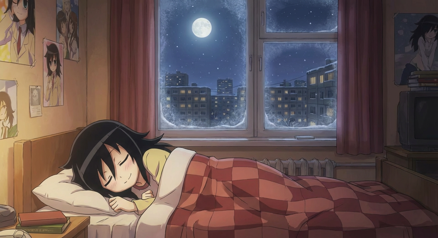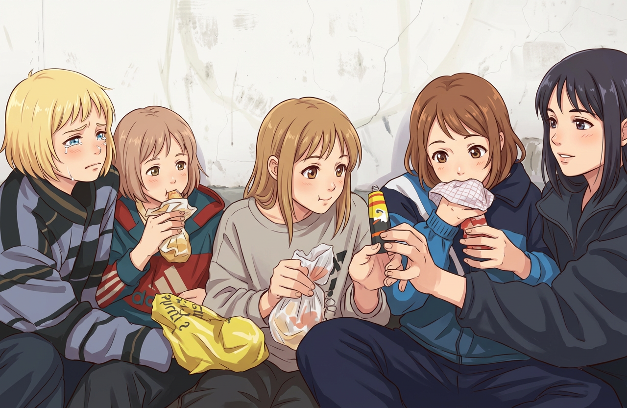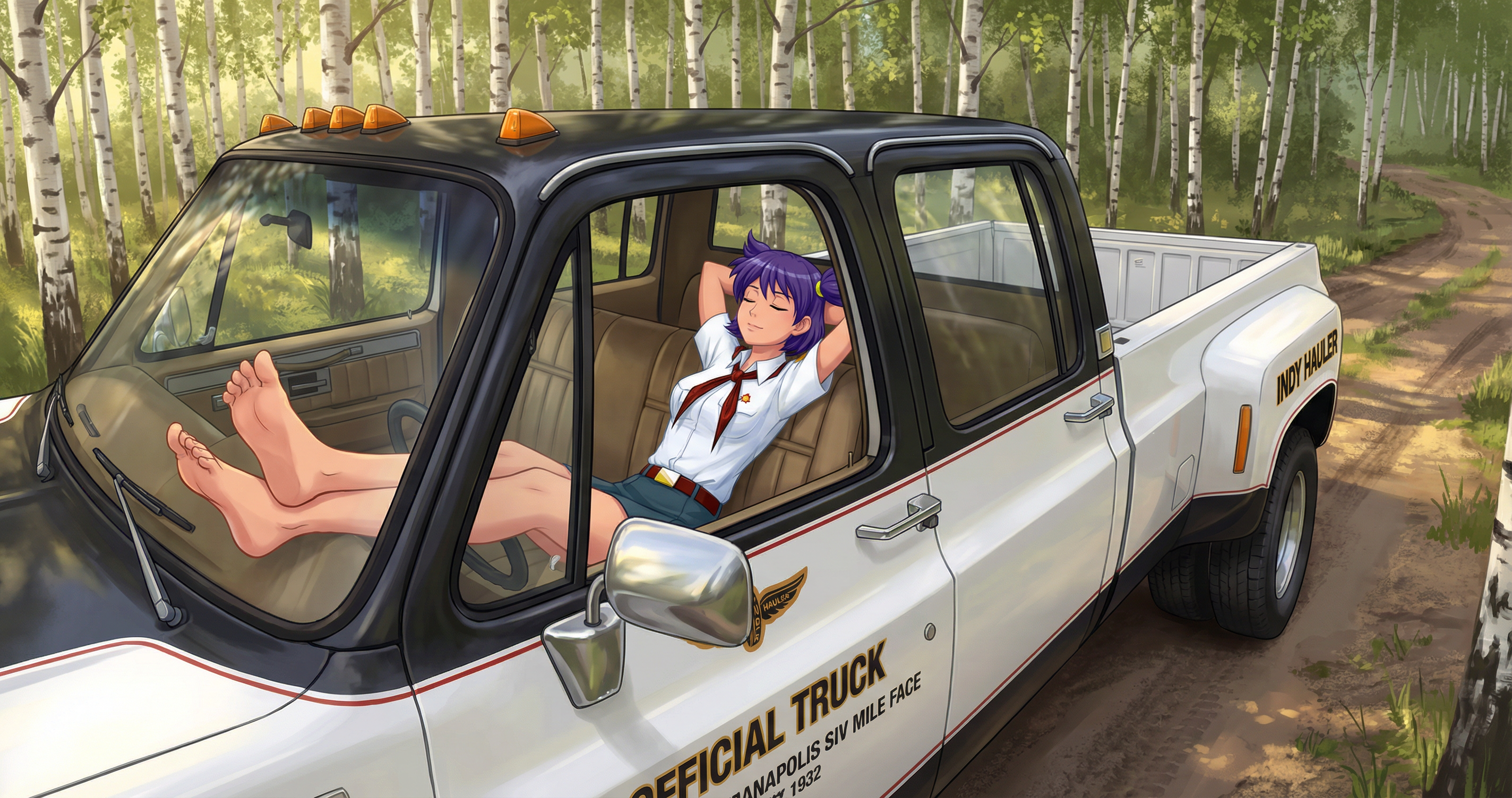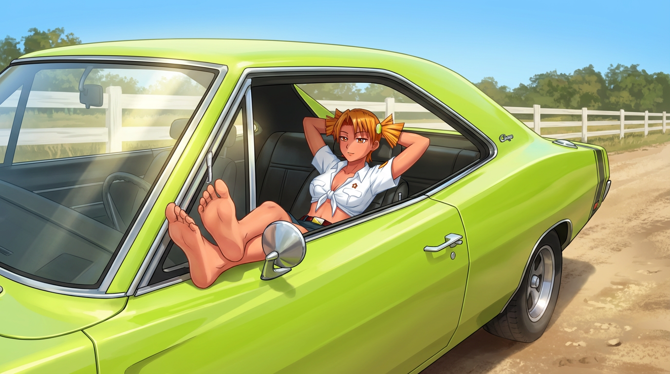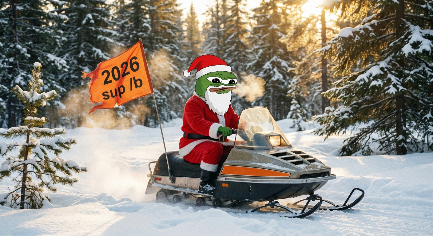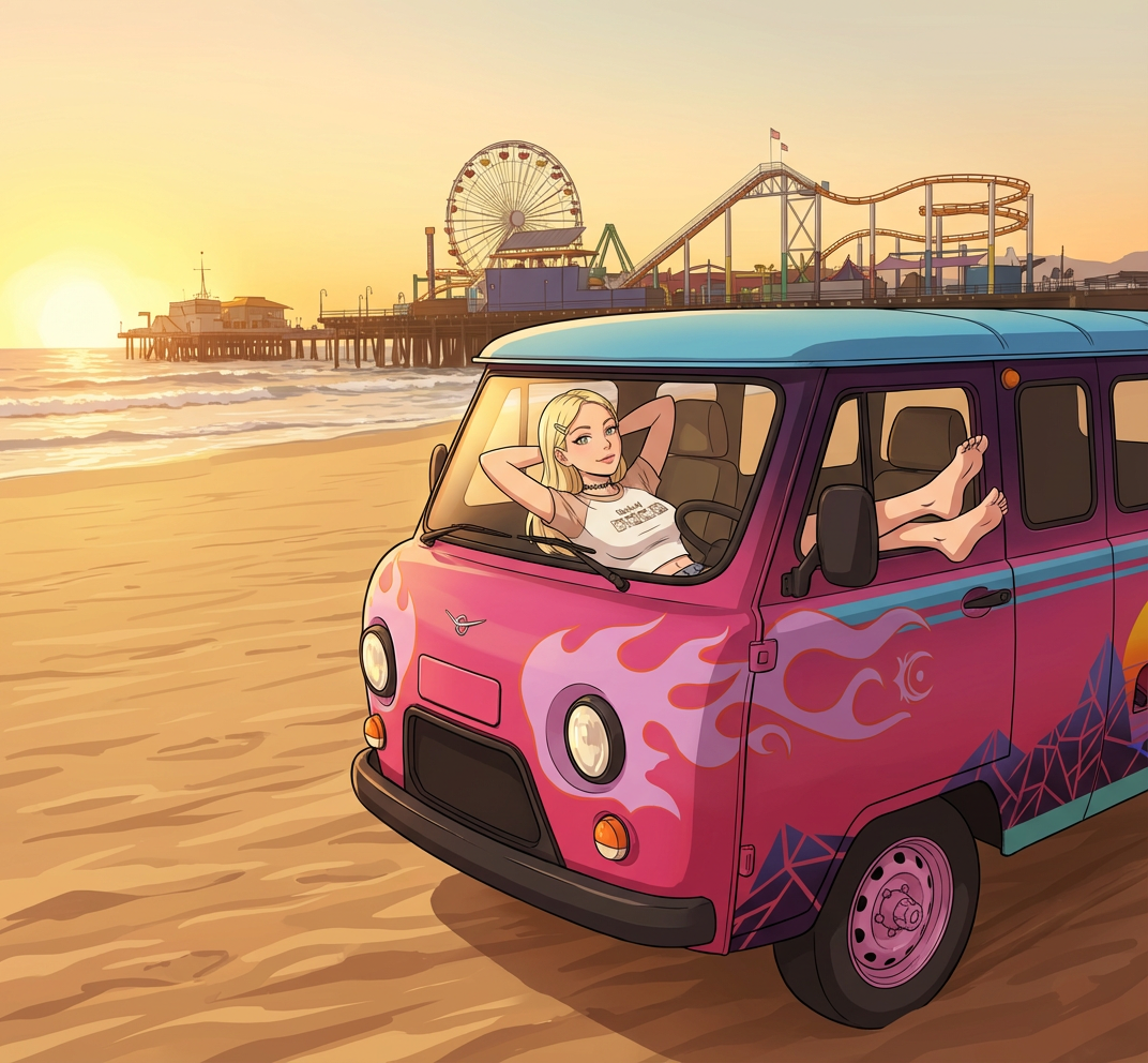 вторая Нагаторо, Томоко Куроки и лягушонок Пепе быстро едут ночью на машине Toyota Camry по полю. Из-под передних колес машины сильно вылетает снег как от пробуксовки. Машина как на загруженной картинке. Машина сильно помятая с полностью отпиленной крышей. Из багажника машины торчит елка. На номере машины надпись sup /b За рулем сидит сильно пьяная Нагаторо, рядом на сиденье сидит Пепе. Нагаторо в новогодней шапке колпаке. Томоко сидит на заднем сиденье. Пепе и Томоко улыбаются. К машине сзади привязана на трос ватрушка тюбинг. Машина тащит тюбинг за собой. В тюбинге находится желтый персонаж как на загруженной картинке. За машиной быстро едет Никита Джигурда на мотоцикле Урал с коляской и кричит "я нормальный!". Рыжие волосы Никиты развеваются на ветру.