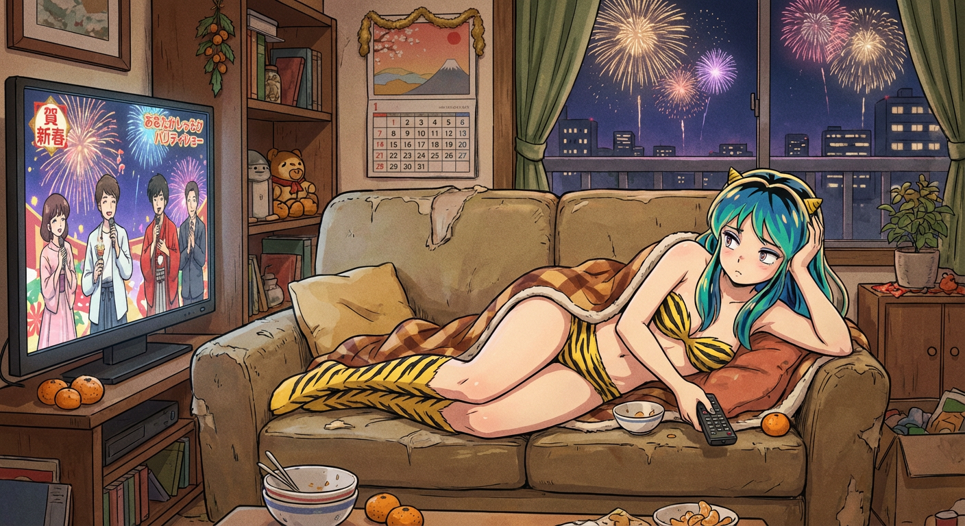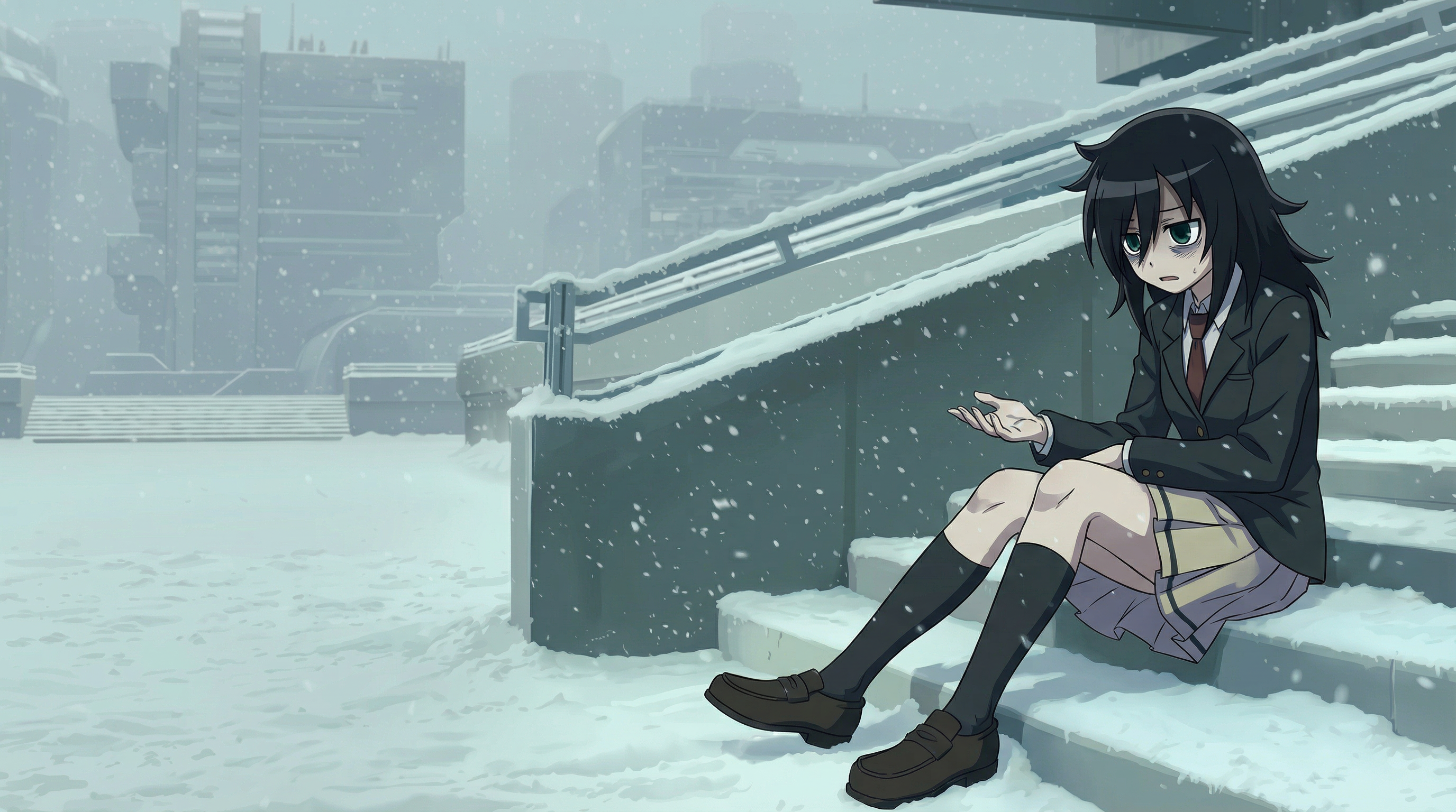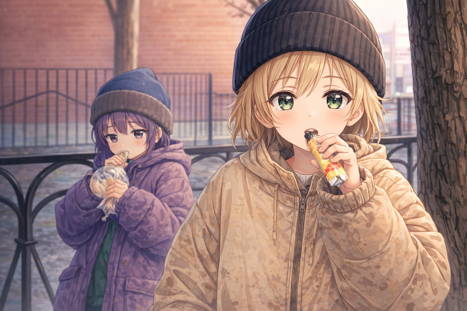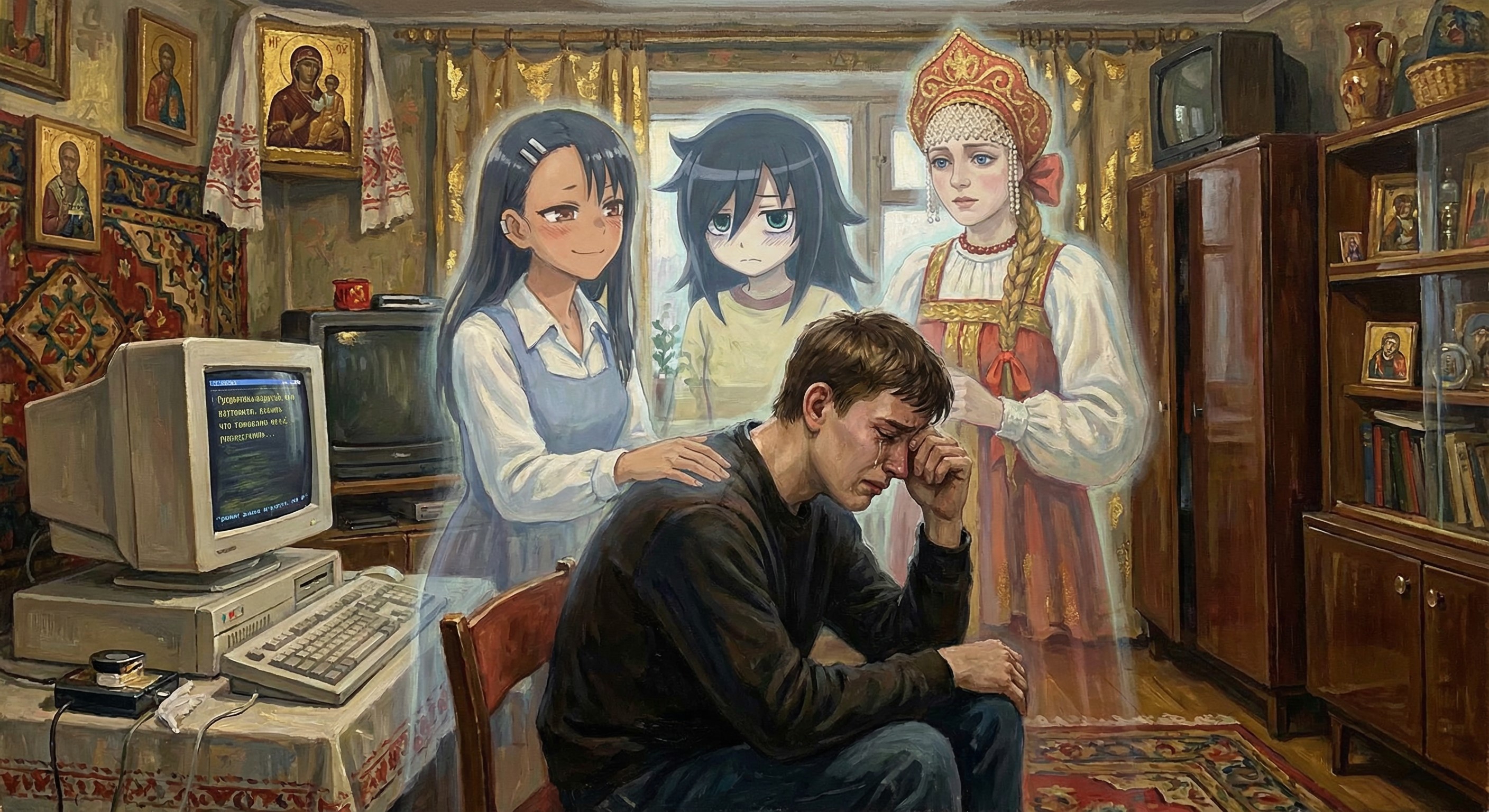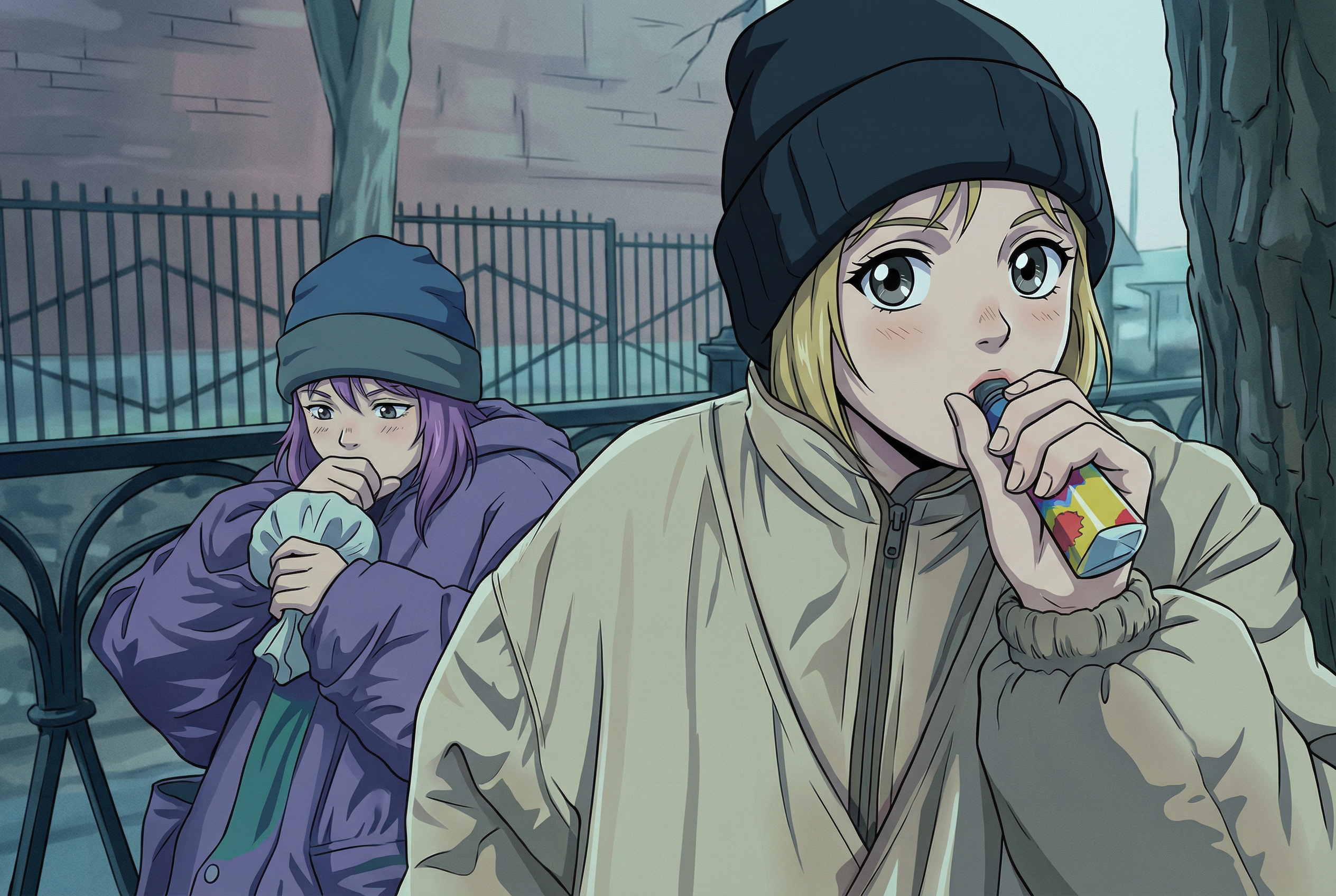 вторая Нагаторо, Томоко Куроки и лягушонок Пепе быстро едут ночью на машине Toyota Camry по полю. Из-под передних колес машины сильно вылетает снег как от пробуксовки. Машина как на загруженной картинке. Машина сильно помятая с полностью отпиленной крышей. Из багажника машины торчит елка. На номере машины надпись sup /b За рулем сидит сильно пьяная Нагаторо, рядом на сиденье сидит Пепе. Нагаторо в новогодней шапке колпаке. Томоко сидит на заднем сиденье. Пепе и Томоко улыбаются. К машине сзади привязана на трос ватрушка тюбинг. Машина тащит тюбинг за собой. В тюбинге находится желтый персонаж как на загруженной картинке. За машиной быстро едет Никита Джигурда на мотоцикле Урал с коляской и кричит "я нормальный!". Рыжие волосы Никиты развеваются на ветру.