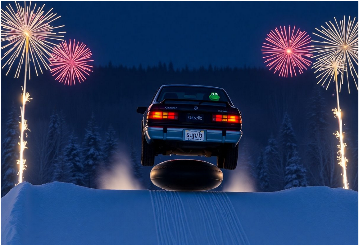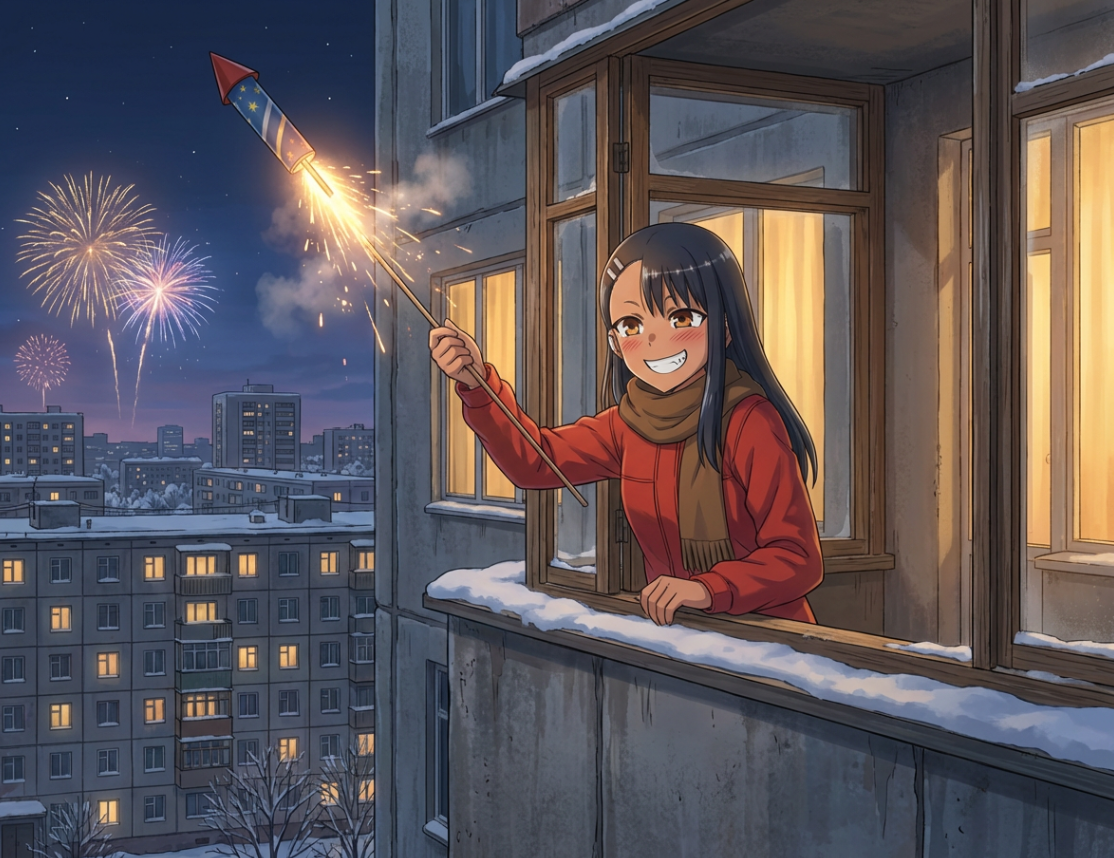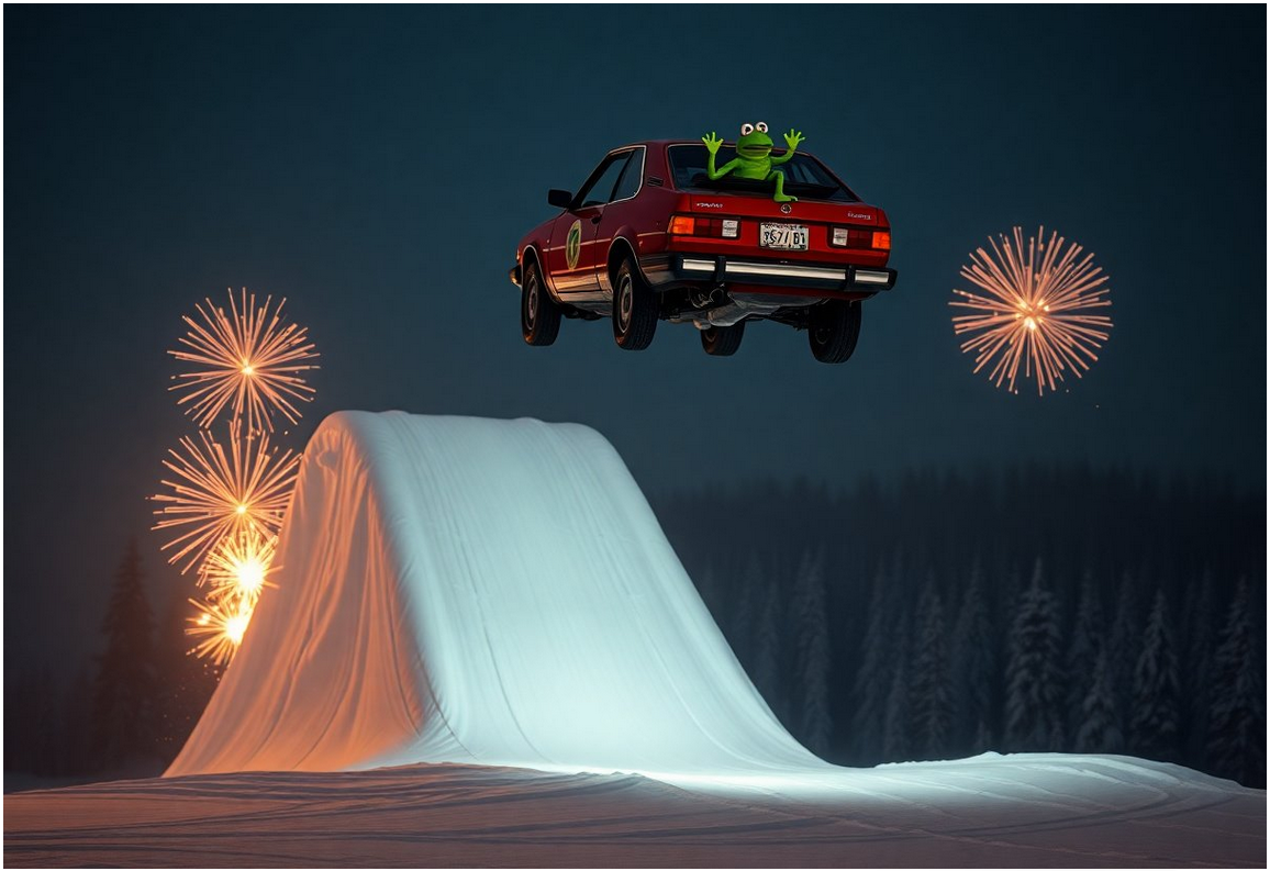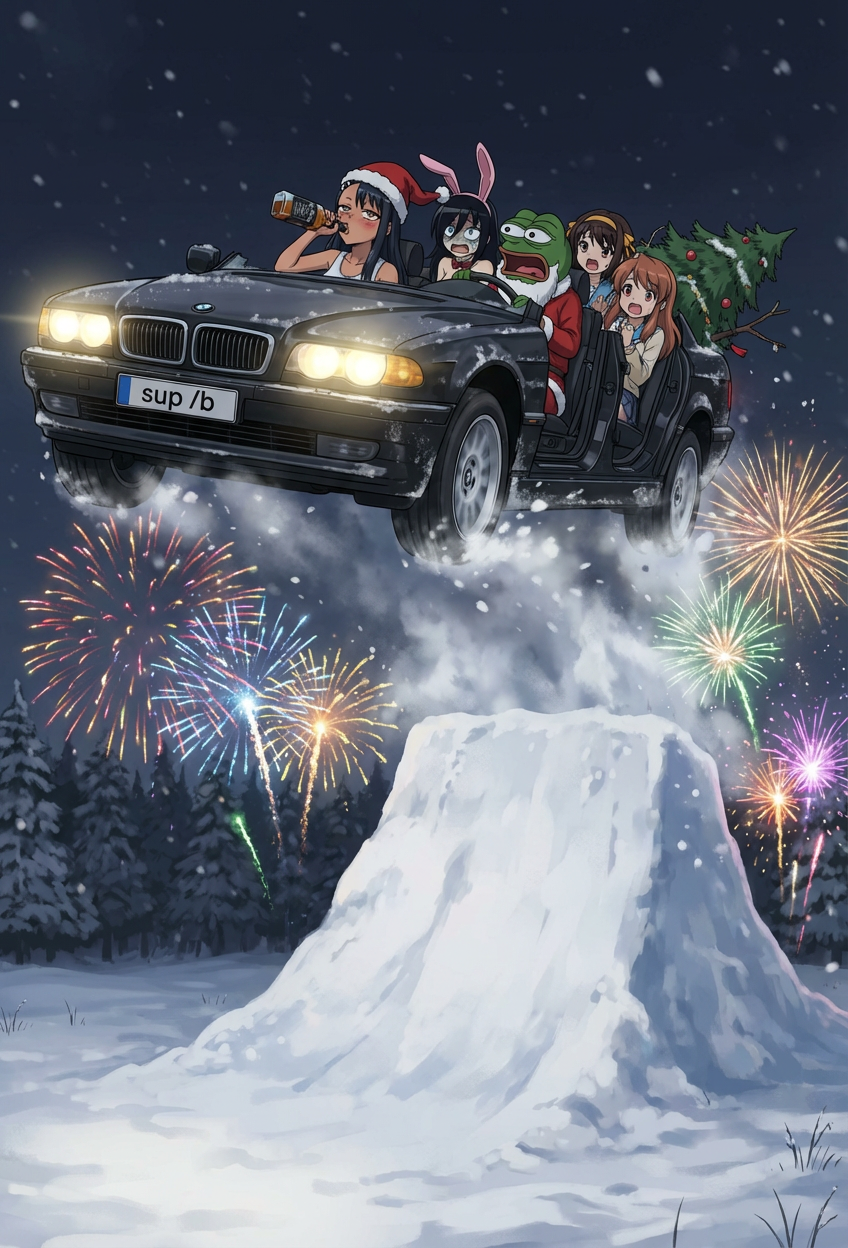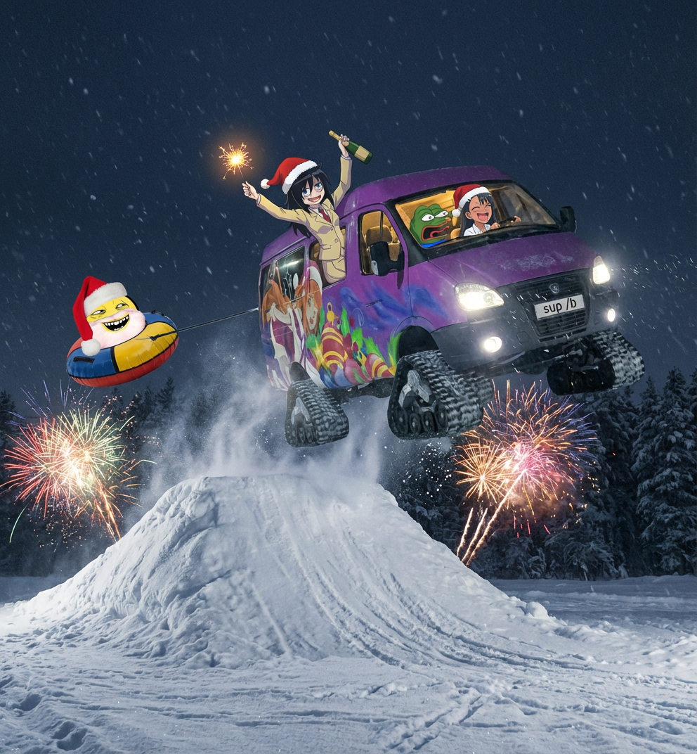 третья Нагаторо и лягушонок Пепе ночью на автомобиле Газель прыгают с очень высокого снежного трамплина. Автомобиль как на загруженном изображении. На номере машины надпись sup /b Трамплин в заснеженном поле, на заднем плане заснеженный лес. Стоп кадр как машина уже проехала весь трамплин и находится в оздухе. По бокам трамплина новогодние фейерверки. К машине сзади привязана на трос ватрушка тюбинг. Машина тащит тюбинг за собой. Тюбинг как и машина находится в воздухе. В тюбинге находится желтый персонаж как на загруженной картинке. За рулем сидит веселая пьяная Нагаторо, рядом на сиденье сидит Пепе. Нагаторо в новогодней шапке колпаке. Пепе орет в панике. Из люка на крыше газели высовывается веселая пьяная Томоко Куроки с бенгальским огнем в одной руке и бутылкой шампанского в другой.