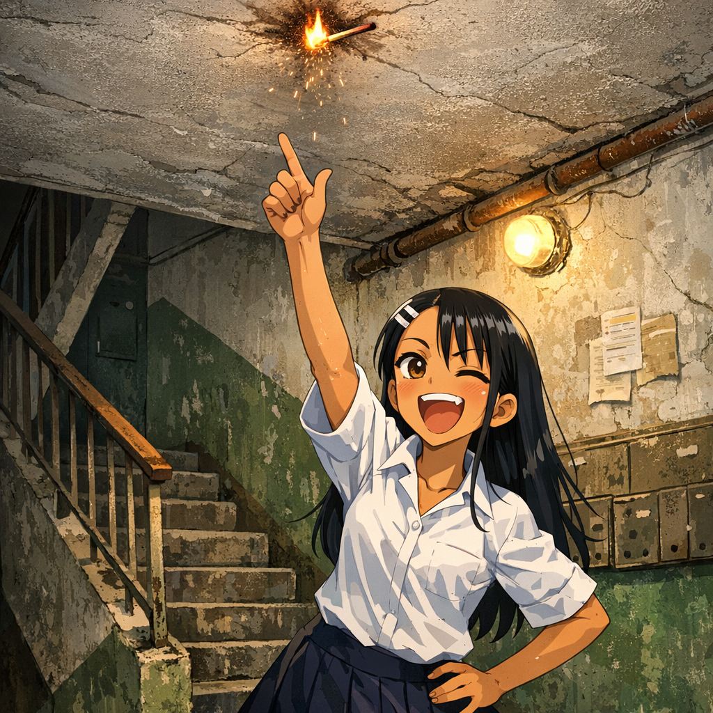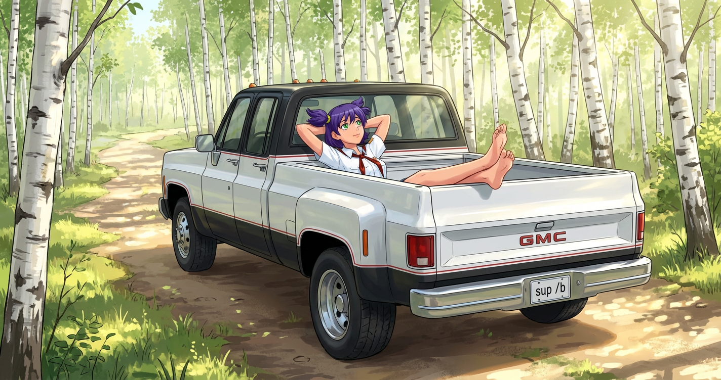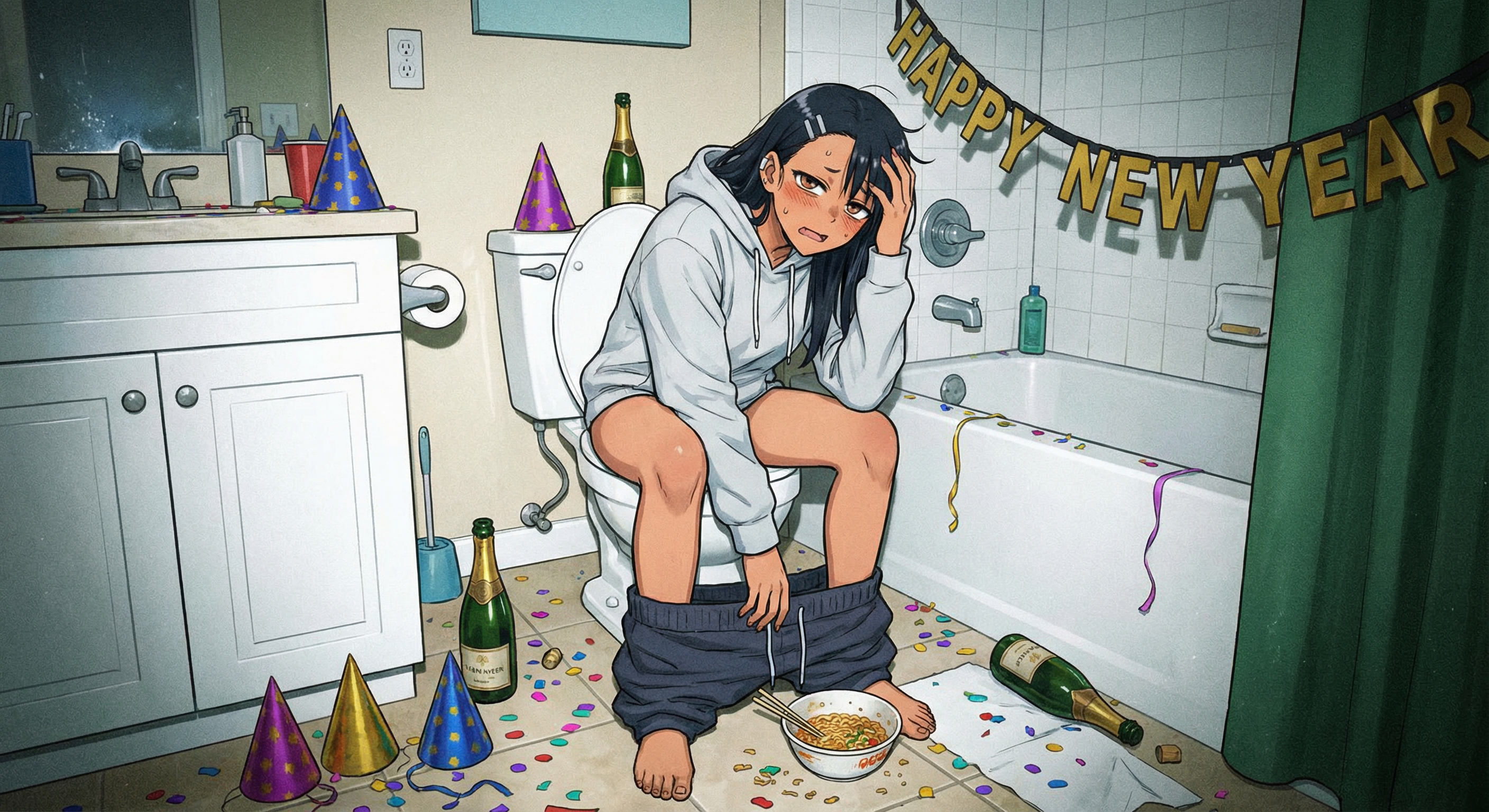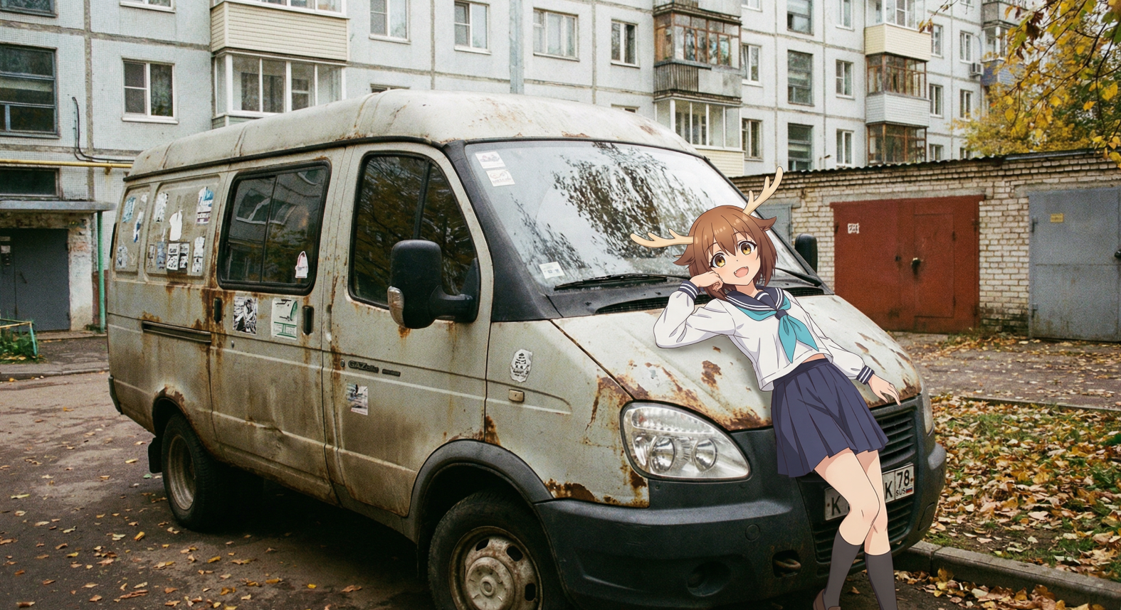 третья Нагаторо и лягушонок Пепе ночью на автомобиле Газель прыгают с очень высокого снежного трамплина. Автомобиль как на загруженном изображении. На номере машины надпись sup /b Трамплин в заснеженном поле, на заднем плане заснеженный лес. Стоп кадр как машина уже проехала весь трамплин и находится в оздухе. По бокам трамплина новогодние фейерверки. К машине сзади привязана на трос ватрушка тюбинг. Машина тащит тюбинг за собой. Тюбинг как и машина находится в воздухе. В тюбинге находится желтый персонаж как на загруженной картинке. За рулем сидит веселая пьяная Нагаторо, рядом на сиденье сидит Пепе. Нагаторо в новогодней шапке колпаке. Пепе орет в панике. Из люка на крыше газели высовывается веселая пьяная Томоко Куроки с бенгальским огнем в одной руке и бутылкой шампанского в другой.
