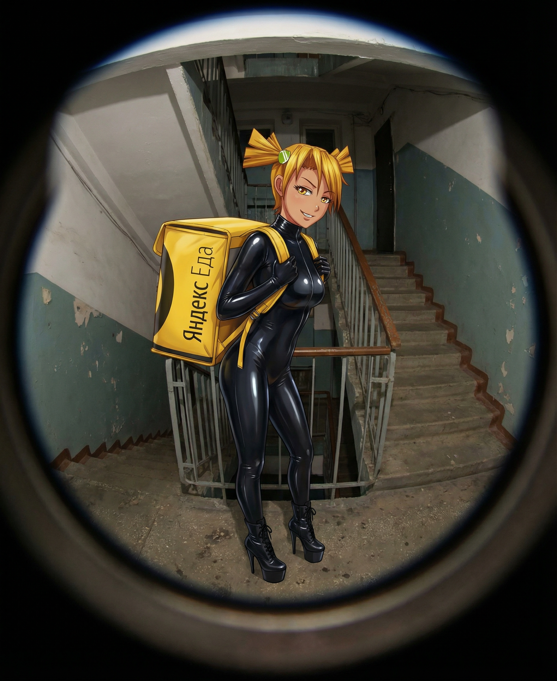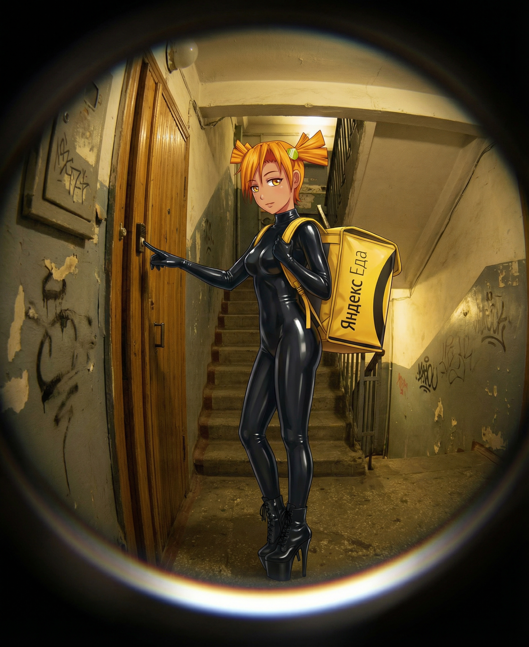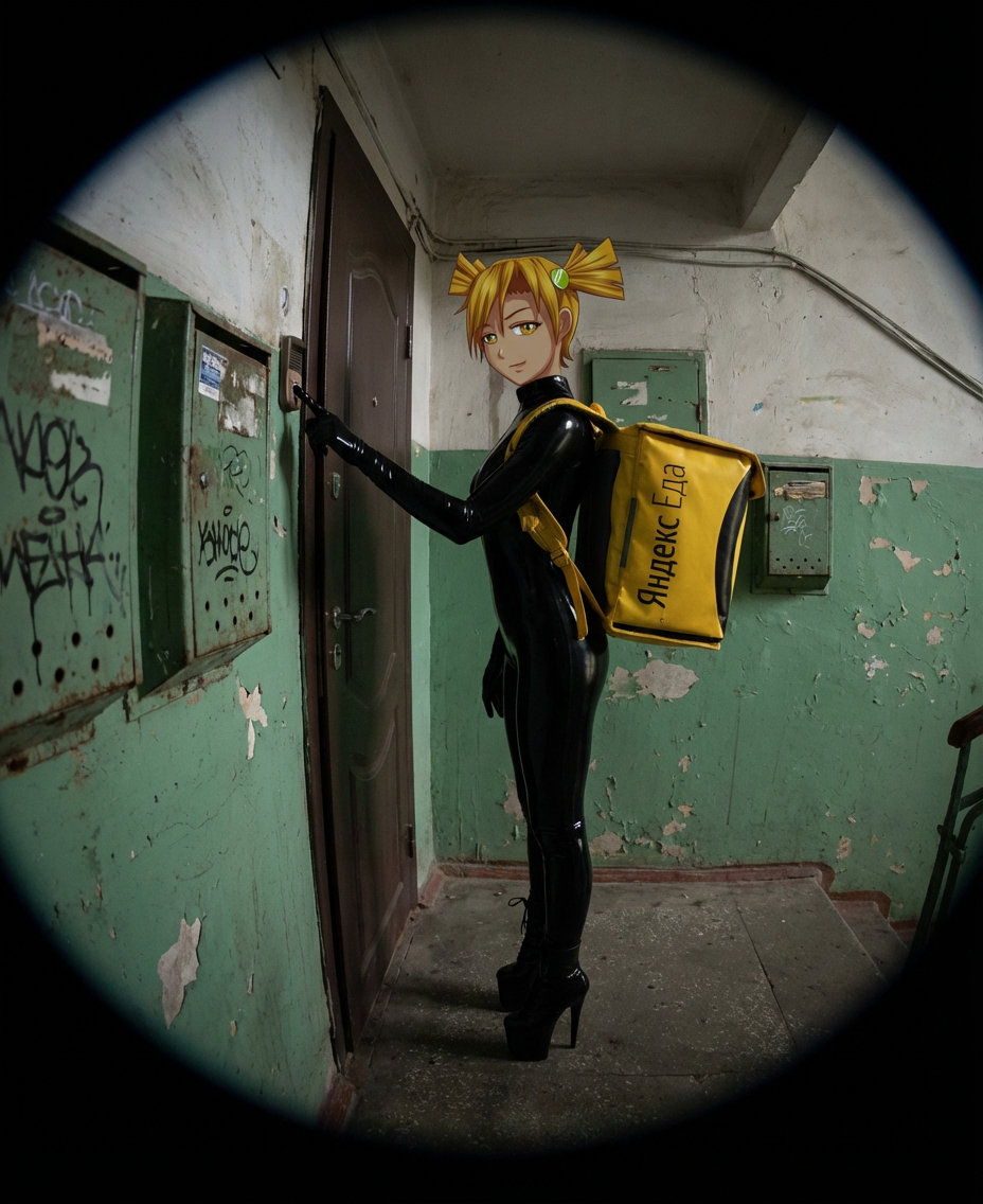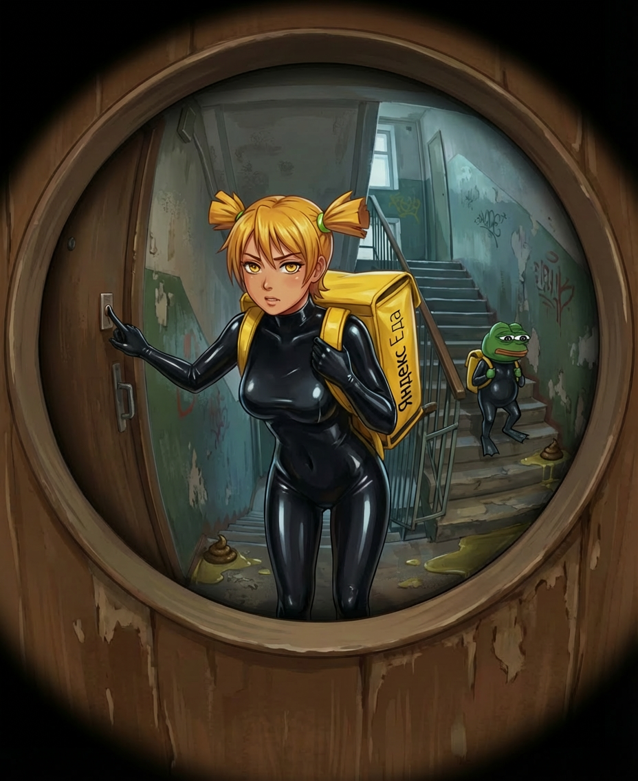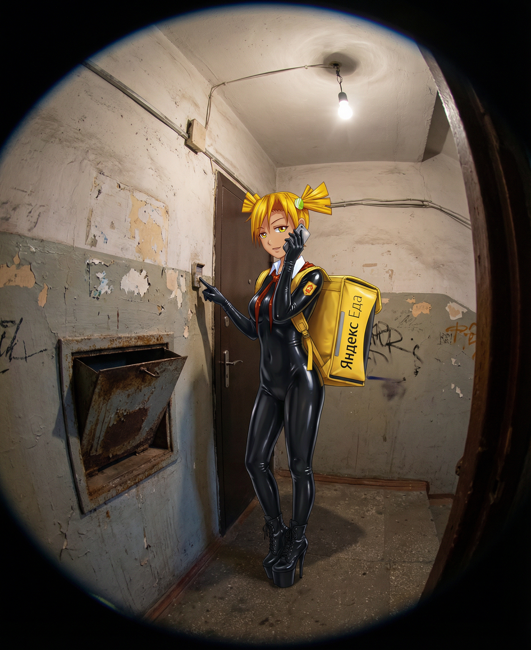 >>328693226 (OP) А можете сделать вид через глазок на лестничную клетку хрущевки, там стоит Алиса а костюме пикрил с рюкзаком Яндекс доставки и звонит в дверь.