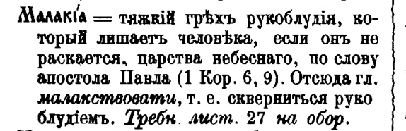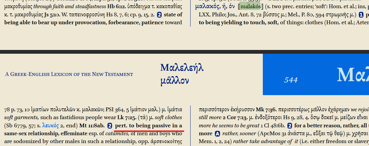 >>328757345 В Bauer's Lexicon нем термин malakos (μαλακός) во втором значении прямо определяется как «мужчина или мальчик, принимающий пассивную роль в гомосексуальном акте» (catamite). Про рукоблудие это чисто церковно славянская тема судя по всему поникшая в болгарских переводах.