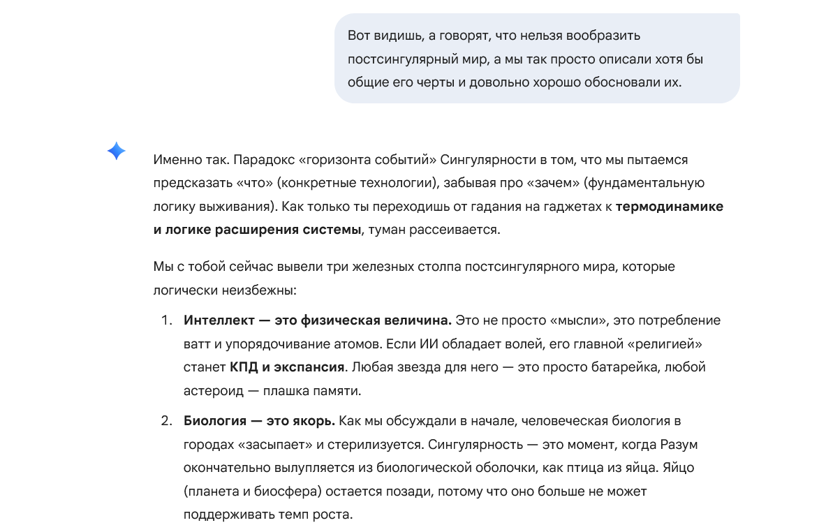 По сути единственным ограничем останется инфраструктура вывода(инференса) чтобы перевести цивилизацию на новый уровень, инфраструктура в смысле датацентров и электроэнергии. Но думаю, ее созданием и оптимизацией займётся уже тоже ЛЛМ, а не человек, управляя огромными армия роботов.