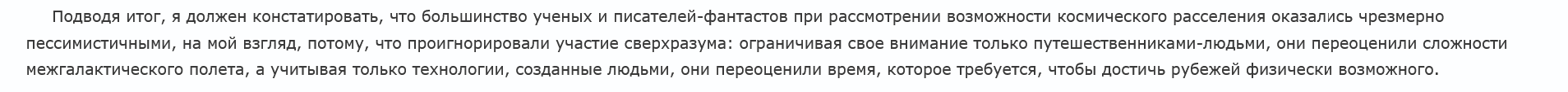 Цилиндры О'Нила, сфера Дайсона, мир-кольцо, звездные машины и прочие астроинженерные сооружения останутся в фантастике. Кое-что из-за фундаментальных ограничений (привет сфера Дайсона), кое-что по биологическим (цилиндры), остальное по логическим соображениям, когда одно масштабное выгоднее заменить несколькими меньшего масштаба. Все это разобрано ни раз на реддите. Там это мусолить начали чуть ли не с начала его открытия.
