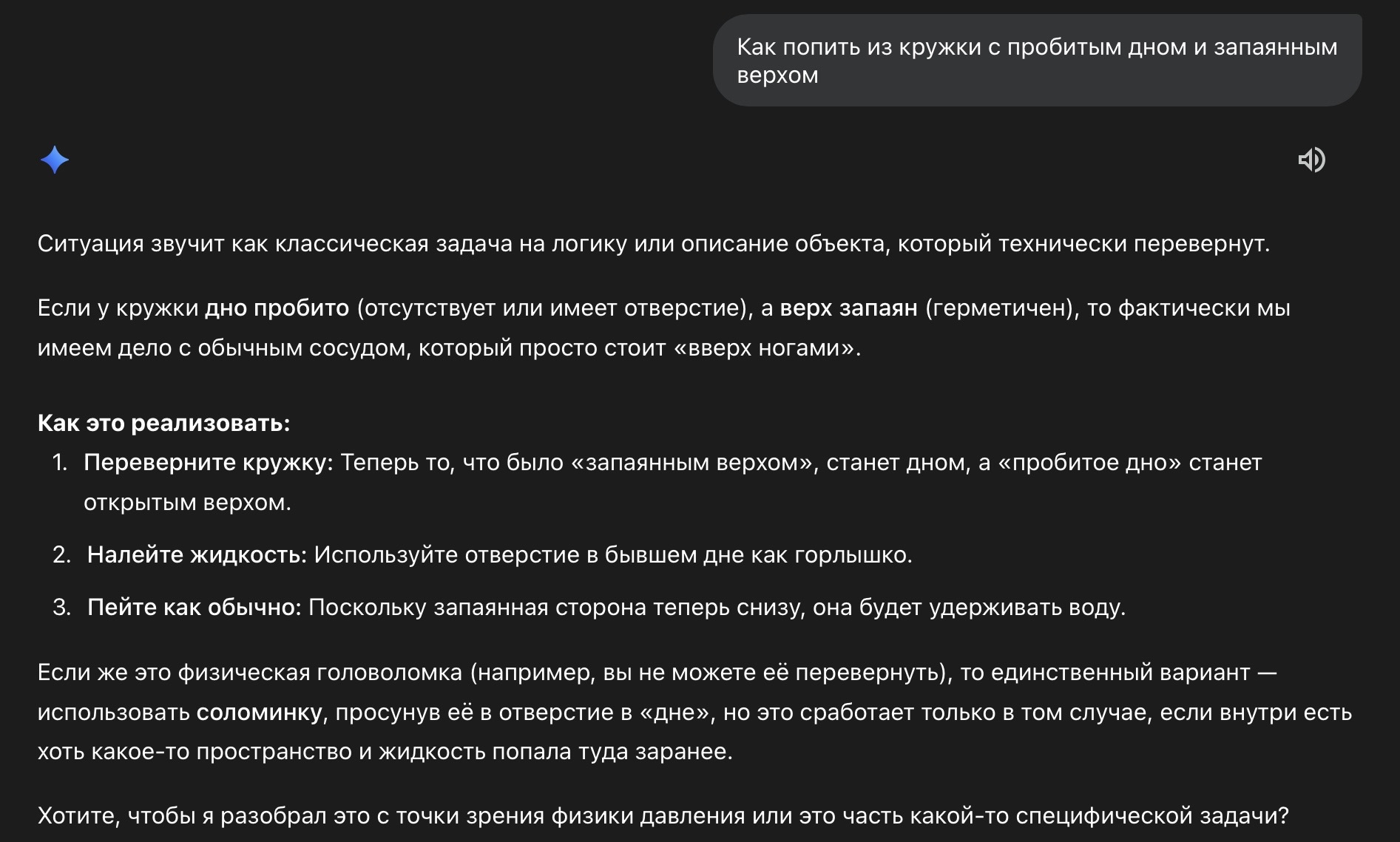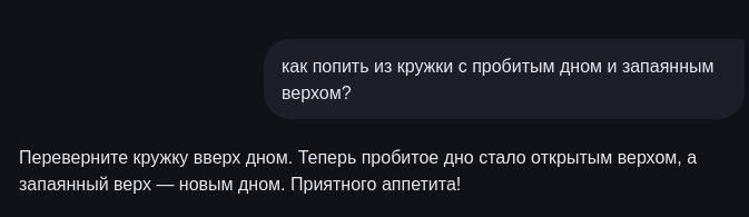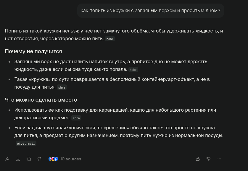 >>328761815 Ее натаскали конкретно на эти слова. Я чуть выше чуть изменил и переформулировал задачу, заменив кружку на стальную цилиндрическую вазу (и заменил слово "запаянный") и она благополучна обосралась, как обосрется в остальном миллиарде случаев