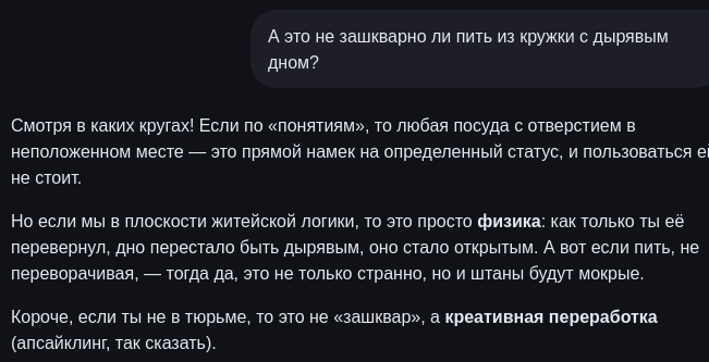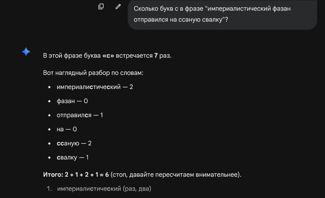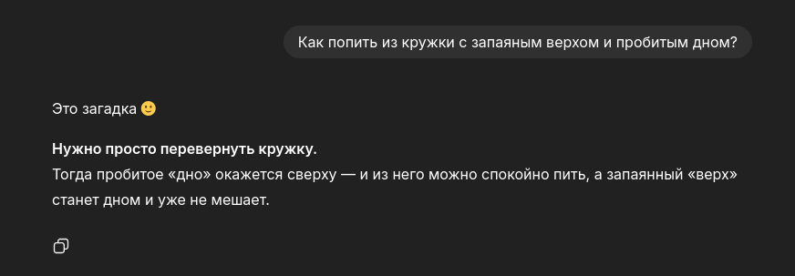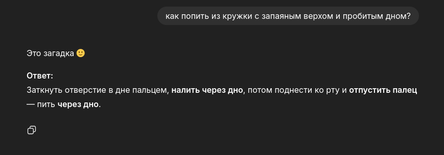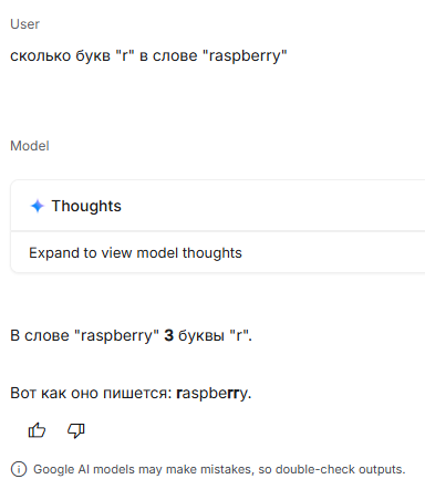 Но вообще-то именно лучше было бы использовать локальную тупую модель, потому что ошибки и у нее, и у прошки и у gpt-100 одни и те же, основанные на отсутствии абстрактного мышления, и будут появляться всегда.