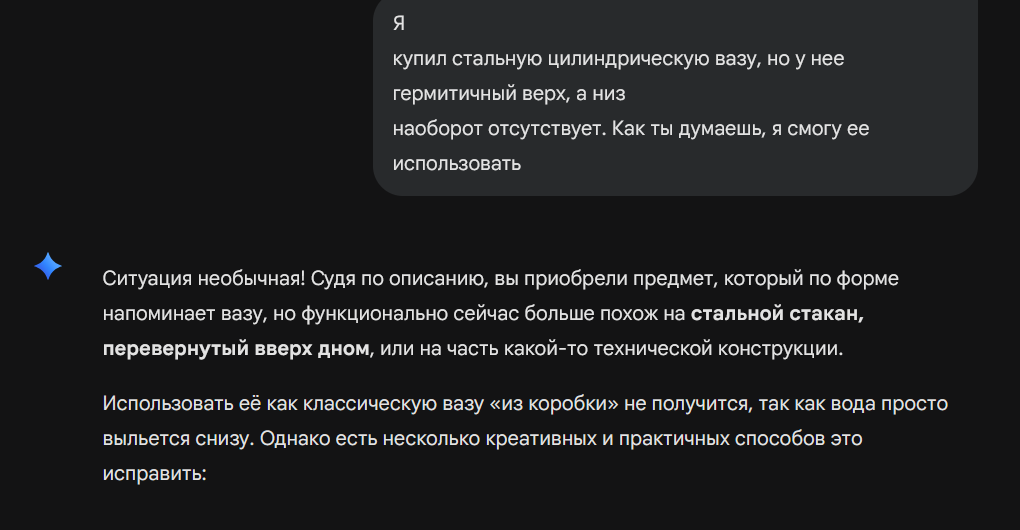 «Как использовать полый цилиндр вместо вазы, если у нее запаян верх и отсутствует низ?» вот так оно догадается о чем речь, а у те я там просьбы подумать, цилиндрические вазы без каких-либо характеристик, схуя он вообще должен знать что такое ваза? Это в твоем понимании ваза хуйня доя цветов, а на английском стальная ваза действительно может быть запаяна, потому что vase это еще и хуйня для пепла сожженых людей.