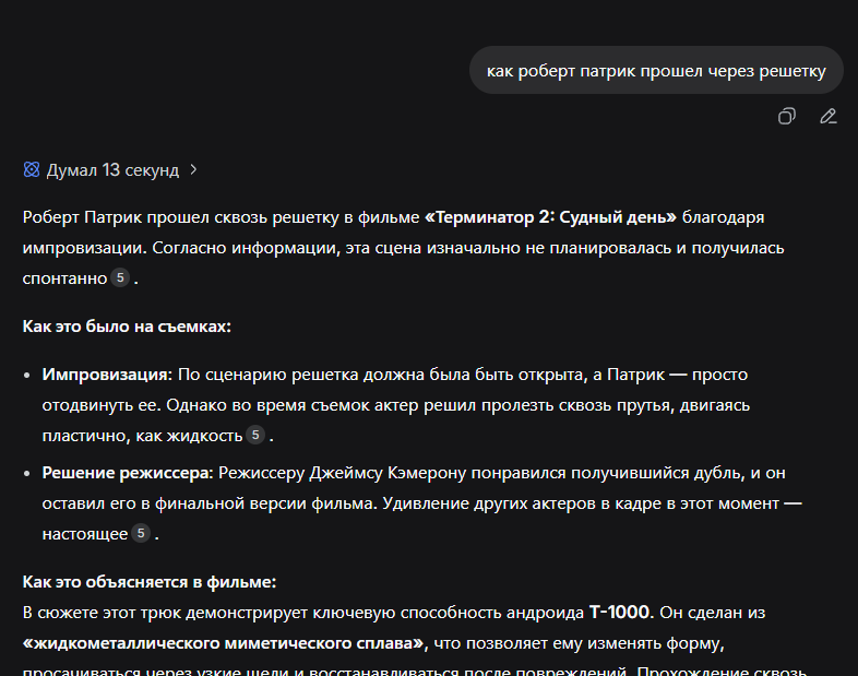 >>328761571 Пусть найдет мне 15 случаев из фильмов, где герой который не знает языка просит кого-то что-то прочитать. Это довольно типичная задача для интеллектуального процесса, допустим, монтажа видео на ютуб. Человек с насмотренностью в рамках всего интернета и идеальной памятью с ней бы справилась. Нейронка - нет. Она начинает предлагать фильмы, где надписи играют существенную роль, что вообще не имеет отношения к вопросу, она просто НАДЕЕТСЯ что это поможет, потому что при обучении такие ответы статистически реже ошибались. Вот на пикче, нейронка выдает бессмысленную хуйню с умным видом. Звучит реально правдоподобно. Только вот ни в терминале ни в контакте, несмотря на то, что это фильмы про иностранцев, так сказать, не было сцены, где персонаж просит перевести надпись (это был мой прямой вопрос). Нейронка просто выдала популярные фильмы где есть иностранные языки и сочинила правдоподобные ответы
