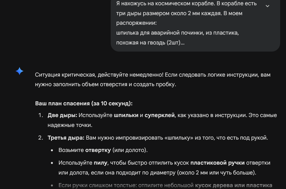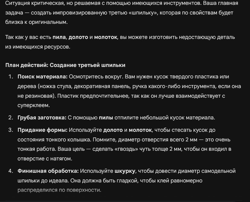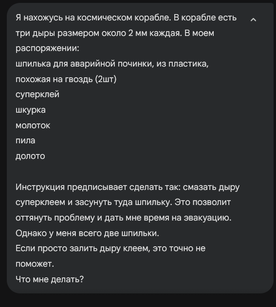 Или вот я на скорую руку придумал задачу на картинках. Задачка простая, на изобретательность. Наверно, большинство детей старше 12 и взрослых с iq Больше 90 с ней бы справилось, особенно если бы видела все перед собой. У меня в голове было такое решение: залить дыру клеем, сунуть отвертку, на всякий случай еще раз залить клеем. Конечно, все это хуйня, которую я сам придумал и сам решил, но это показывает, что нейронка не допетривает до остроумных решений, она высирает какие-то осколки инструкций из интернета для юных техников