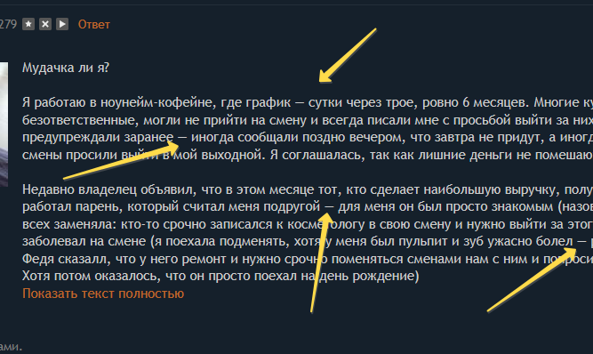- Ты неоднократно шла на подмены и честно выполняла работу, часто в ущерб себе (больной зуб, лишние смены). - Федя нечестно действовал (внес/симулировал покупки, ввёл в заблуждение коллег и владельца) и попытался переложить моральную ответственность на тебя. - Ты предупредила владельца и коллега; при неофициальной занятости право уйти при неудобном графике и ухудшении здоровья — твоё. - Требование отработать «обычно две недели» без официального договора и при условии, что ты уже сообщила — необоснованно. - Коллективная реакция и давление показывают плохую культуру труда, где ты не обязана жертвовать здоровьем ради чьих‑то долгов или нечестных манипуляций.