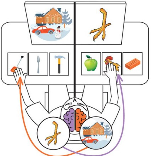 >Пациент замечает картинку с курицей и говорит: «Вот эту! Я видел куриную лапку». При этом его левая рука сама собой показывает на картинку с лопатой (согласитесь, адекватный выбор, если тебе показали кучу снега). Но пациент не осознаёт, что видел снежный пейзаж.