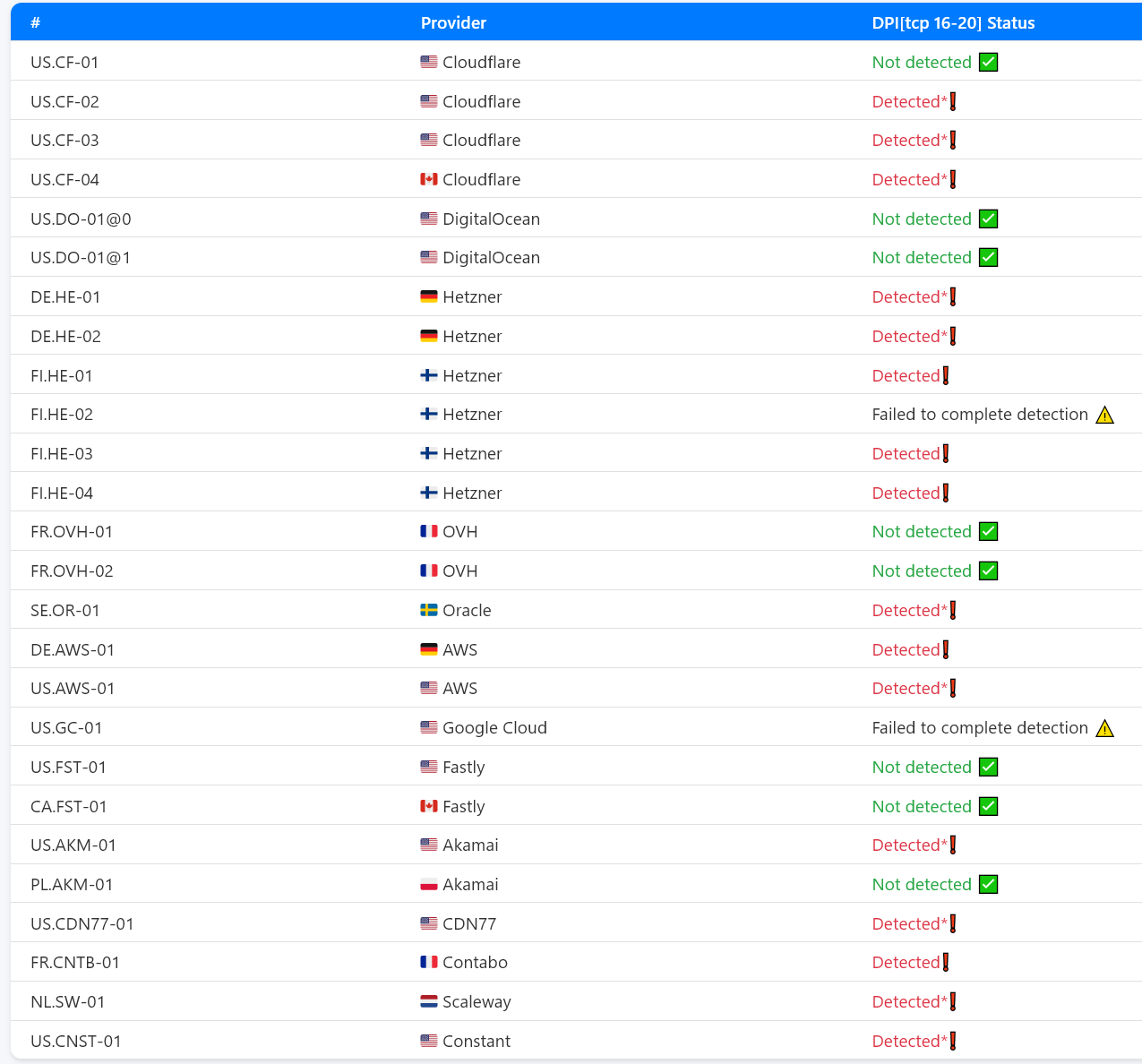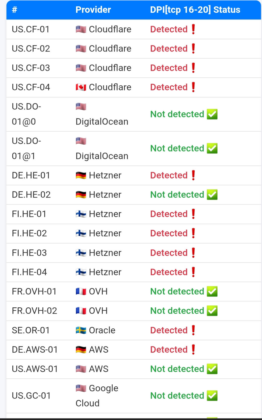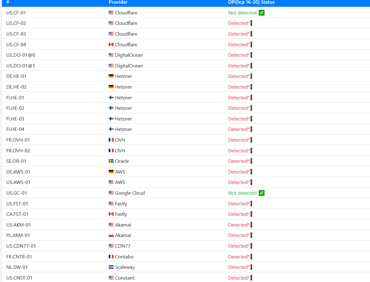 >>328811298 Тогда действительно странно. Блокировку после первых 16 килобайт трафика для болшей части диапазонов Cloudflare, Hetzner, OVH, Akamai и кучи других хостеров и CDN раскатали по всем крупным провам еще тогда.