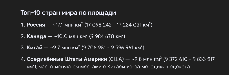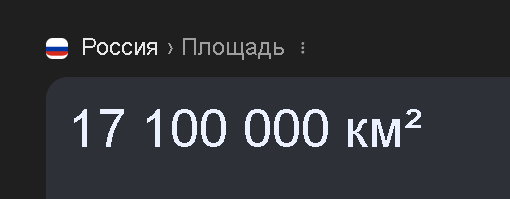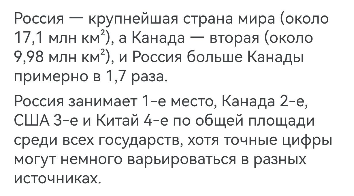 >>328803147 (OP) Ну да, три Африки и пять Америк на территорию России не уместится, и что? По сравнению с другими странами она все равно самая большая... Хотя большая часть этой территории непригодна для проживания, зато там есть ресурсы.