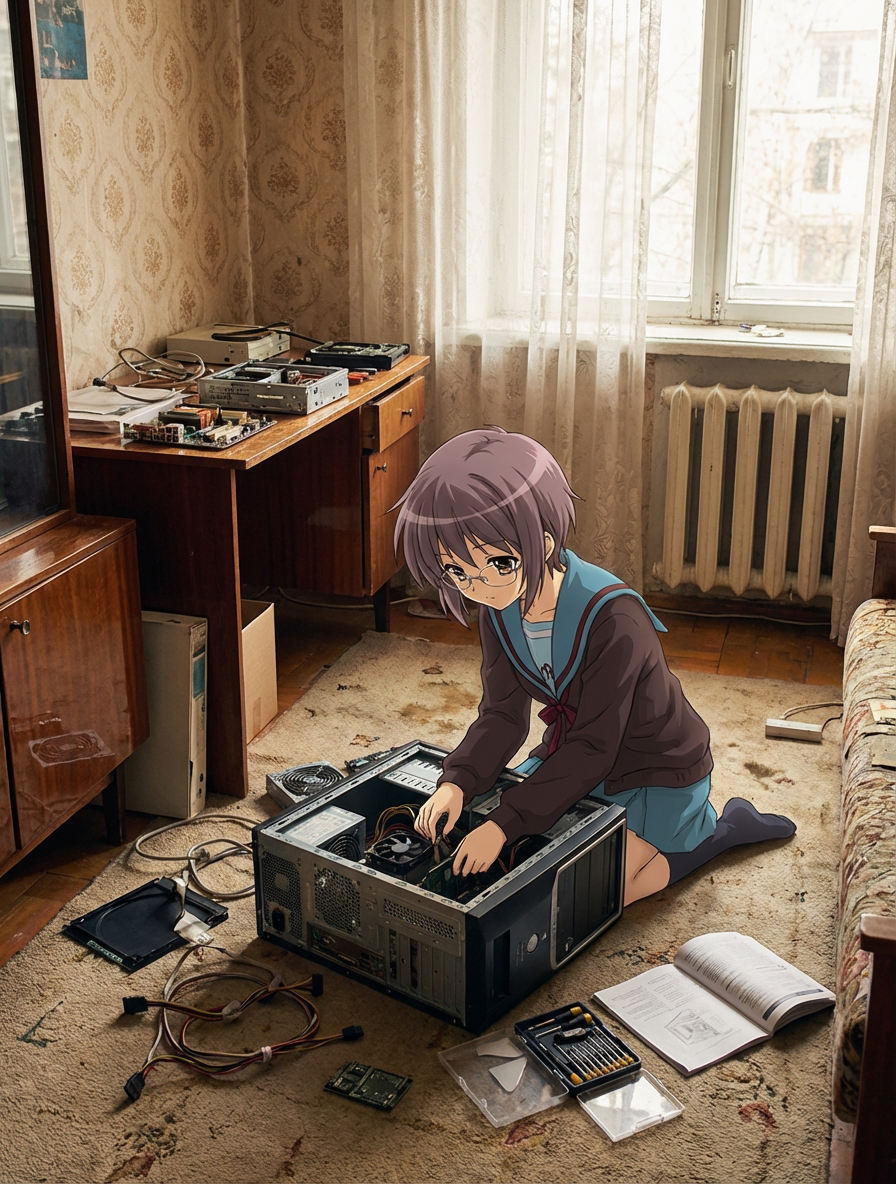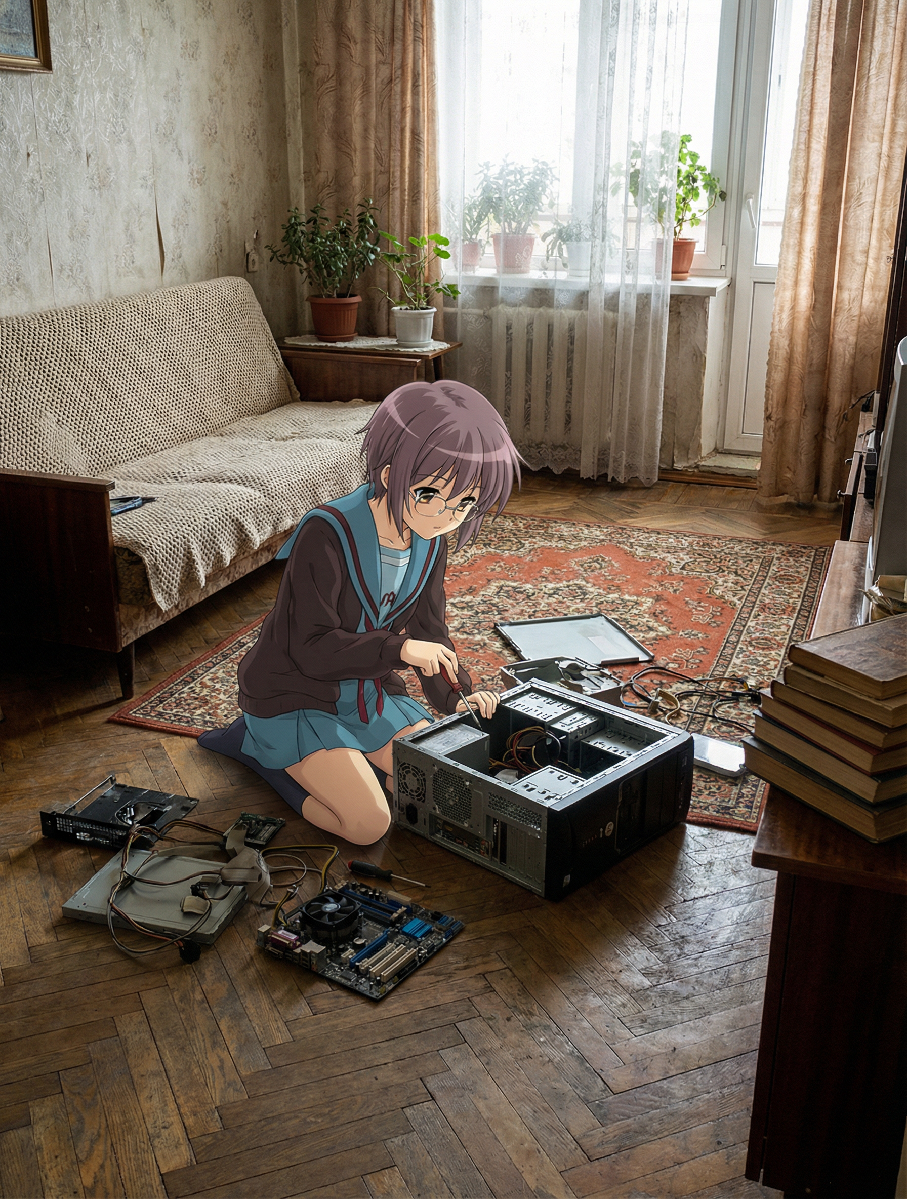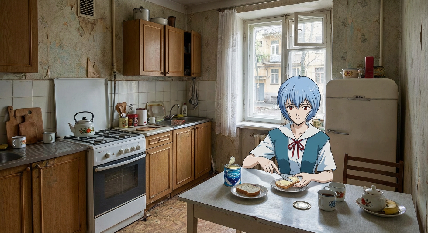 >>328940663 Я куки нюканул и кеш. Щас дословно вспомню: Аянами Рей сидит за столом на кухне в хрущёвке и мажет сгущёнку на хлеб. Аянами Рей в стиле аниме, кухня в реализме. >>328941188 Не, я просто всратый промт выше написал, и она сама поняла. Ничего больше не уточнял и картинки не прикреплял.