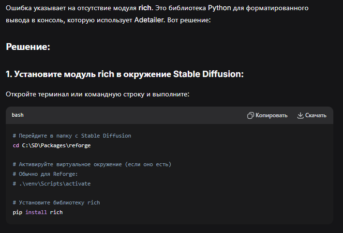 >>328853340 Скрипт !adetailer.py пытается импортировать библиотеку rich для улучшенного вывода текста, но эта библиотека не установлена в вашем окружении Python.