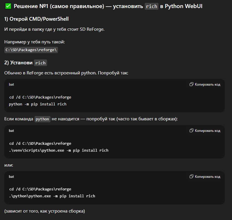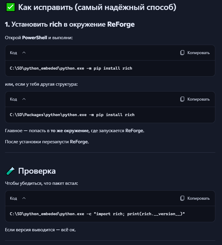 Error loading script: !adetailer.py Traceback (most recent call last): File "C:\SD\Packages\reforge\modules\scripts.py", line 533, in load_scripts script_module = script_loading.load_module(scriptfile.path) File "C:\SD\Packages\reforge\modules\script_loading.py", line 13, in load_module module_spec.loader.exec_module(module) File "<frozen importlib._bootstrap_external>", line 883, in exec_module File "<frozen importlib._bootstrap>", line 241, in _call_with_frames_removed File "C:\SD\Packages\reforge\extensions\adetailer\scripts\!adetailer.py", line 15, in <module> from rich import print # noqa: A004 Shadowing built-in 'print' ModuleNotFoundError: No module named 'rich'