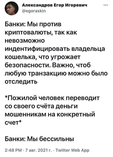 >>328923947 Против крипты только Центрабанк. В Т-банке можно биток купить прямо в приложении, например. А то, что мошонку не могут найти, так мошонка принимает меры, он же не идиот. Старается чтобы бабка отправила налик через курьера или через cash-in, или принять на СБП дропа и тут же обналичить в банкомате или уйти в крипту - это уже на совсем худой конец. Но даже в этом случае ты только дропа выявишь, а он обычный чел, который даже не вкурсе, что на него карта открыта. Такая же бабка, которая передала тому же мошонке данные госуслуг и её как дропа изпользовали, чтобы карту на неё оформить. Это же очевидно.
