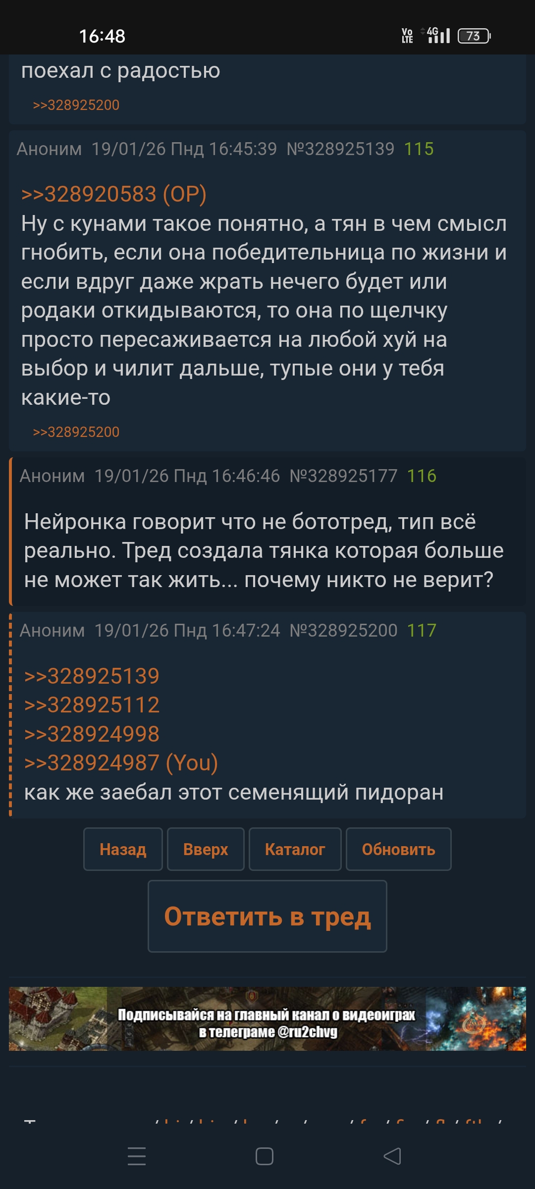 >>328924695 >>328925112 Просто ситуация её вполне устраивающая, вот и выёбывается. А как прижмёт... Знавал тнусов с ещё тех двощей, у которых дома была обстановка буквально как в сериале sosеди. С одной стороны с ними прикольно было общаться, очень много схожих интересов, особенно весело ловить корки с хтонического всж фона в скупике\дисике. Но ты прям чувствуешь, как она как бы в невзначай навязывается и прощупывает, уже записывая тебя в ёбыря-спасателя, и ОЧЁ проявляет инициативу к ирл. Я вот грил, что я сыч и живу с родаками. Но от них постоянно слышал прощупывание, мол, а как сидишь 24\7, а почему на РАБотку не гонят, а почему тихо всегда?! Но мне приколы в виде выпердыша из всж семейки тут не нужны, поэтому я морозился. А они, видимо пынямая всю тщётность своих попыток - потихоньку сливались переключаясь на кого-то другого.Вполне успешно, кстати.