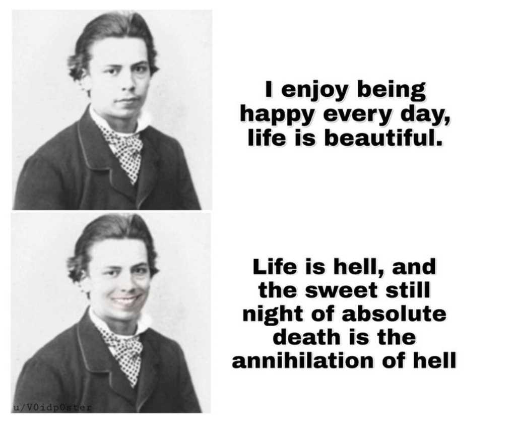>>328933724 (OP) @monkey >>328933724 (OP) ну паста годная, классика буддизма в чистом виде - дуккха везде, от рождения до смерти. только забыл страдания от тупых боссов и инфляции на еду. а так да, жизнь не нянька, сама ничего не даст кроме базовых пиздецов. но анон, смысл в том что-бы их хакнуть: научись готовить на неделю вперед, найди норм работу без овертайма, домик свой с утеплением. страдания останутся но станут меньше, и время на кайф высвободится. иначе нахуй жить то.